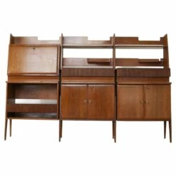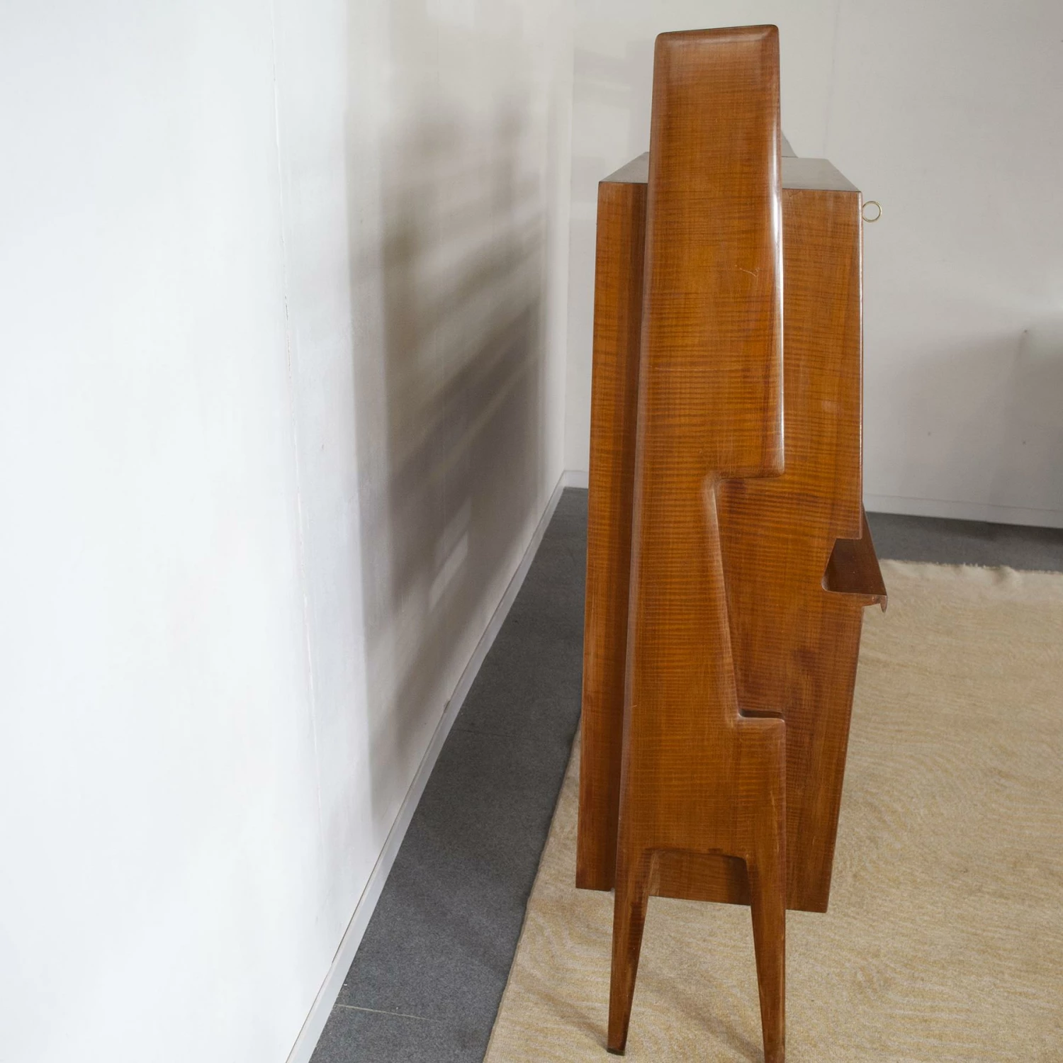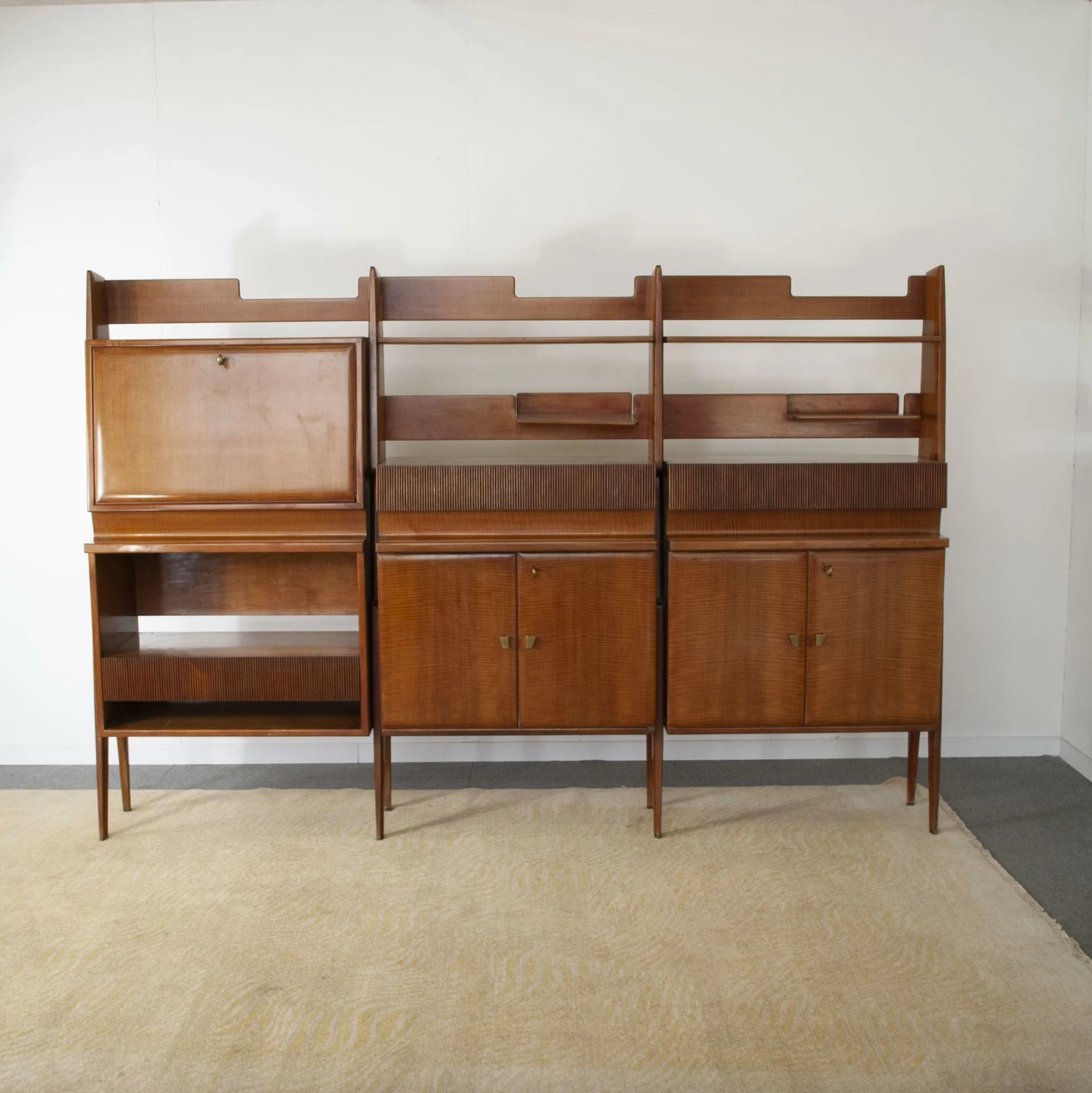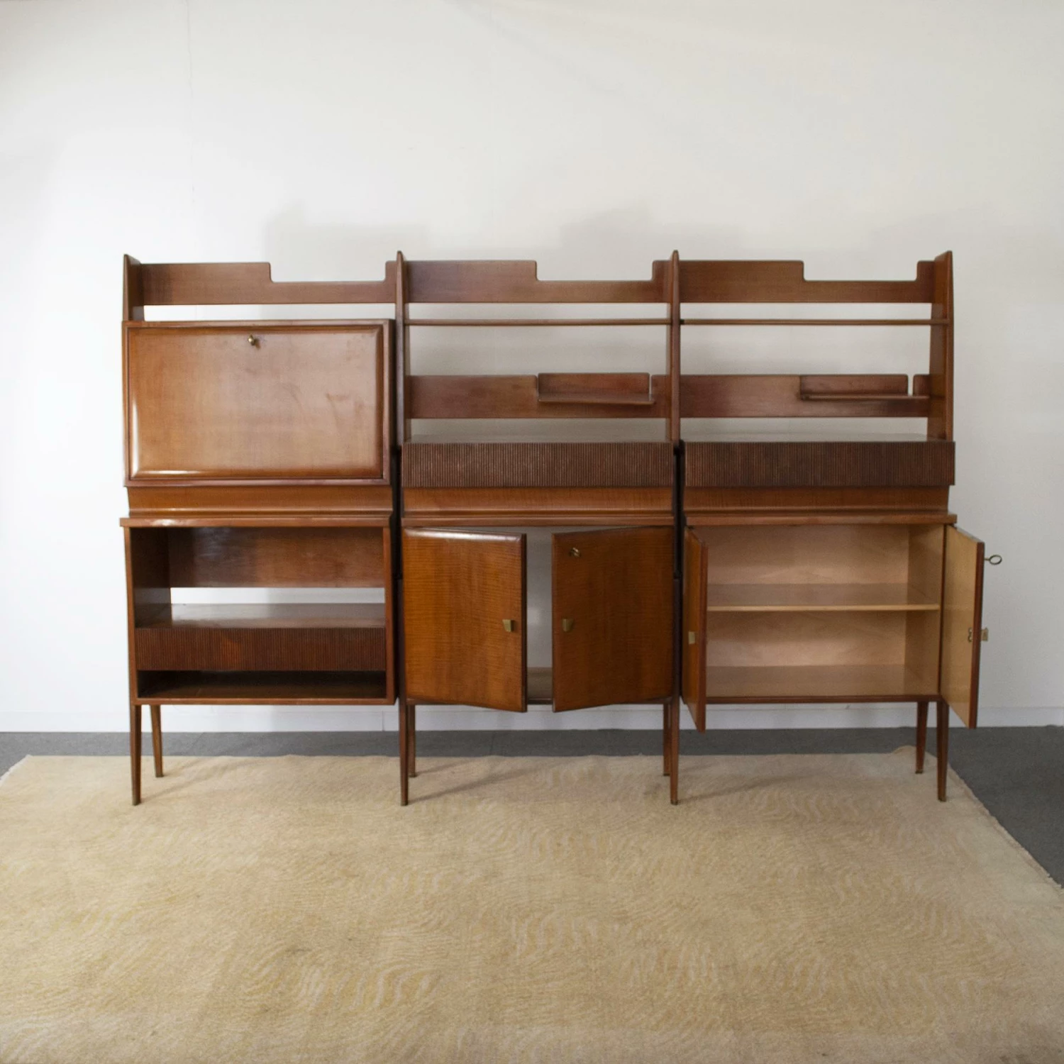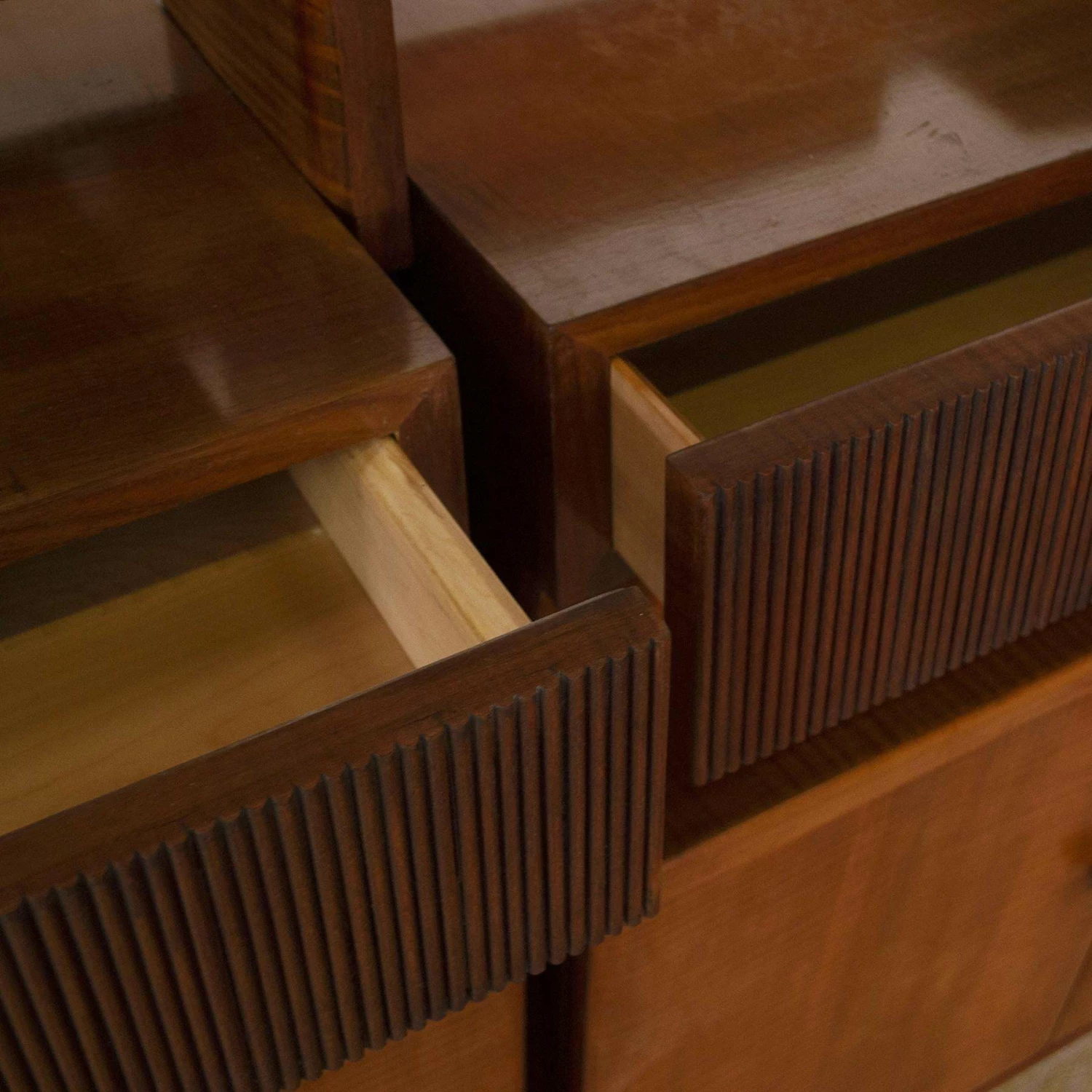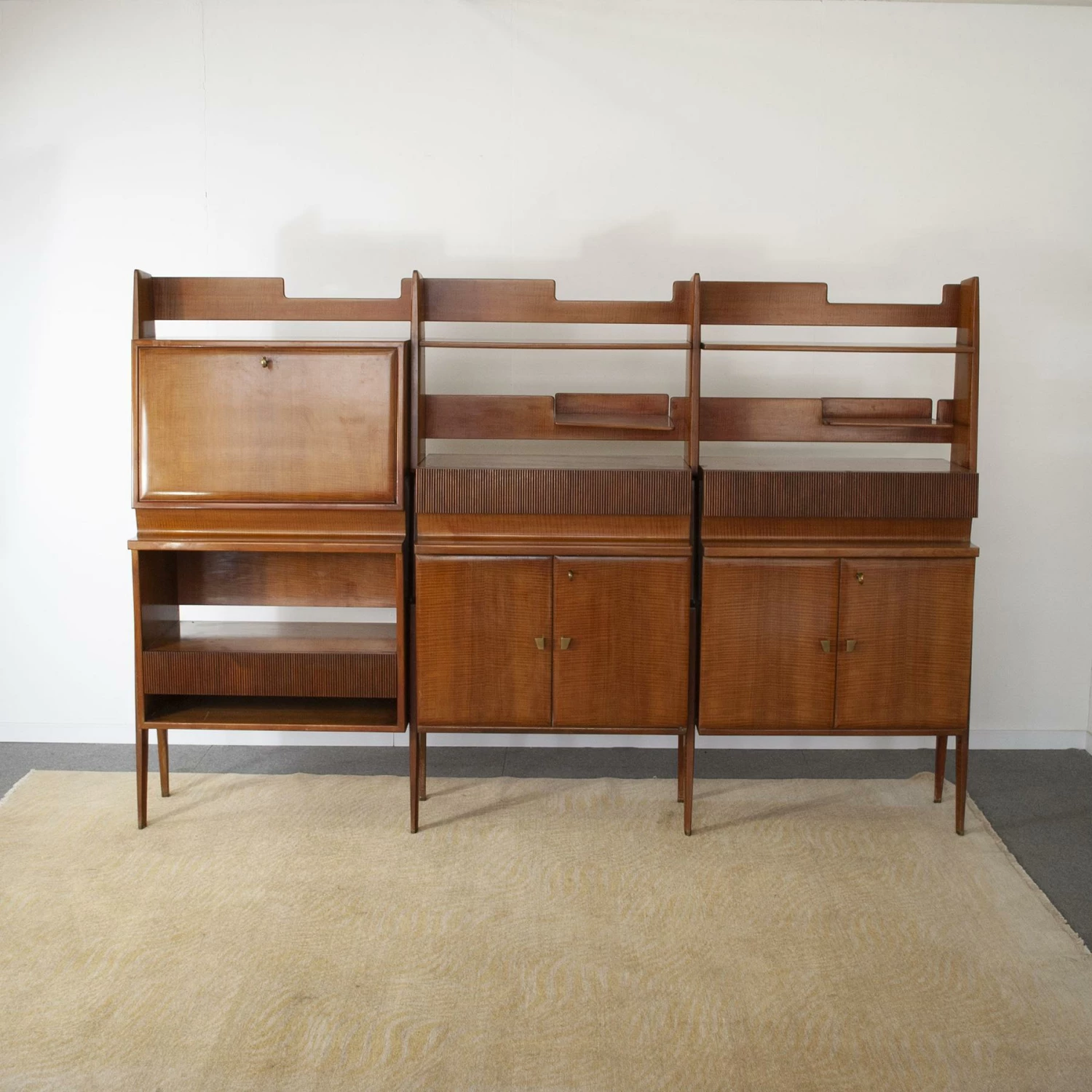 The furniture by Vittorio Dassi (1893-1973), made in the 40s and 50s, are distinguished by the choice of precious woods such as rosewood, cherry, ash and walnut, often decorated with inlaid panels and crystals signed by great glass masters. Elegant in design without losing functional quality, its furnishings can be compared to the refined style of Gio Ponti, to whom Vittorio was linked by important collaborations after taking over from his father in the Dassi Mobili Moderni company in Lissone. In fact, one of the most important projects of the factory is the creation of the furniture in the rooms of the Royal Hotel in Naples, designed by Ponti in the mid-1950s, a period that marked Dassi’s turning point towards more schematic forms and teak wood. for the production of modular furniture.