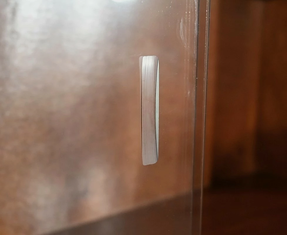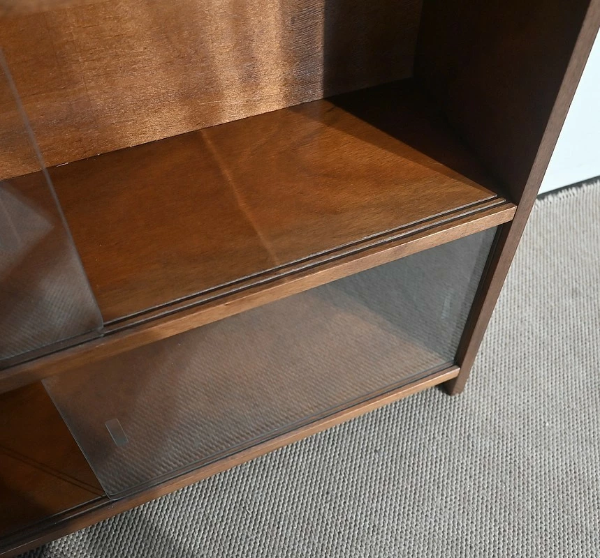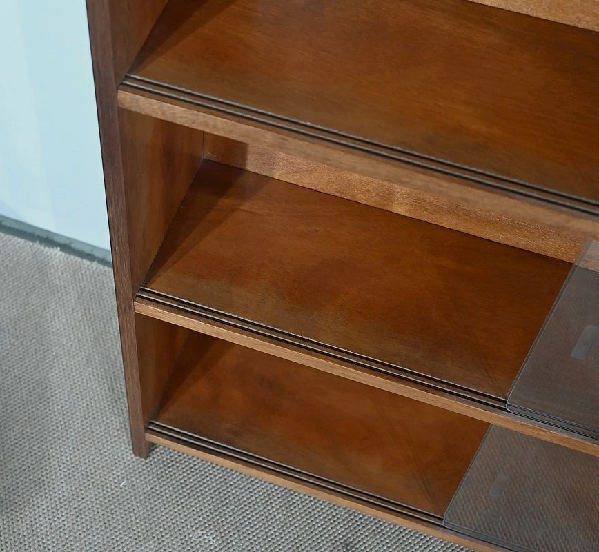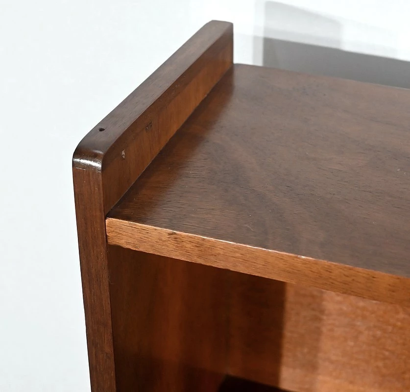 This vintage piece of furniture has a sober line and substantial storage space. The sliding windows, all present, each have an engraved notch.