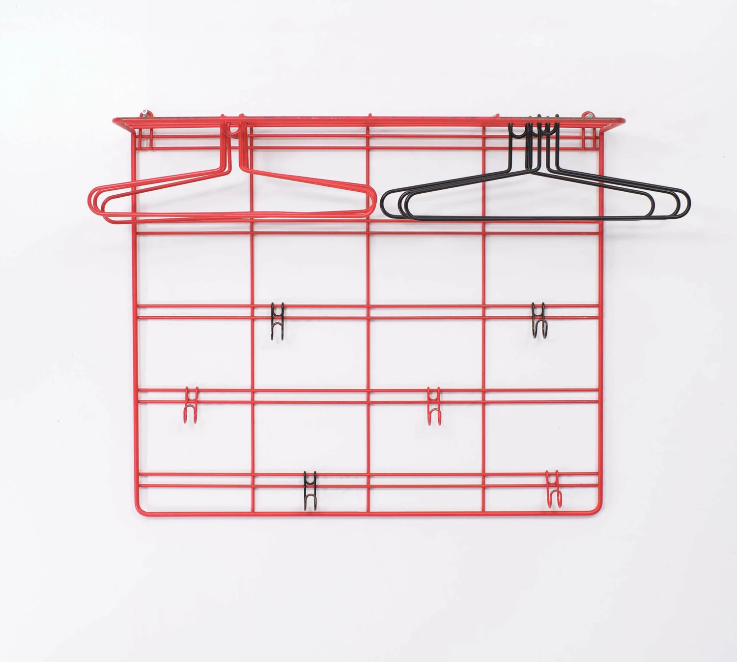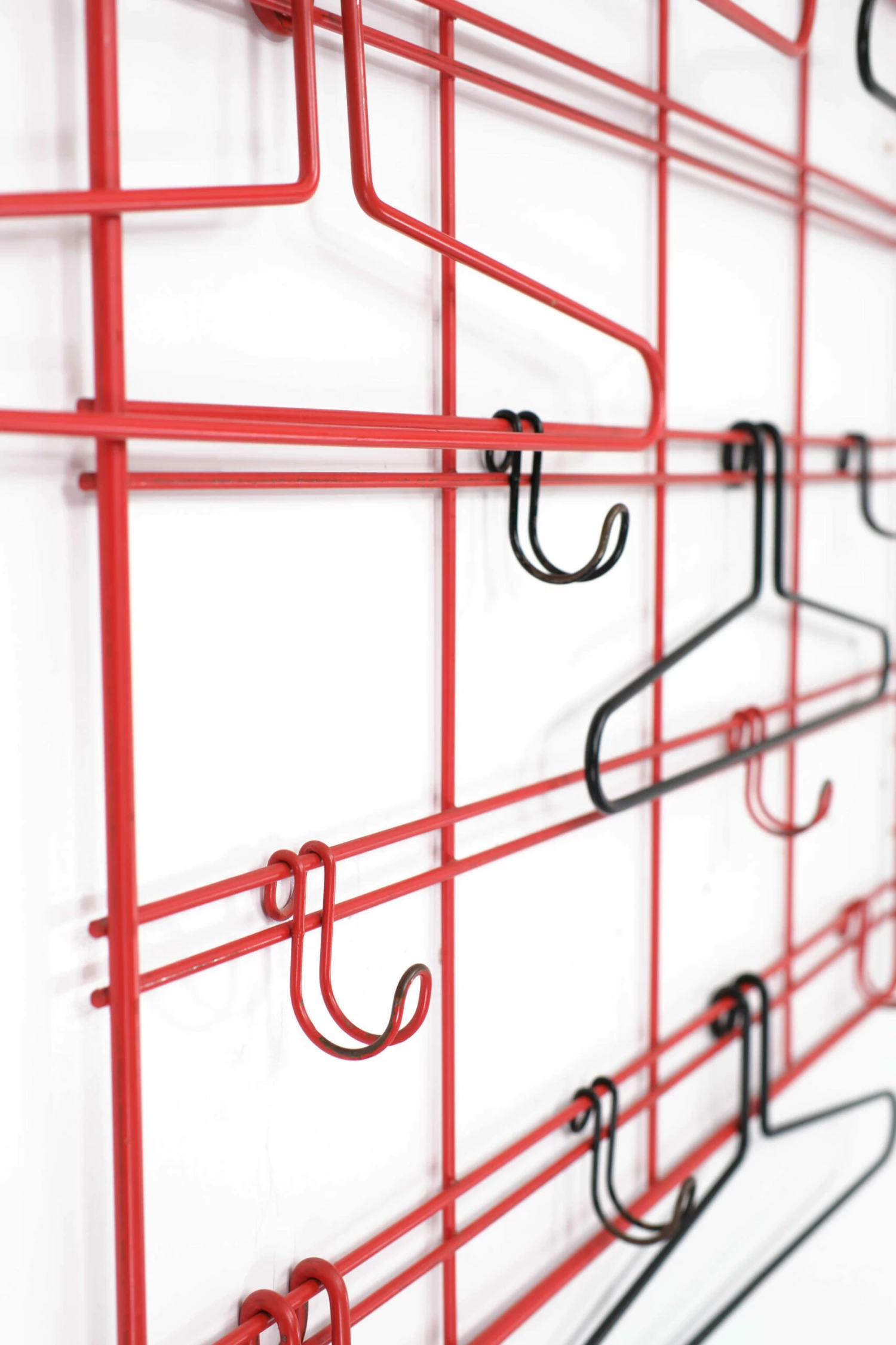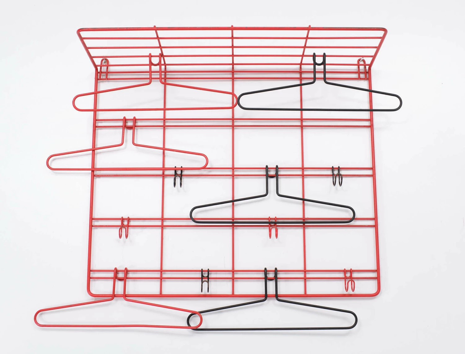 Remarkably this set is still complete comes with the 6 hooks and the 6 hangers .In Black and Red color . Made of Iron . Great looking piece . Normal wear and tear .