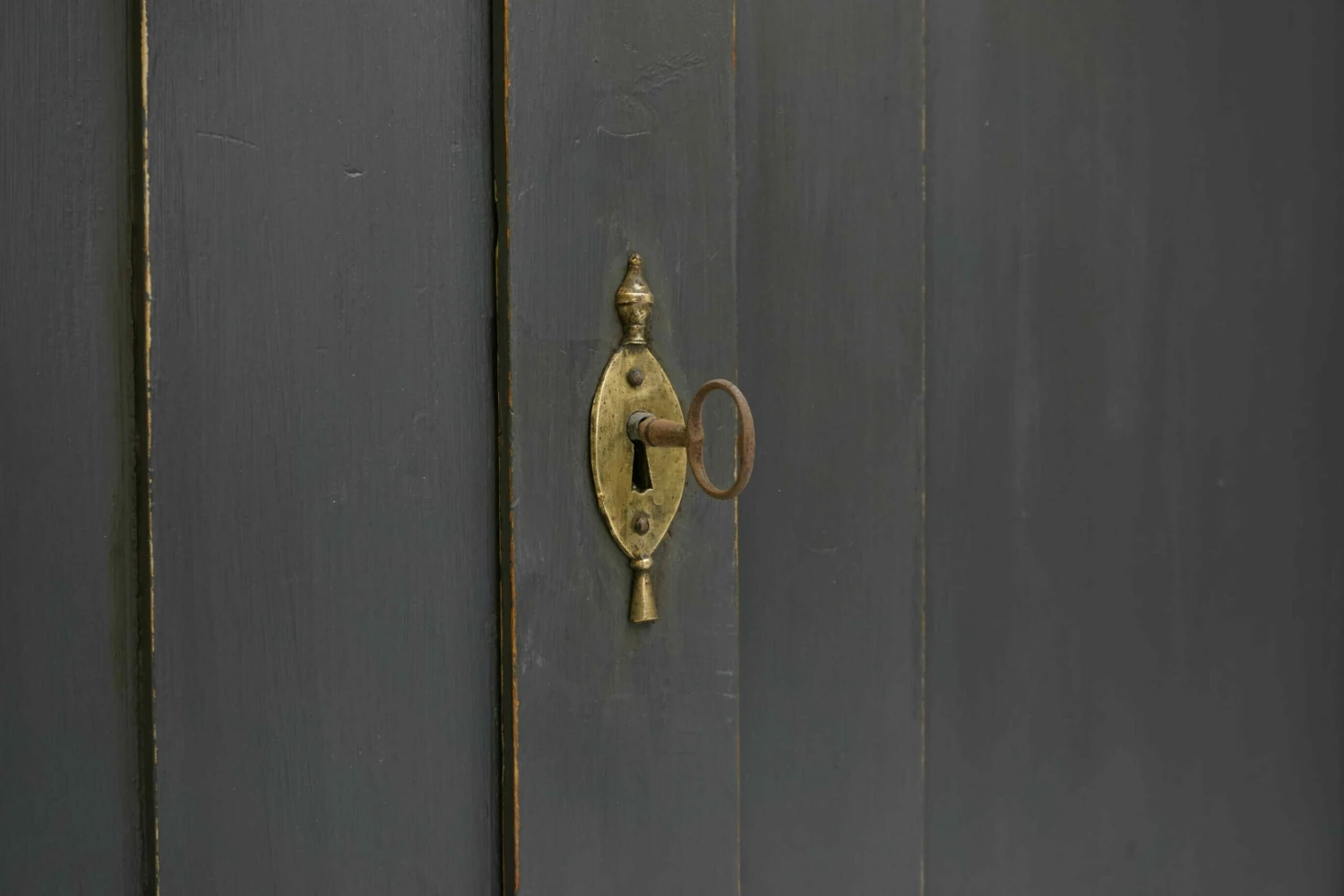 Painted Continental housekeeper’s cupboard. Painted interior with three shelves. Working lock with key and metal escutcheons. This cupboard flat packs for easy transportation and access into awkward spaces. It is easy to assemble and then provides sturdy storage space. Dimensions are to the largest external edges.