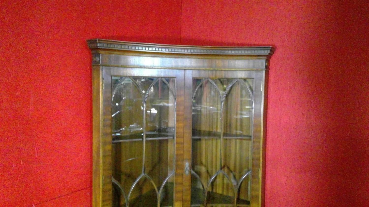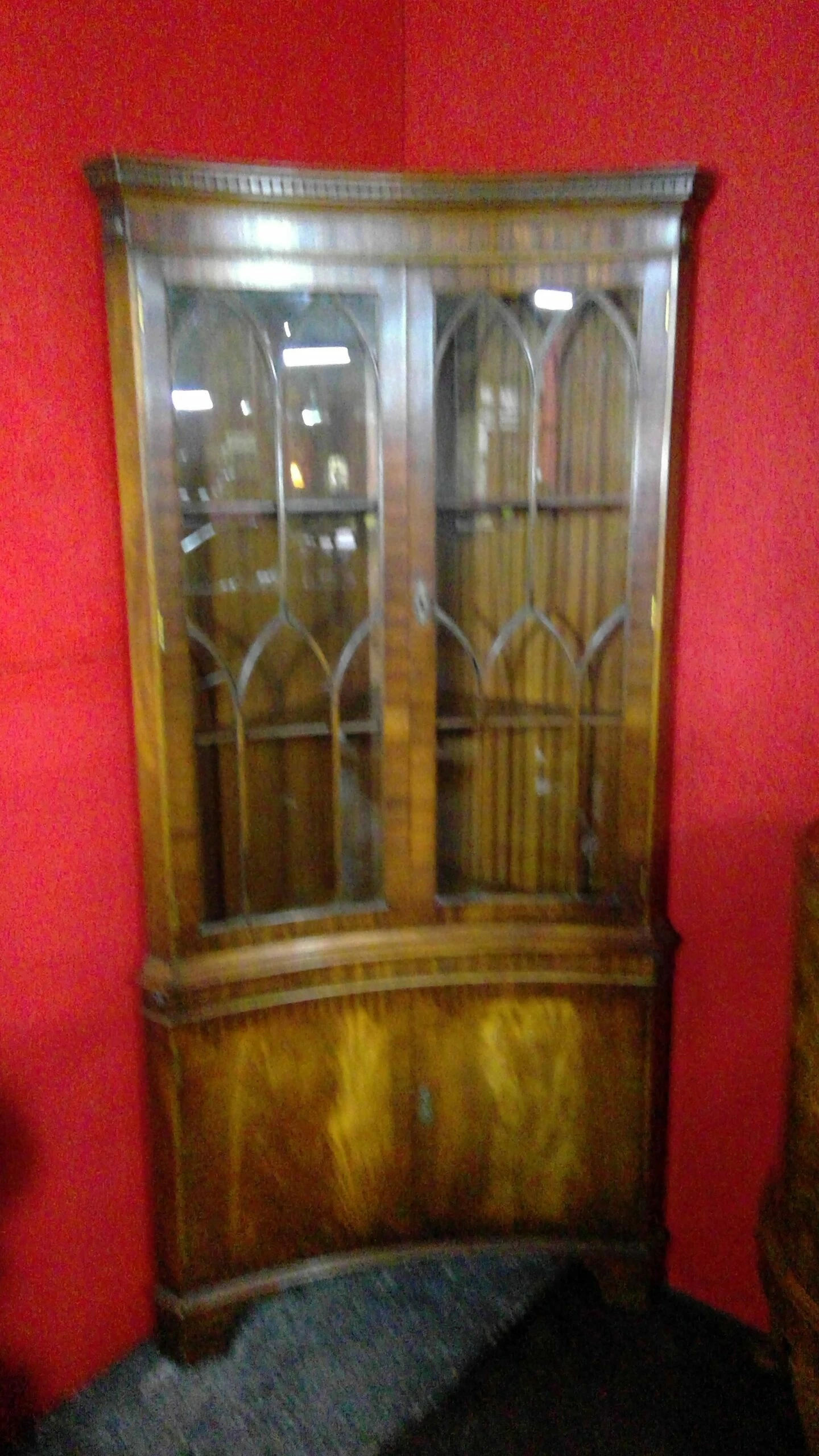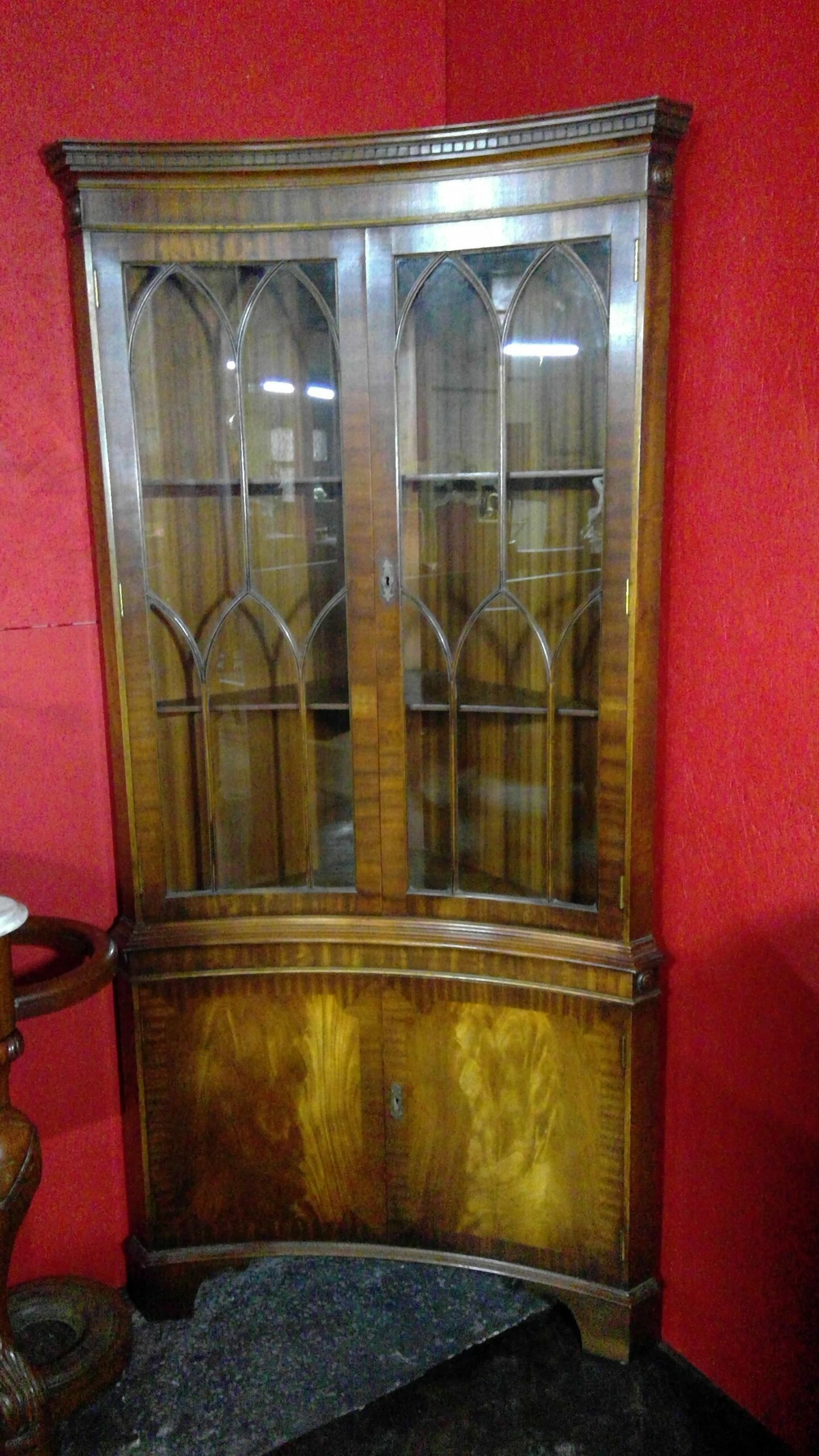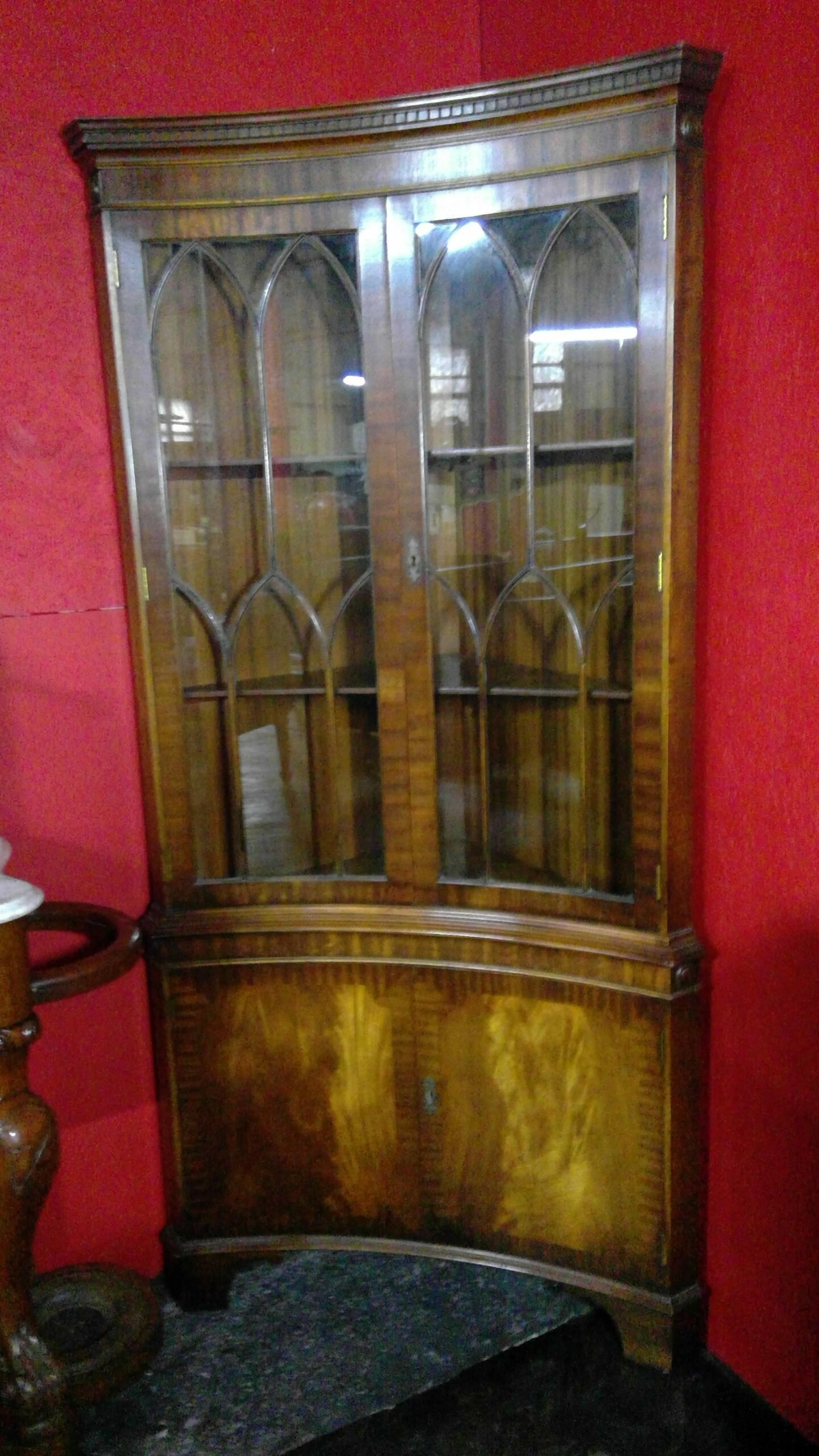 A fine quality mahogany double corner cabinet with gothic shaped astral glazed top with fitted shelves enclosed,the cupboard below is also fitted with shelves.terminating on bracket feet.keys supplied.