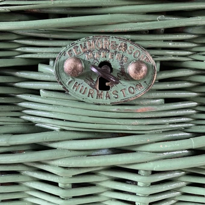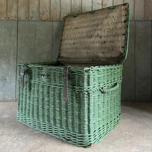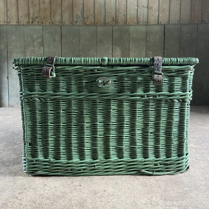 A great big early C20th English country house brass bound wicker laundry basket in later, but old, green paint