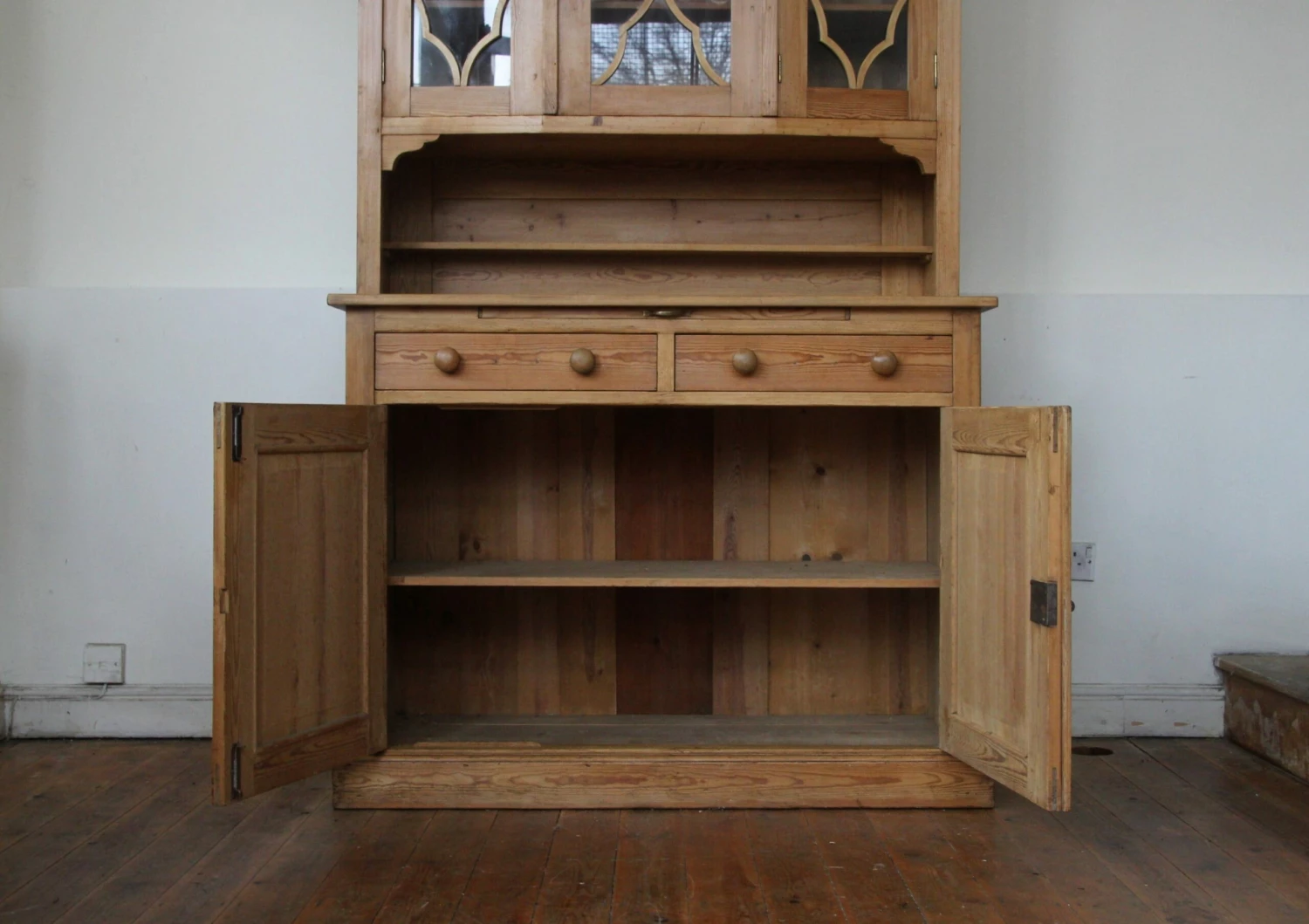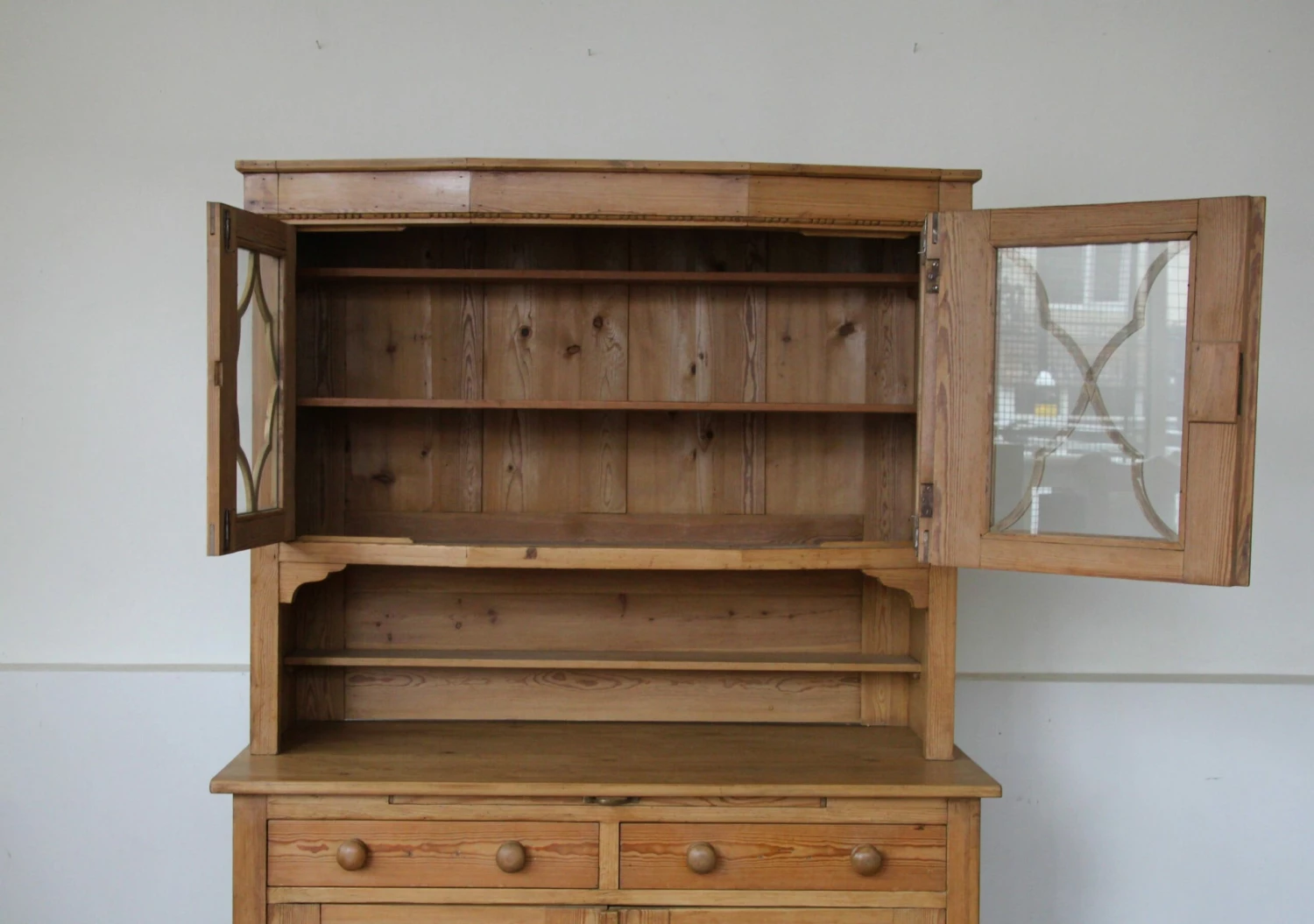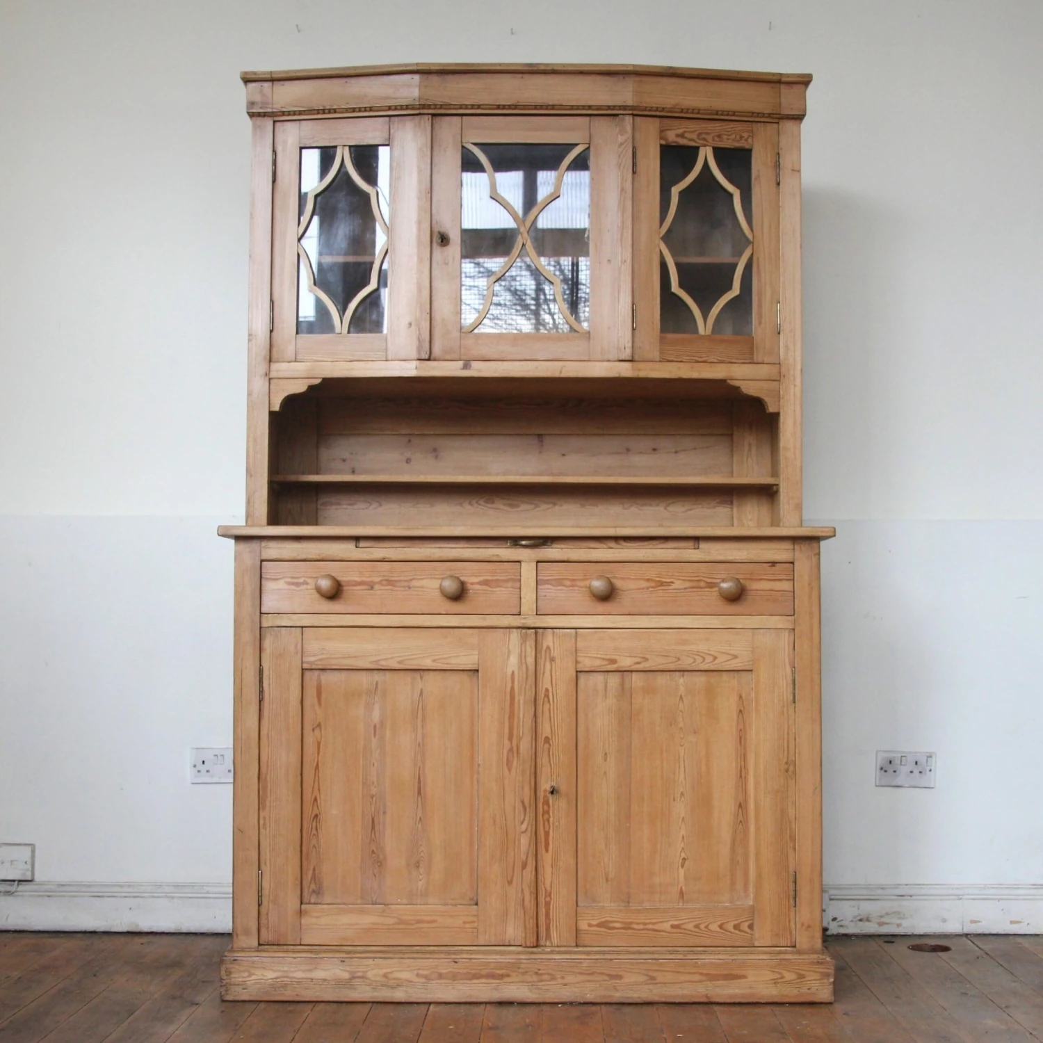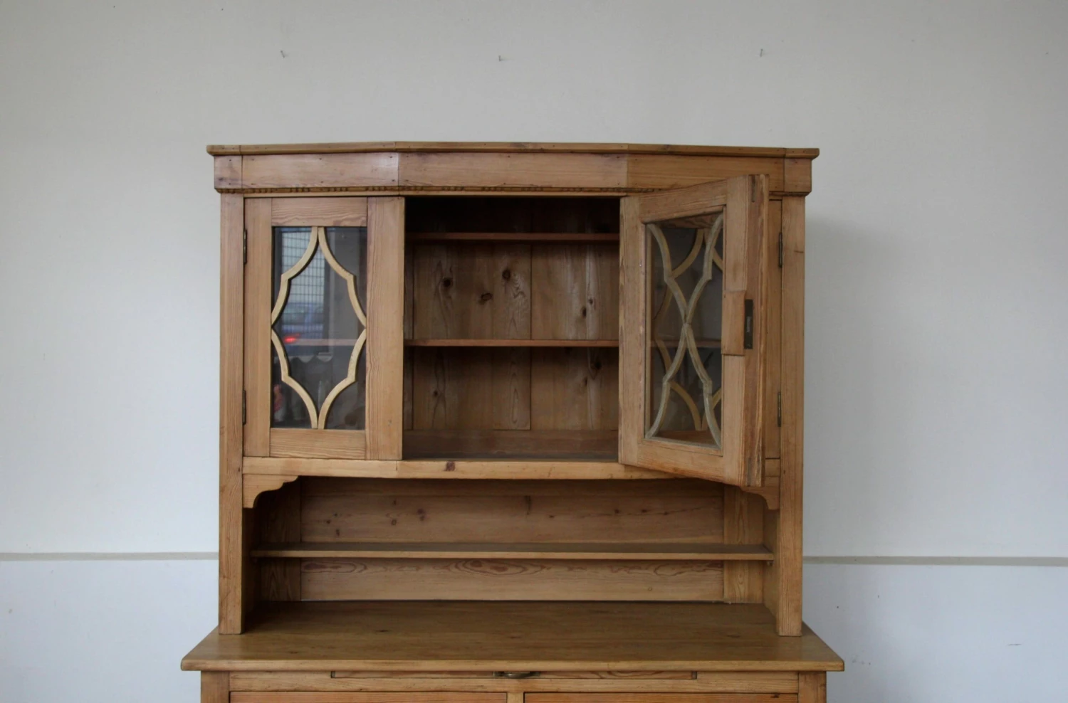 A large continental early 20th century stripped pine kitchen dresser with glass doors.