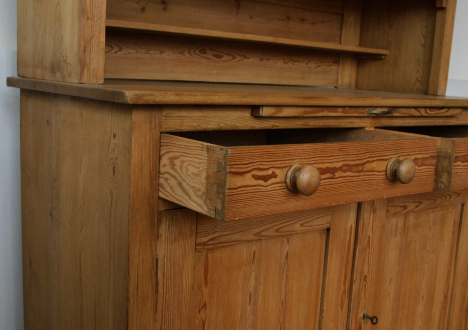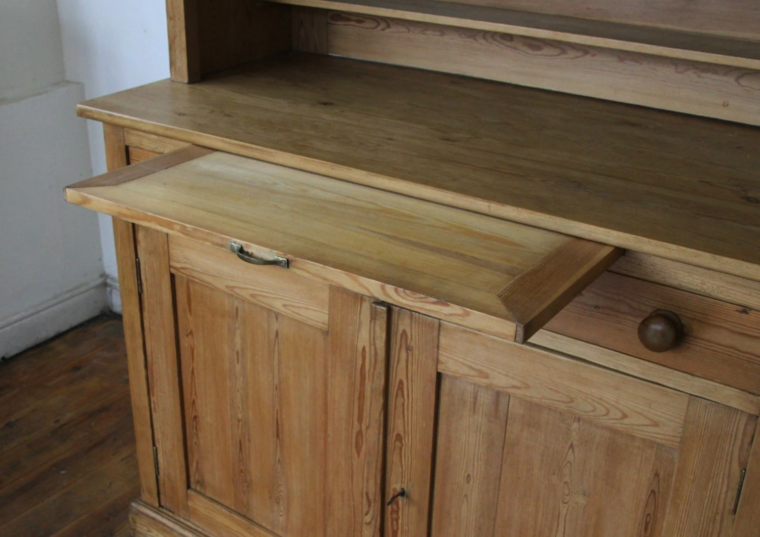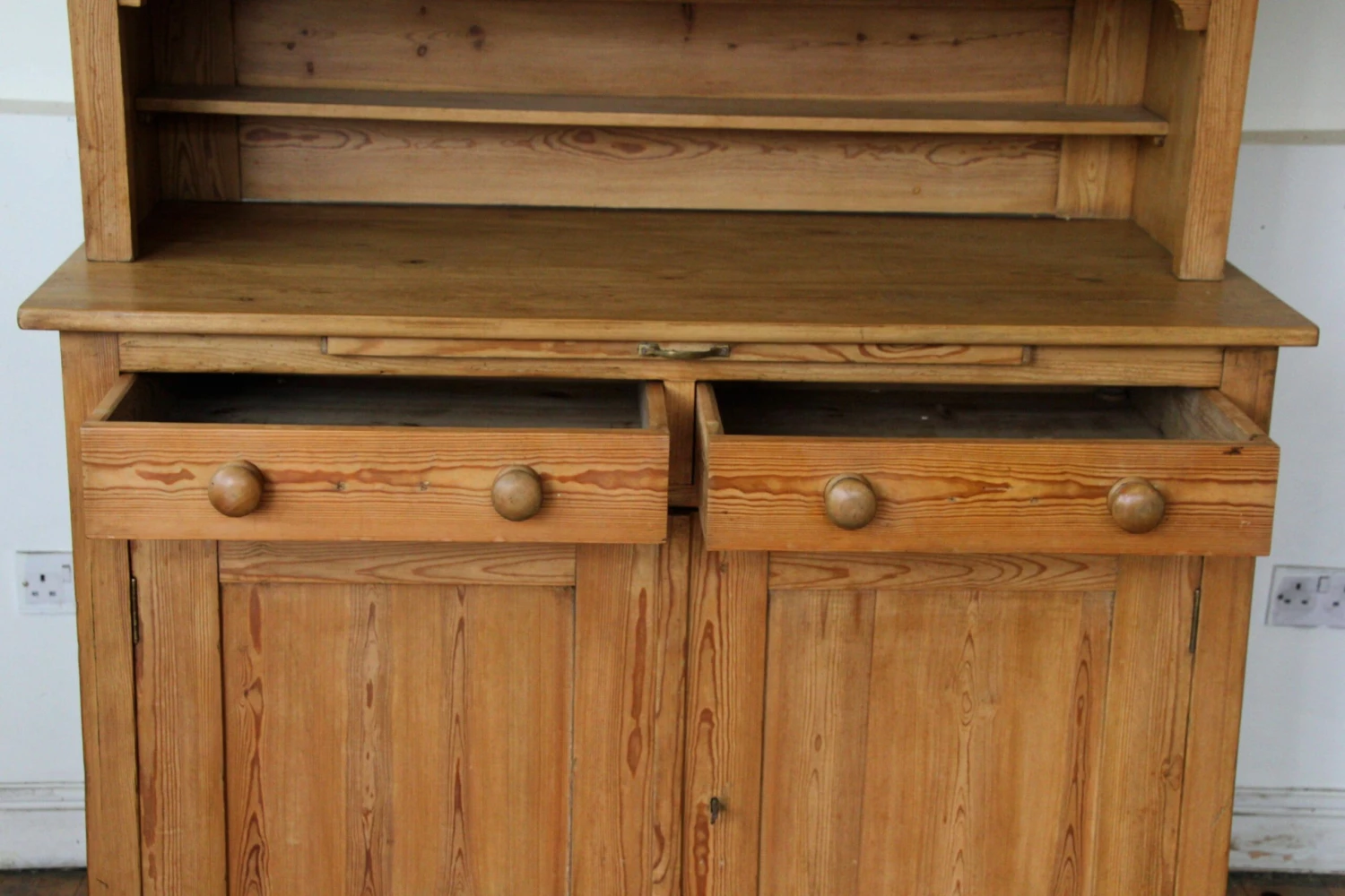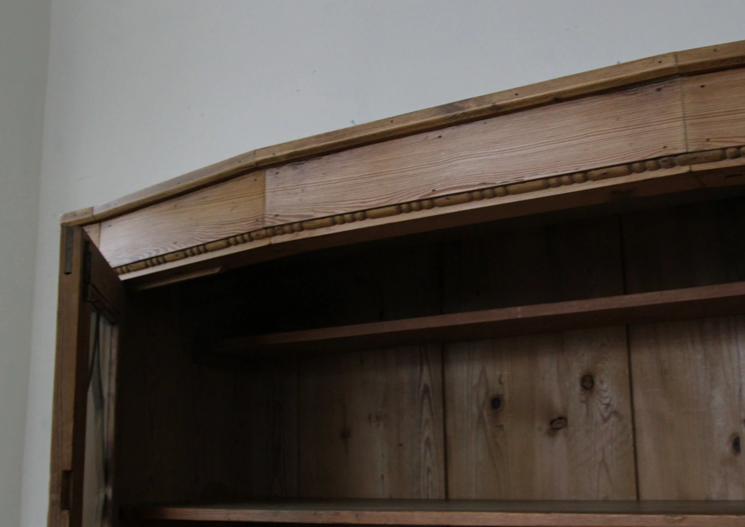 A large continental early 20th century stripped pine kitchen dresser with glass doors.
