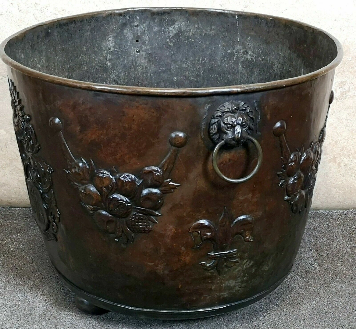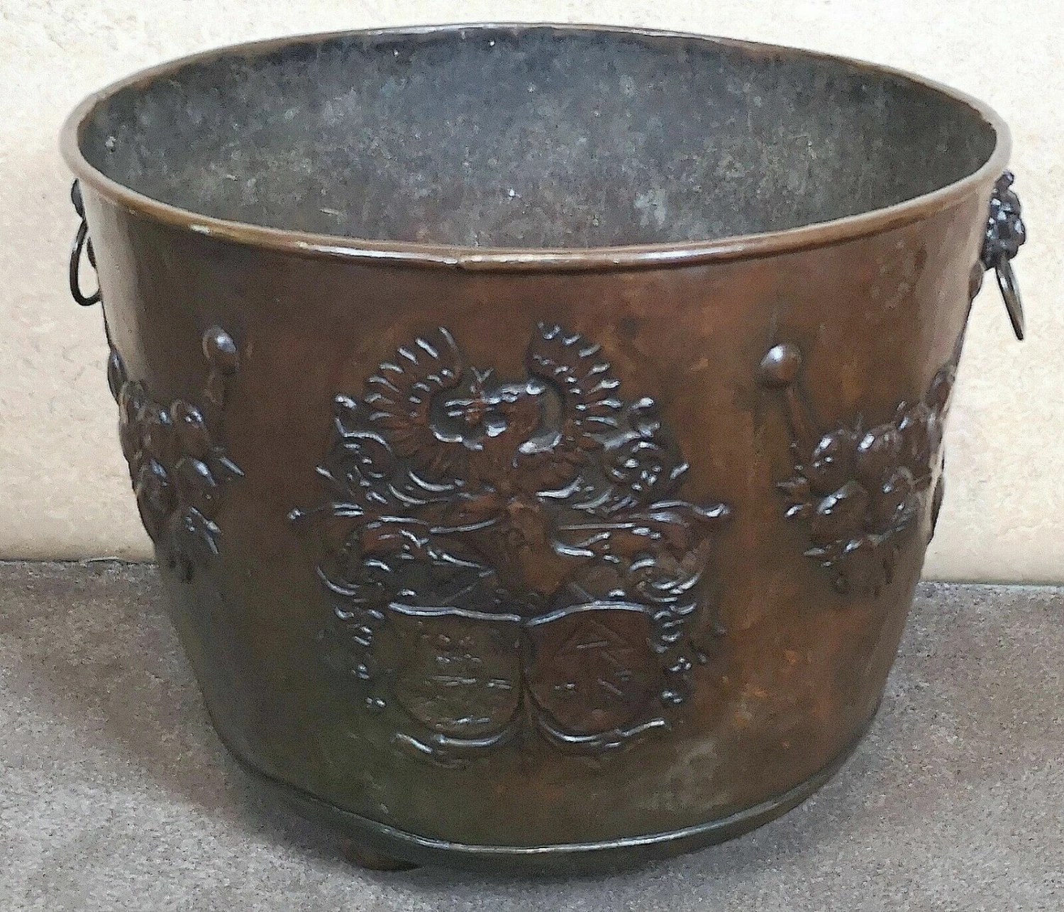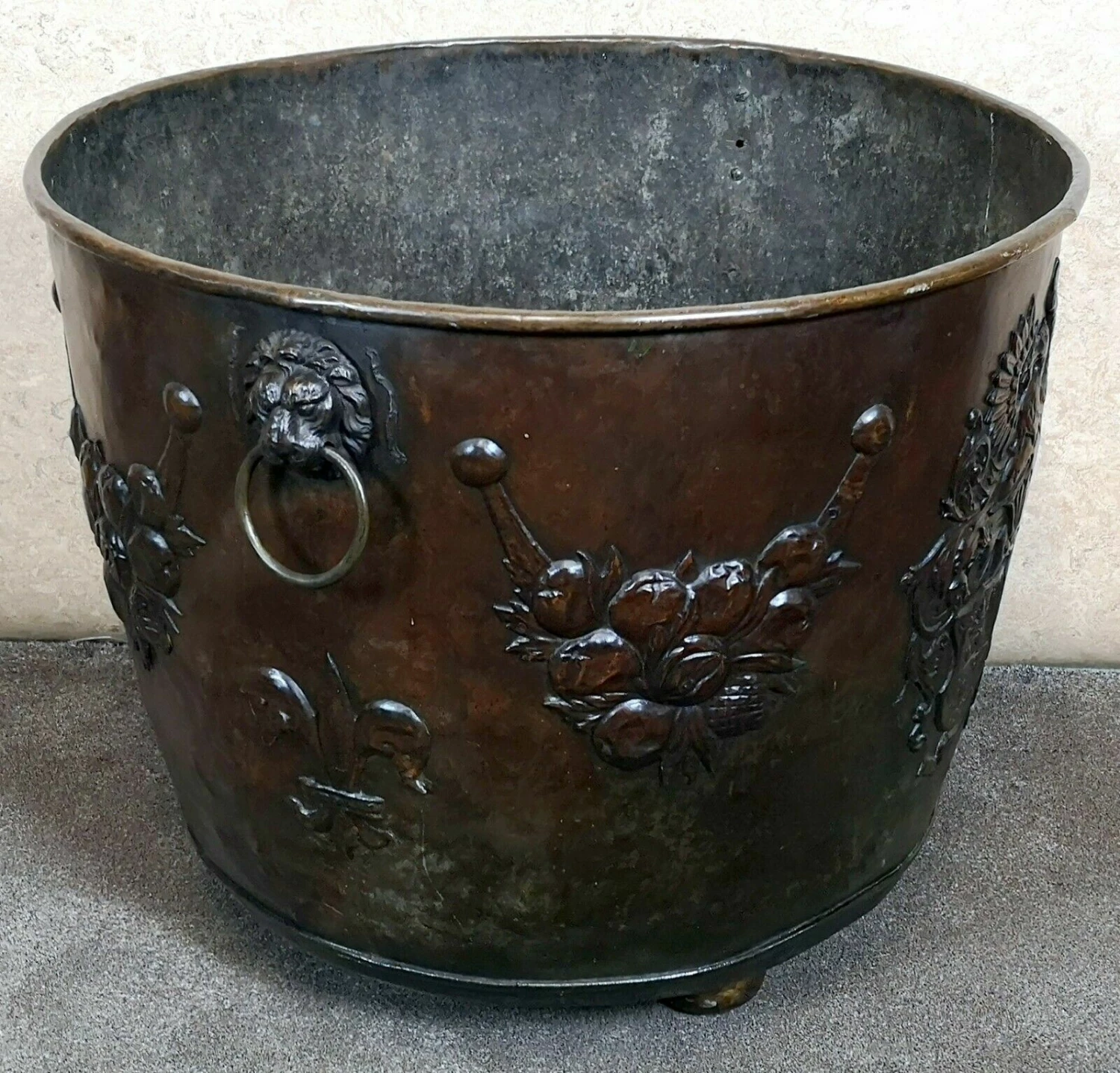 Large Dutch lacquered copper log bin having a rolled lip and lion mask handles.