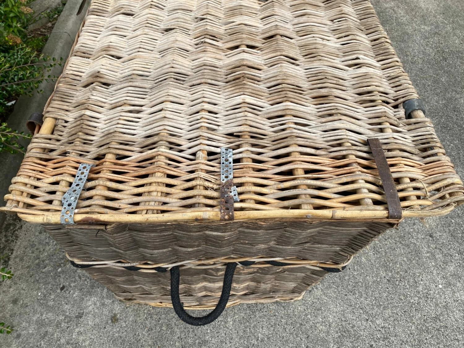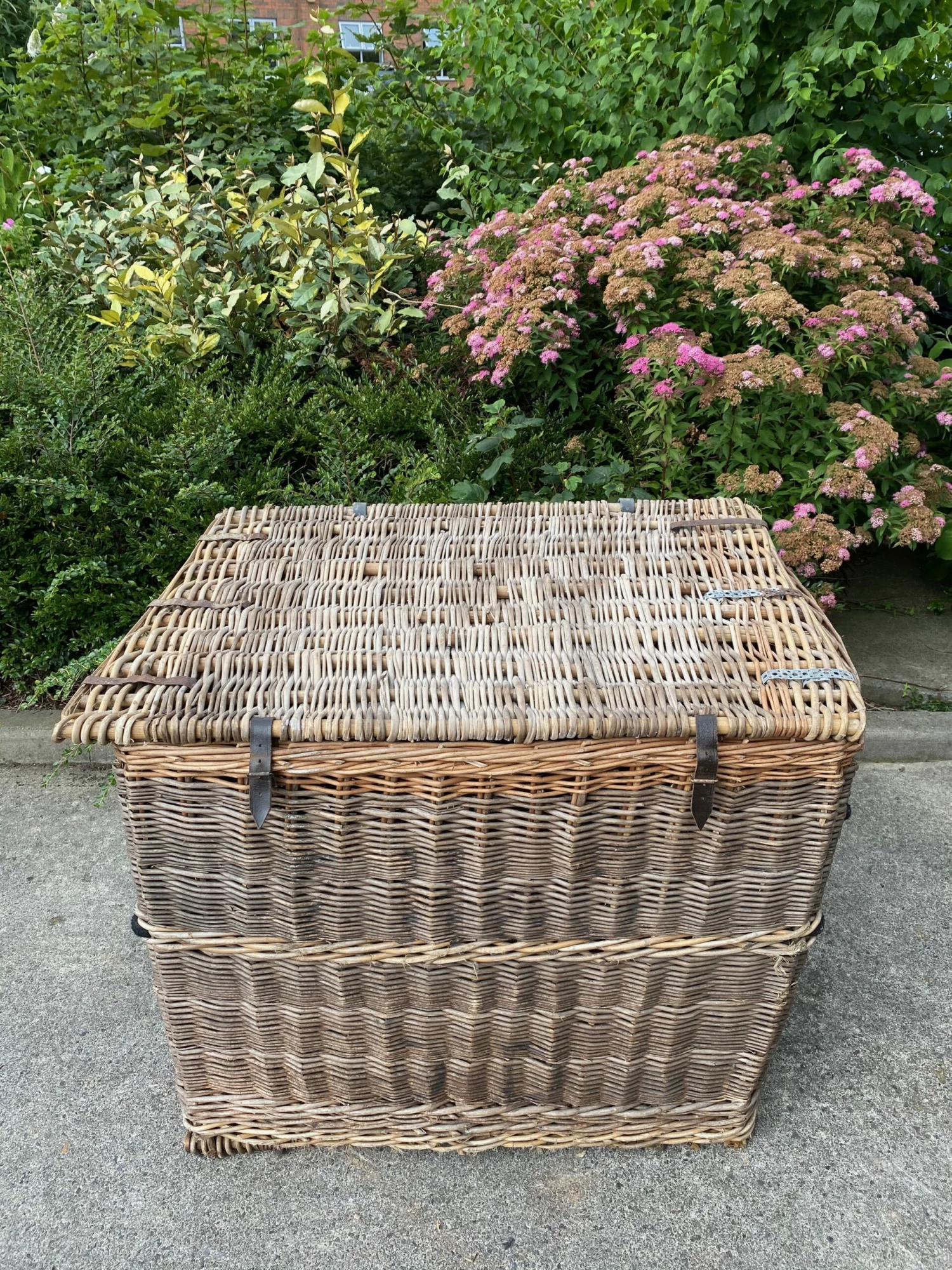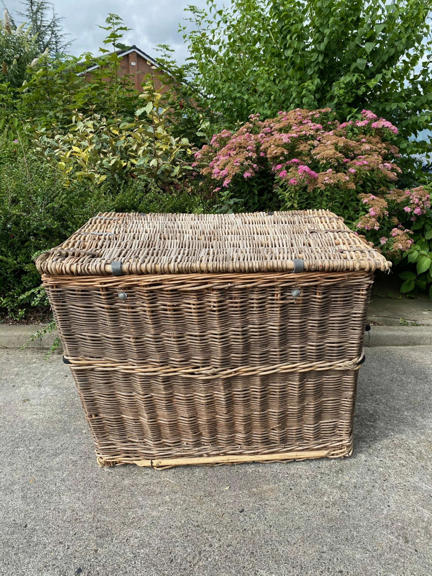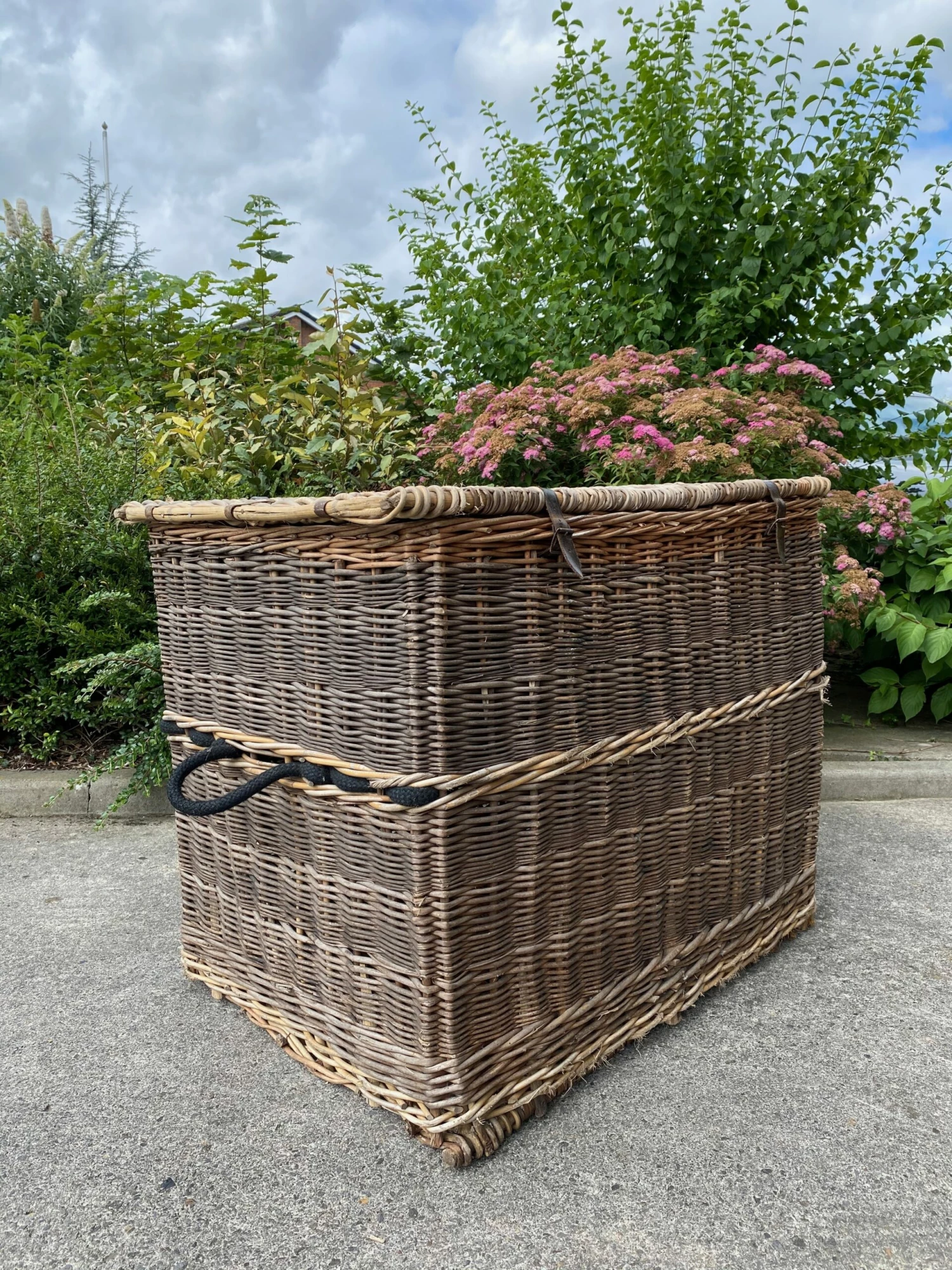 Very large vintage wicker mill/post basket with lid. We have cleaned the basket up but it is otherwise untouched and in an ‘as found’ condition. It has black rope handles, and mismatched brackets, the wicker is faded in places and there is no lettering on the basket. The lid is secured with 2 leather straps and buckles. Full of character, and great storage.