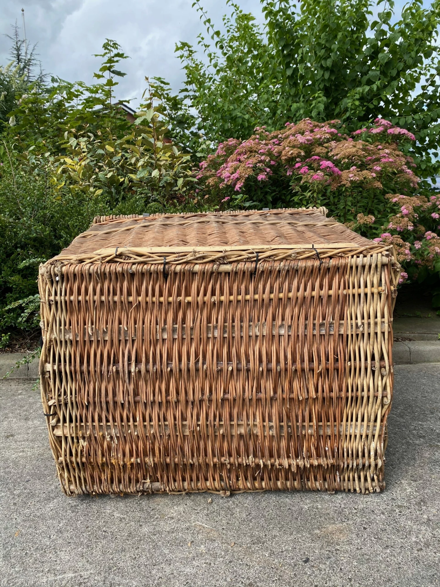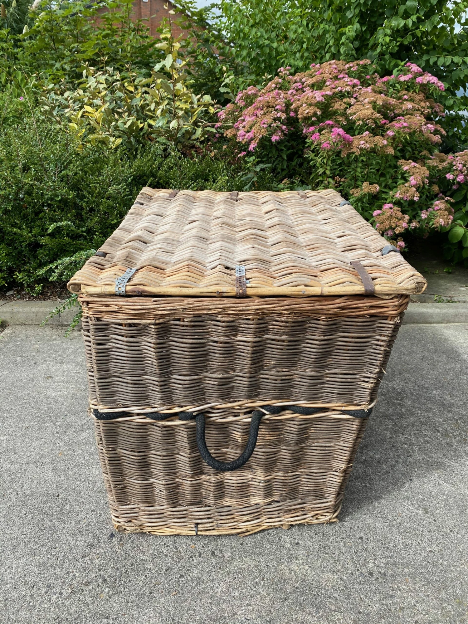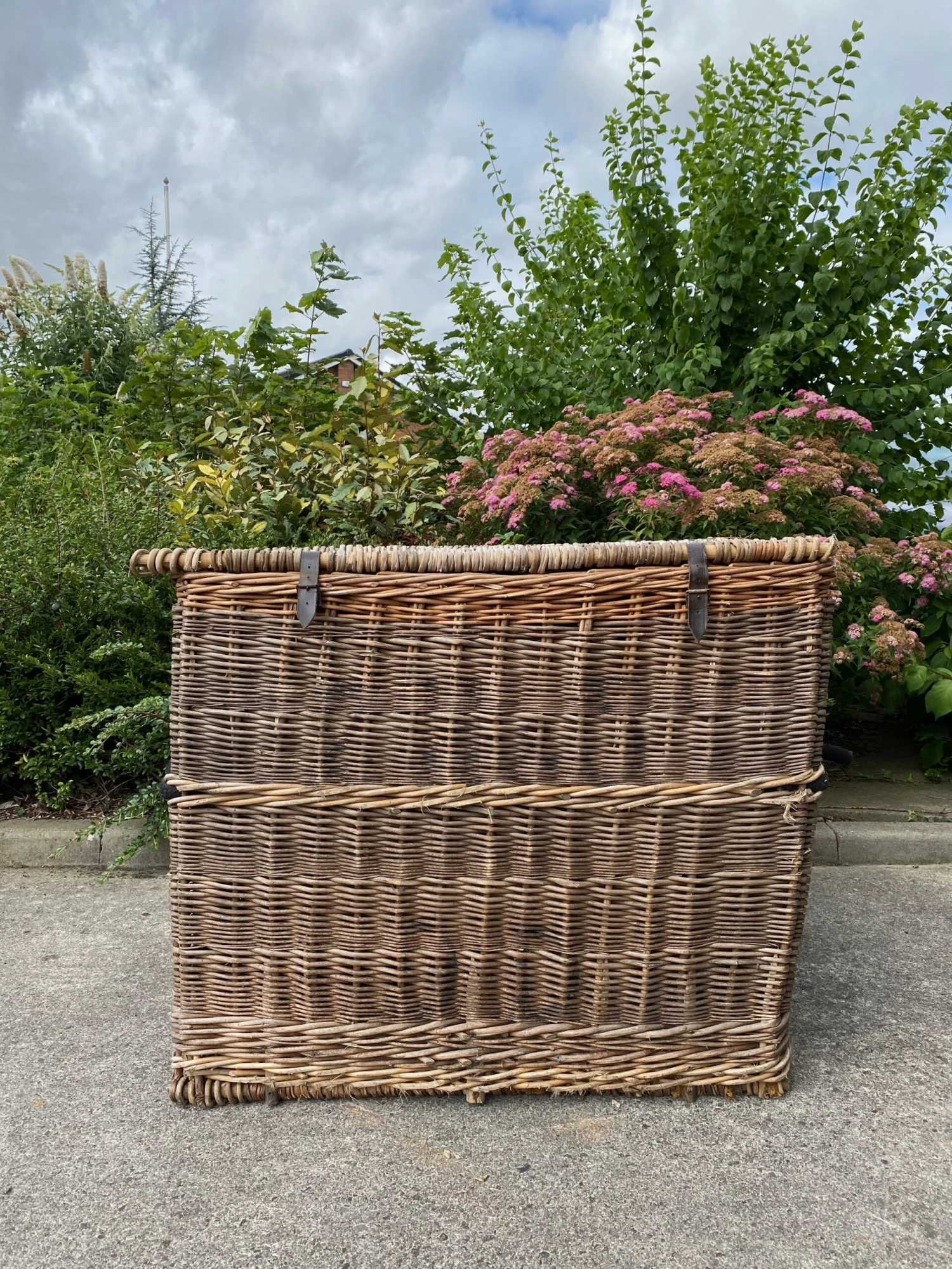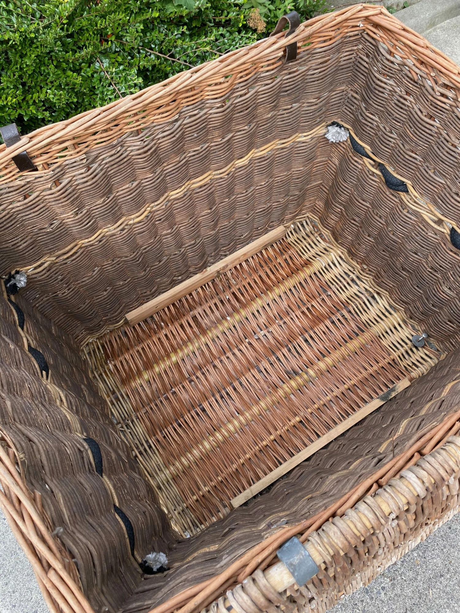 Very large vintage wicker mill/post basket with lid. We have cleaned the basket up but it is otherwise untouched and in an ‘as found’ condition. It has black rope handles, and mismatched brackets, the wicker is faded in places and there is no lettering on the basket. The lid is secured with 2 leather straps and buckles. Full of character, and great storage.