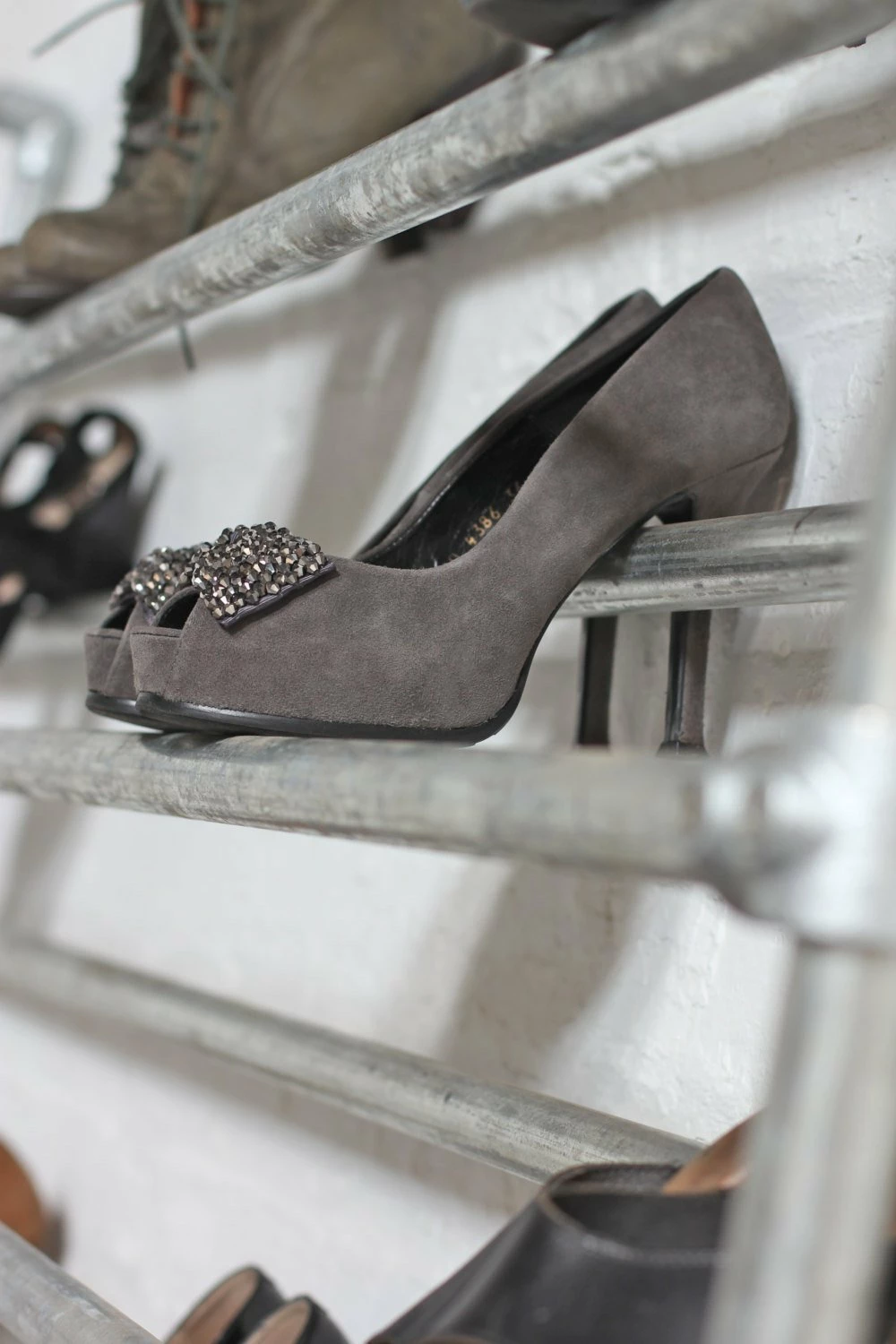 This shoe rack holds 81 pairs of shoes (average size ladies shoes) – the depth would be adjusted to accommodate smaller or bigger shoes – and of course the distance between the rows can be adjusted to accommodate longer boots… all of the horizontal poles can be adjusted to change the angle of the front of the pole to back depending on heel size – the bottom two rows of poles in this listings were closer together in heights for flat shoes and all of the seven rows above have been positioned for high heels !