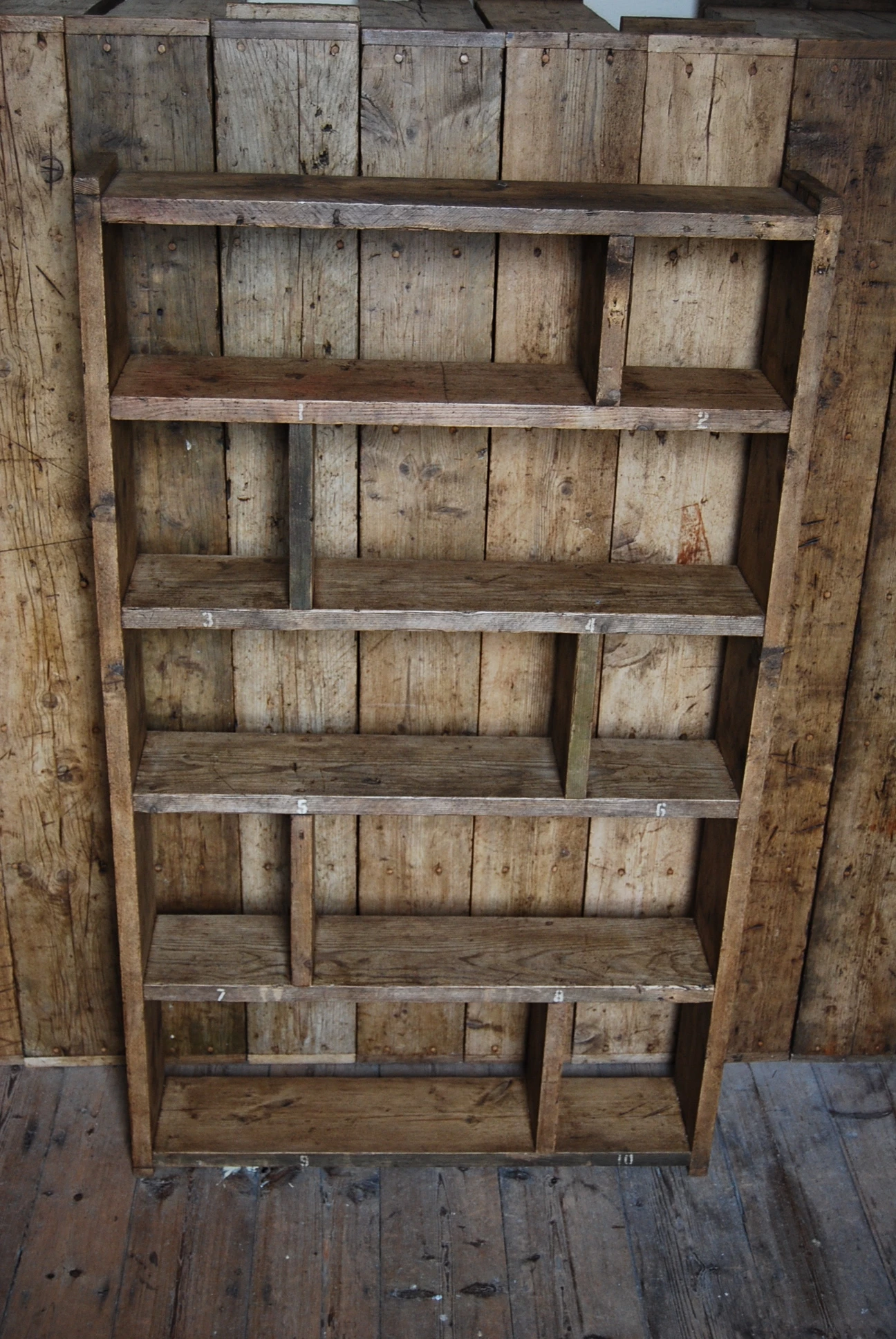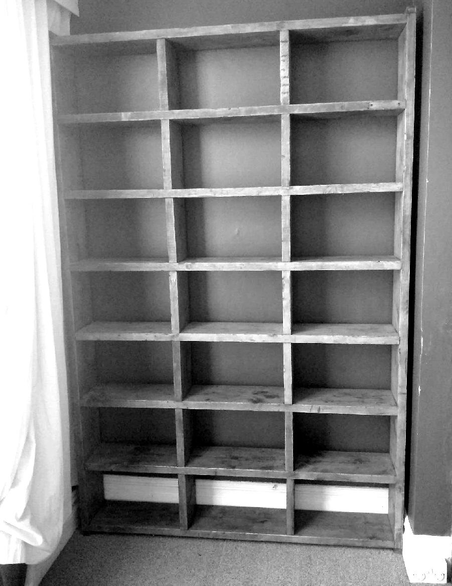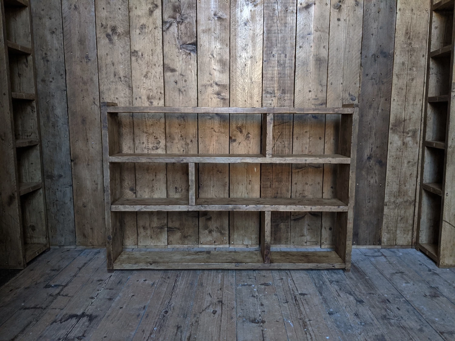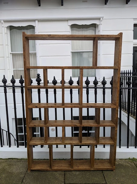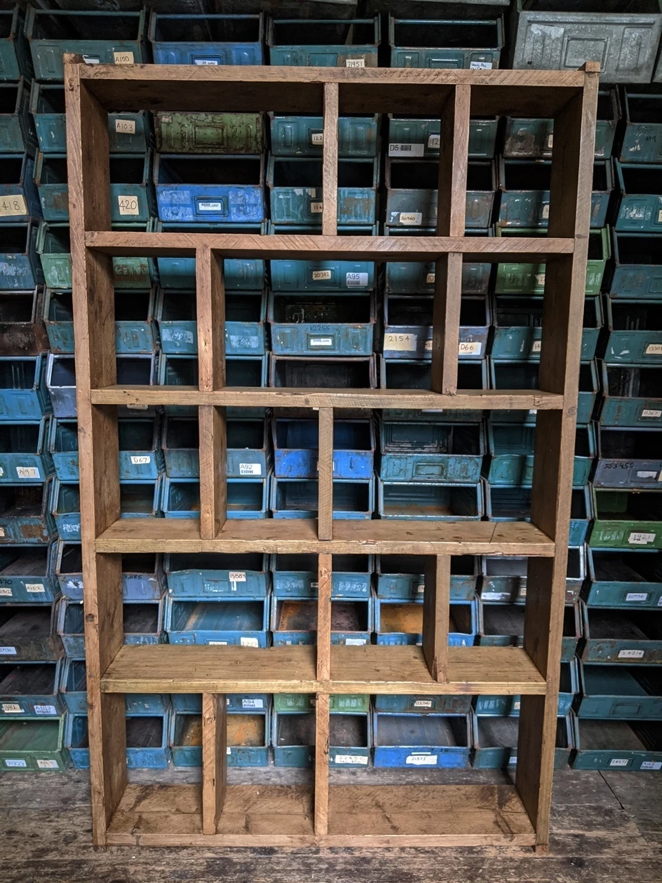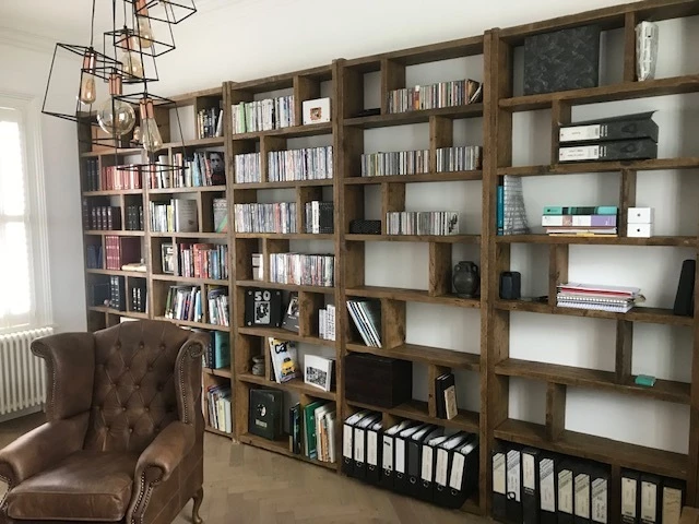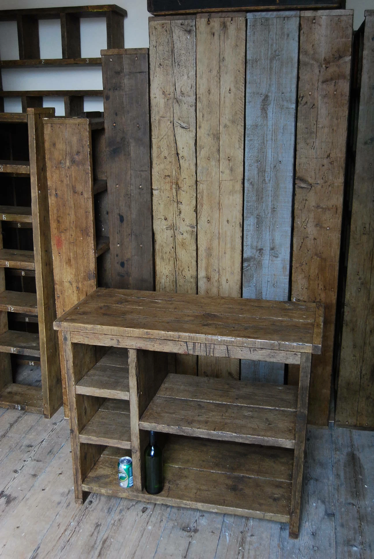 Solid reclaimed wood, screwed and glued, wood coloured wax finish.