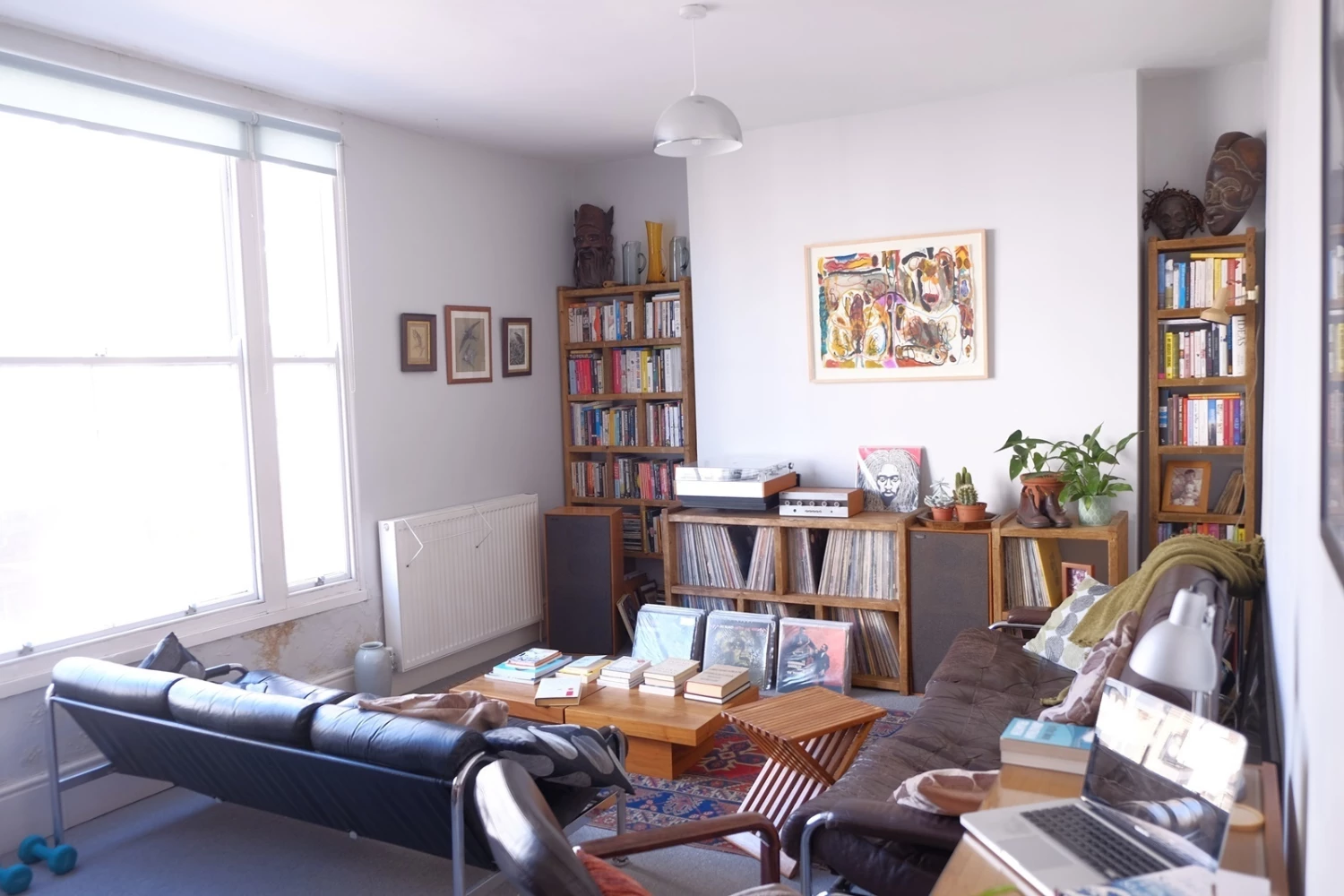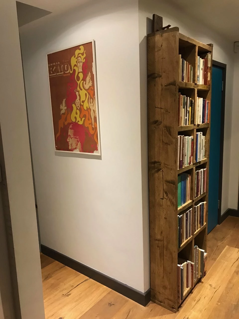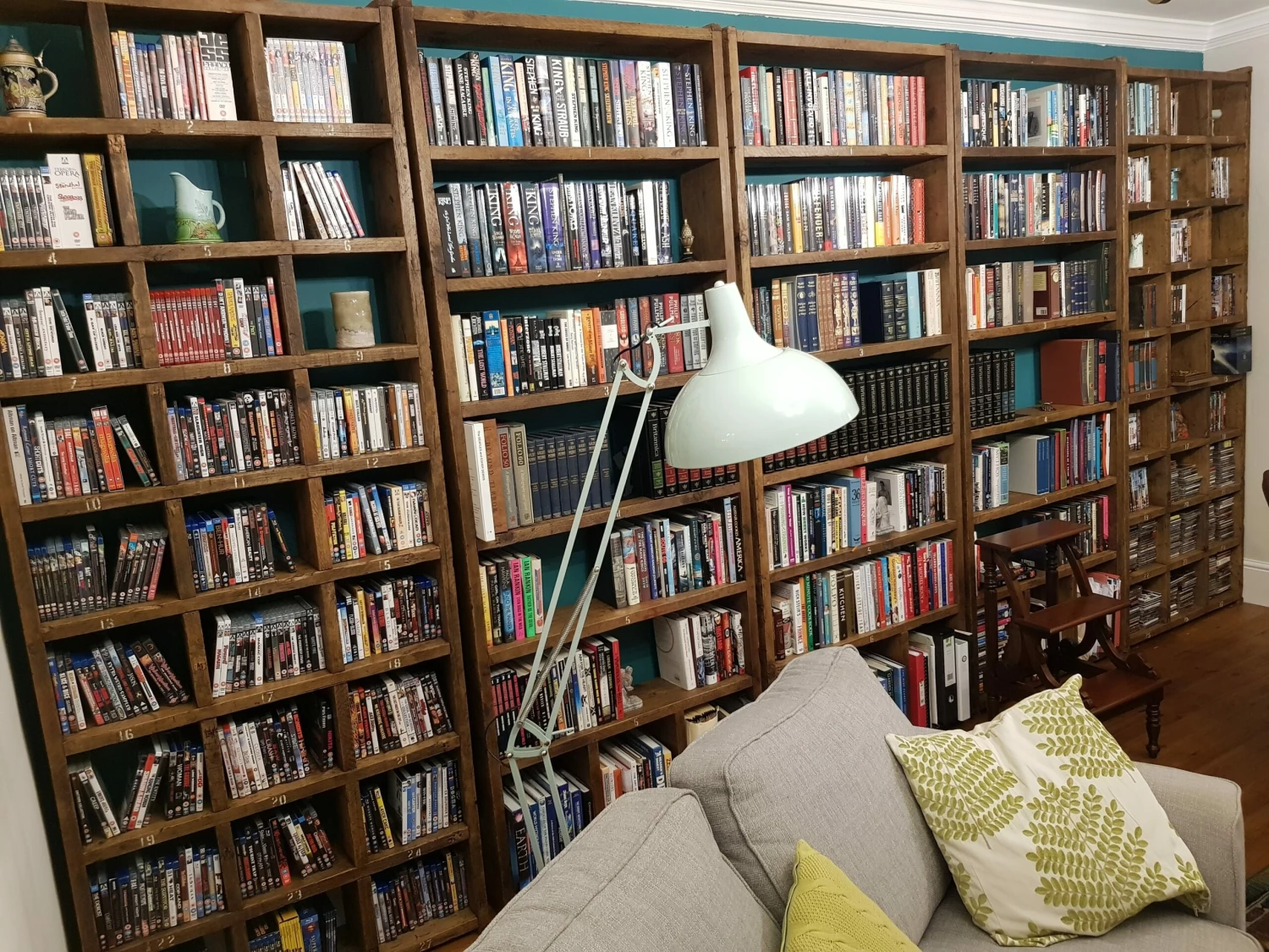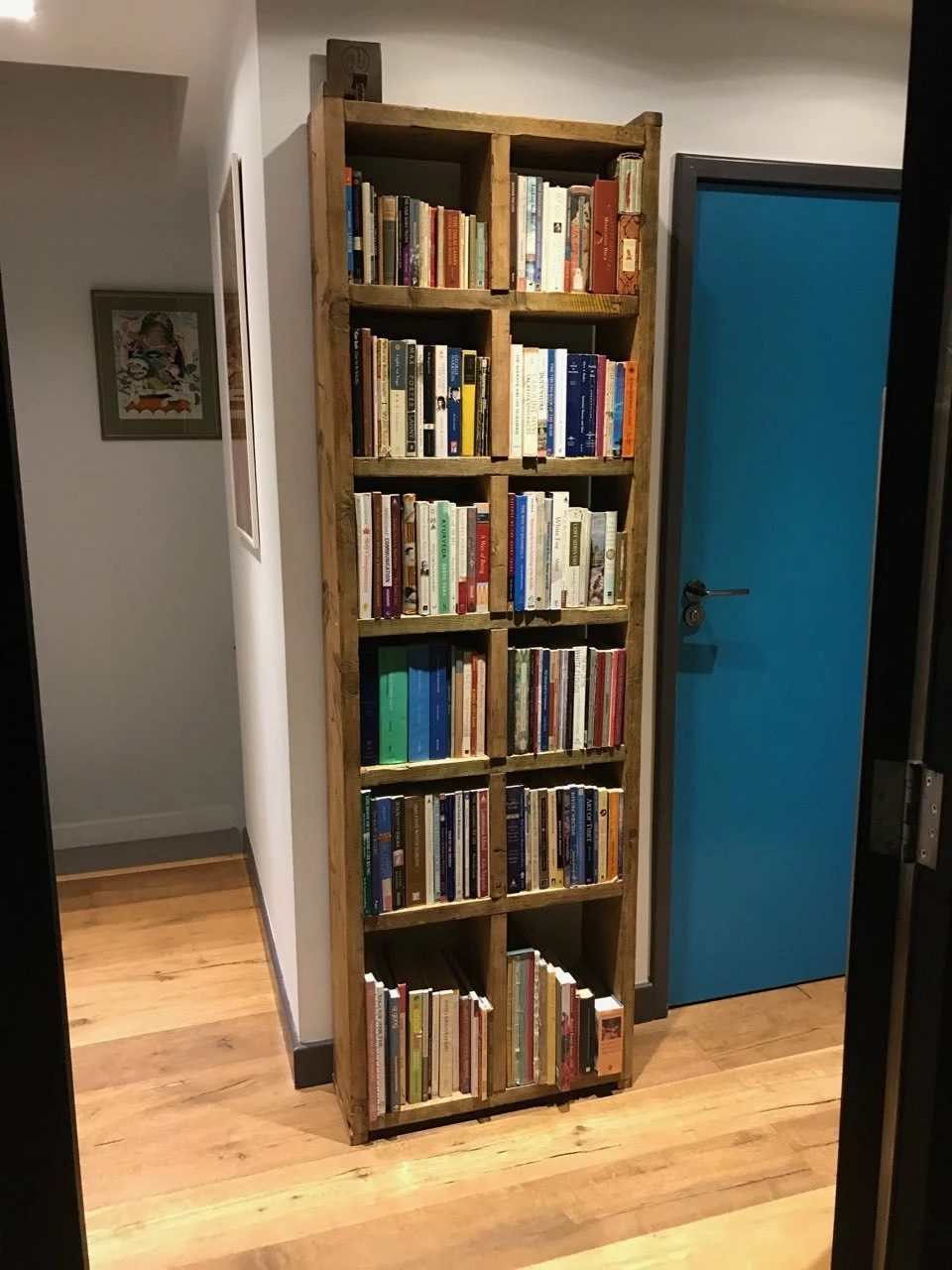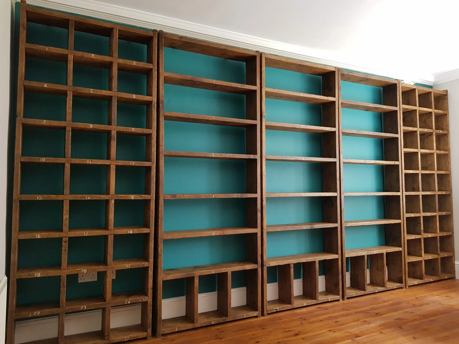 Solid reclaimed wood, screwed and glued, wood coloured wax finish.