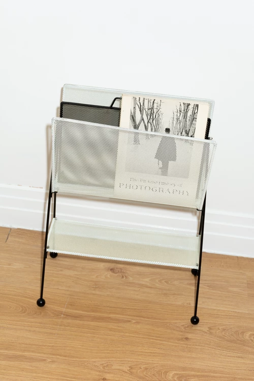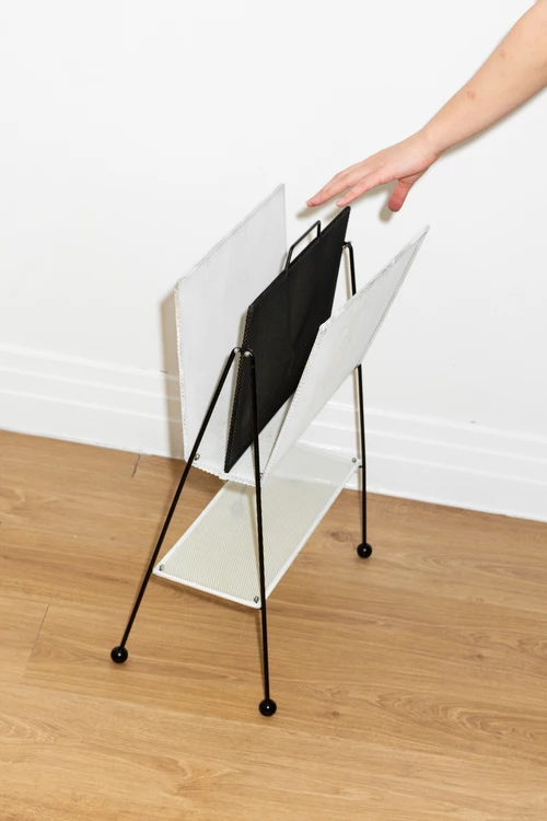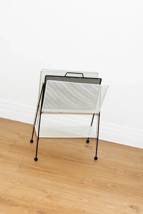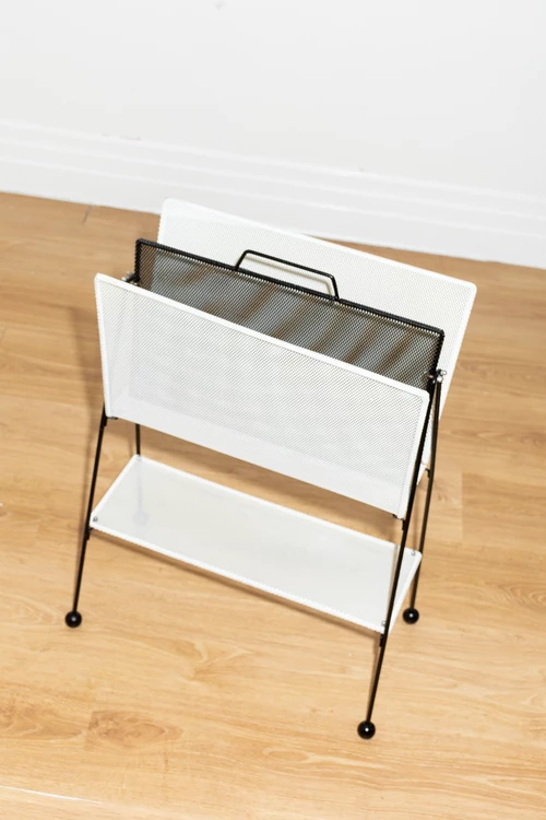 Vintage Mathieu Mategot for Artimeta 1950’s magazine rack with two top sections and bottom tier. Mesh steel body with black frame and handle with Sputnik style feet