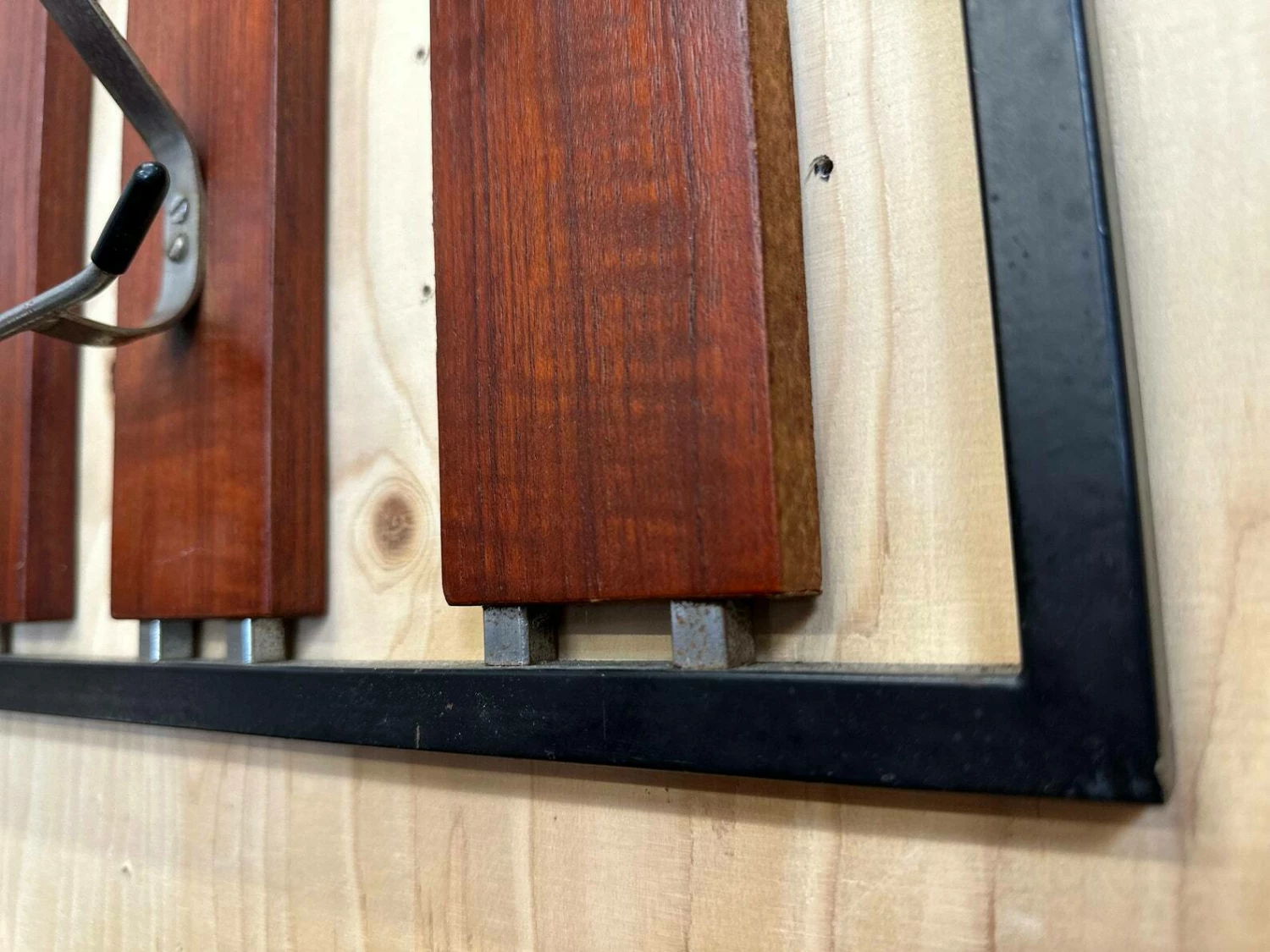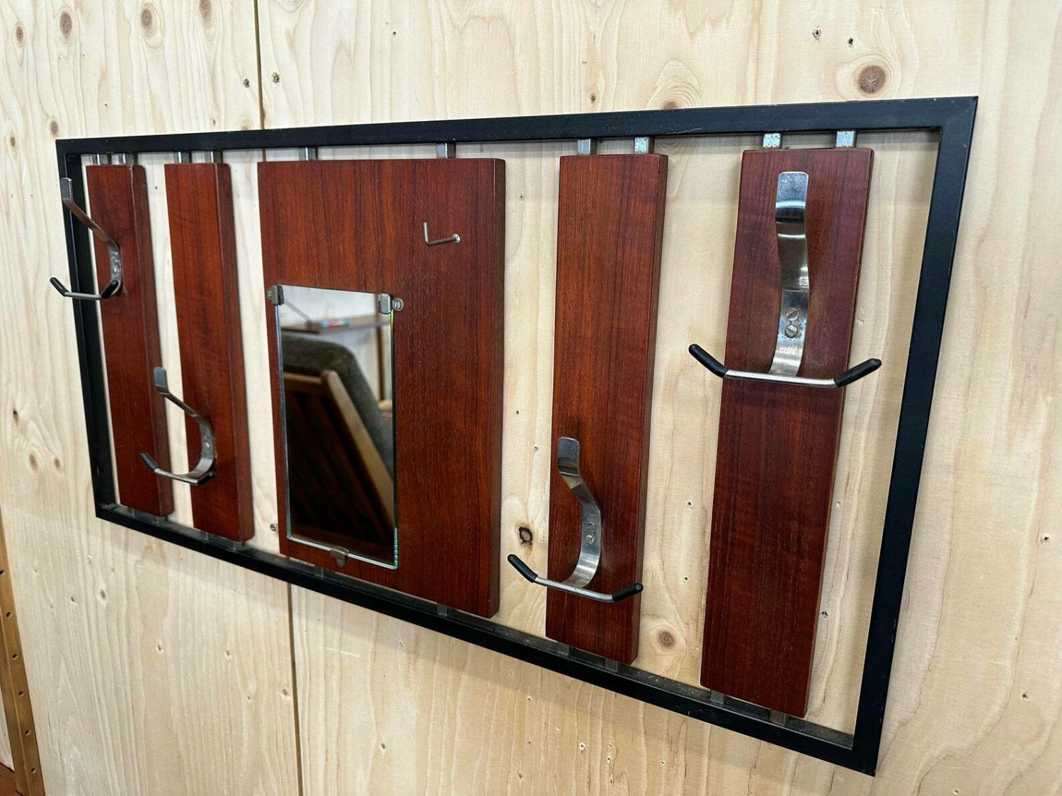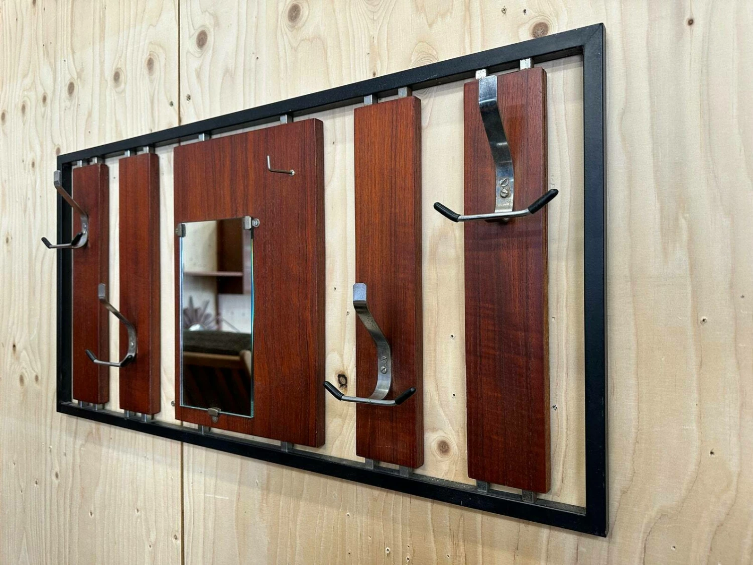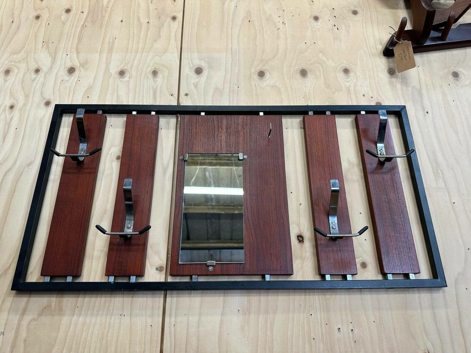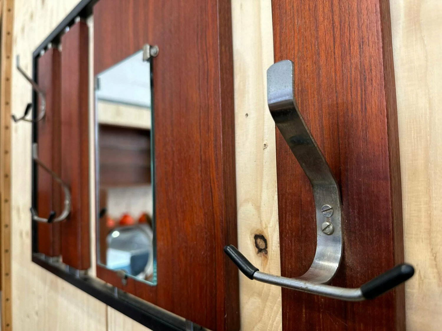 Featuring a metal frame supporting teak panels on polished steel fixtures. There are four coat hooks along with a key hook and a new small mirror.