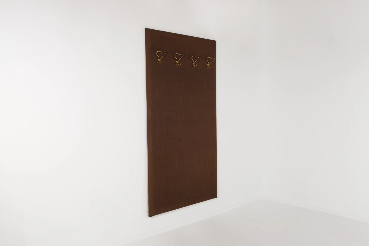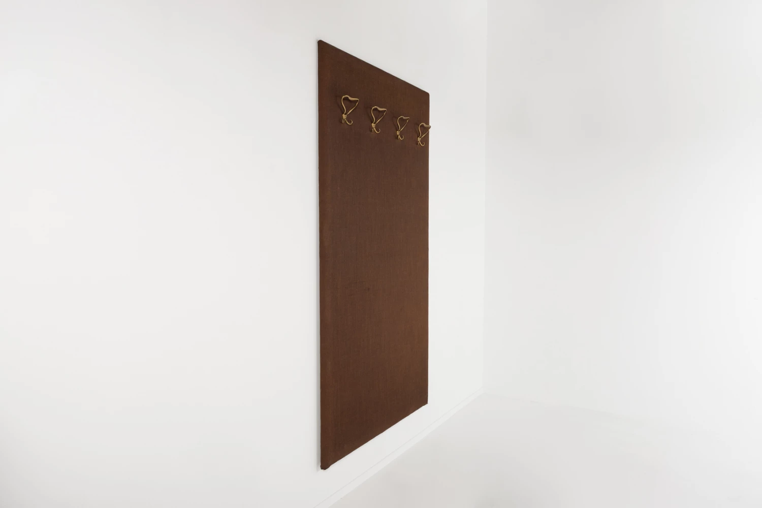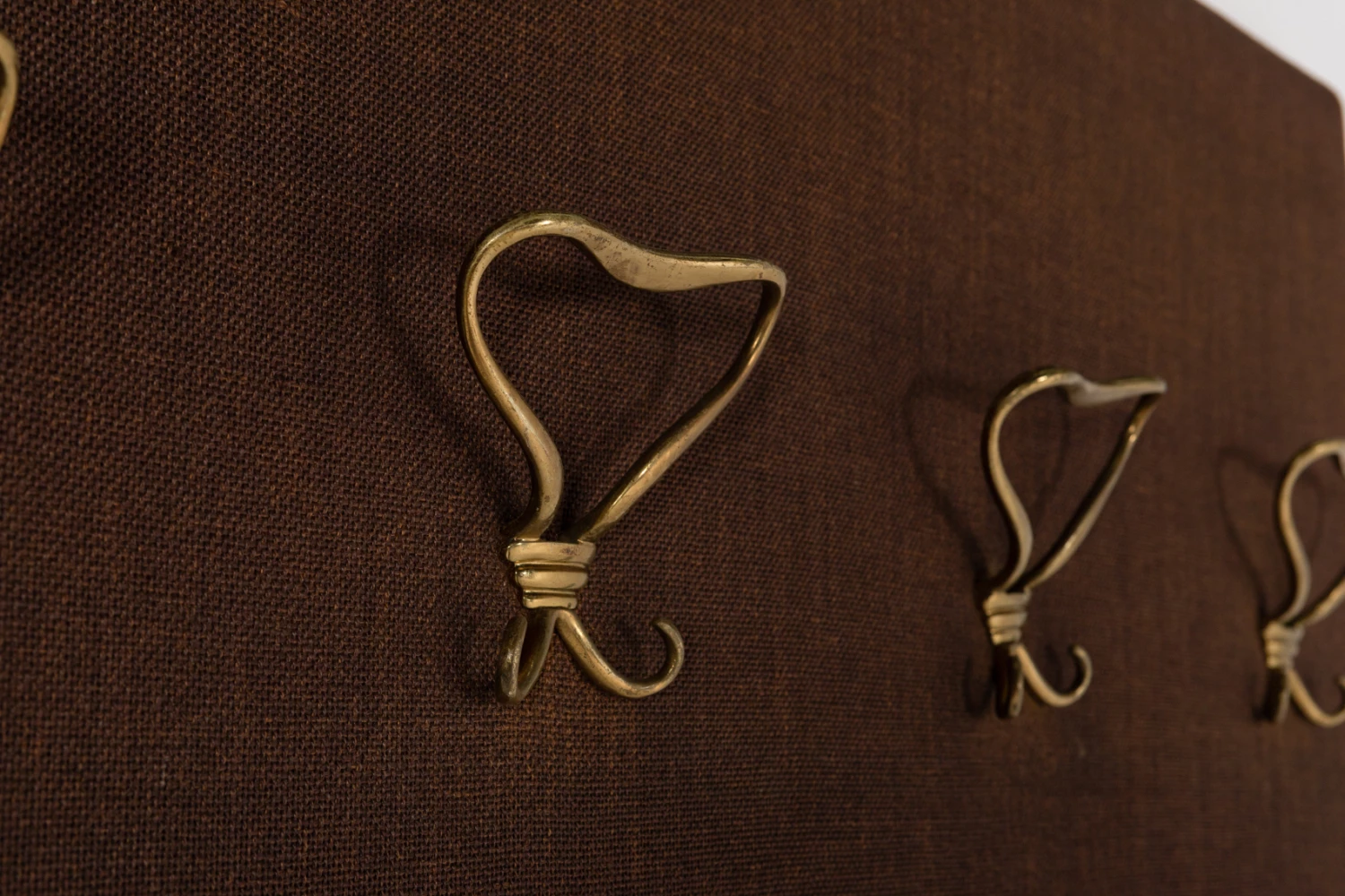 Beautiful wall coat rack from 1960’s. Exceptional Italian craftsmanship in brown wool fabric finish, equipped with brass hangers.