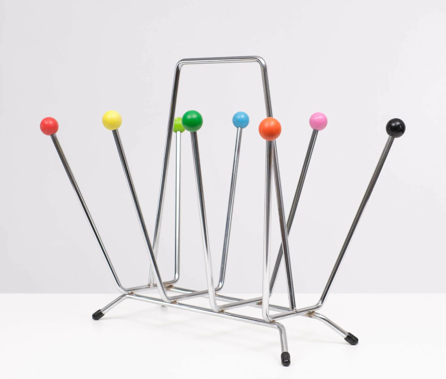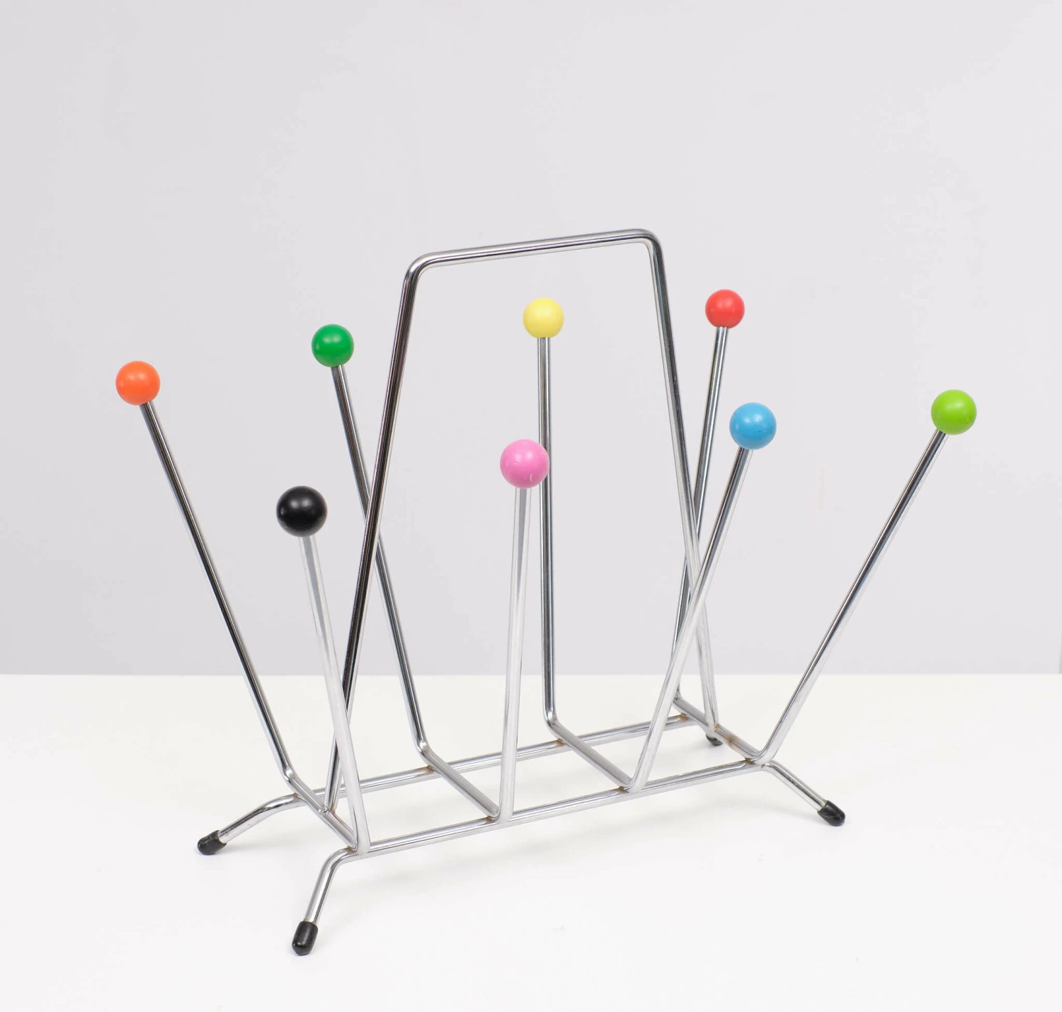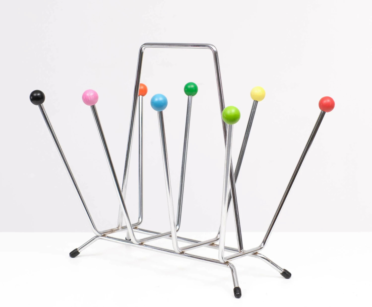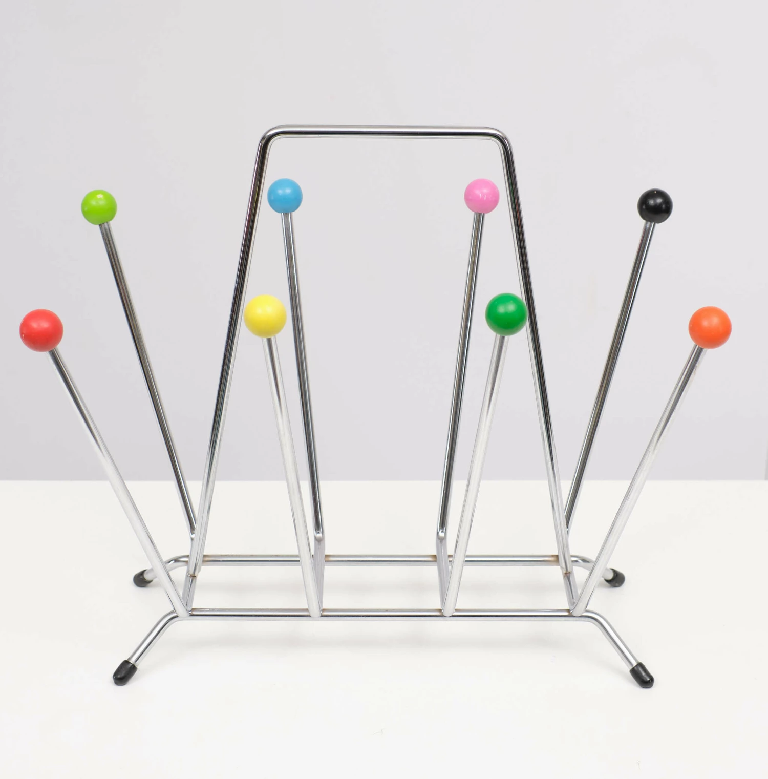Vintage Space Age magazine rack Charles & Ray Eames, chrome Sputnik atomic newspaper rack, mid century design from the 1960s. Good condition.