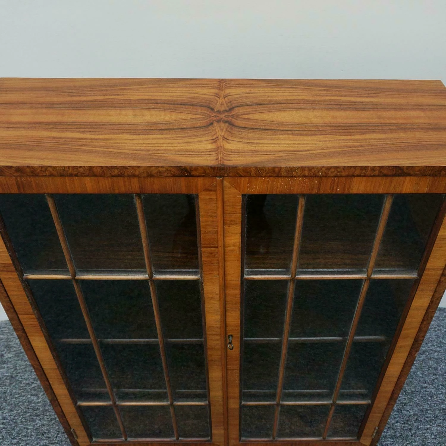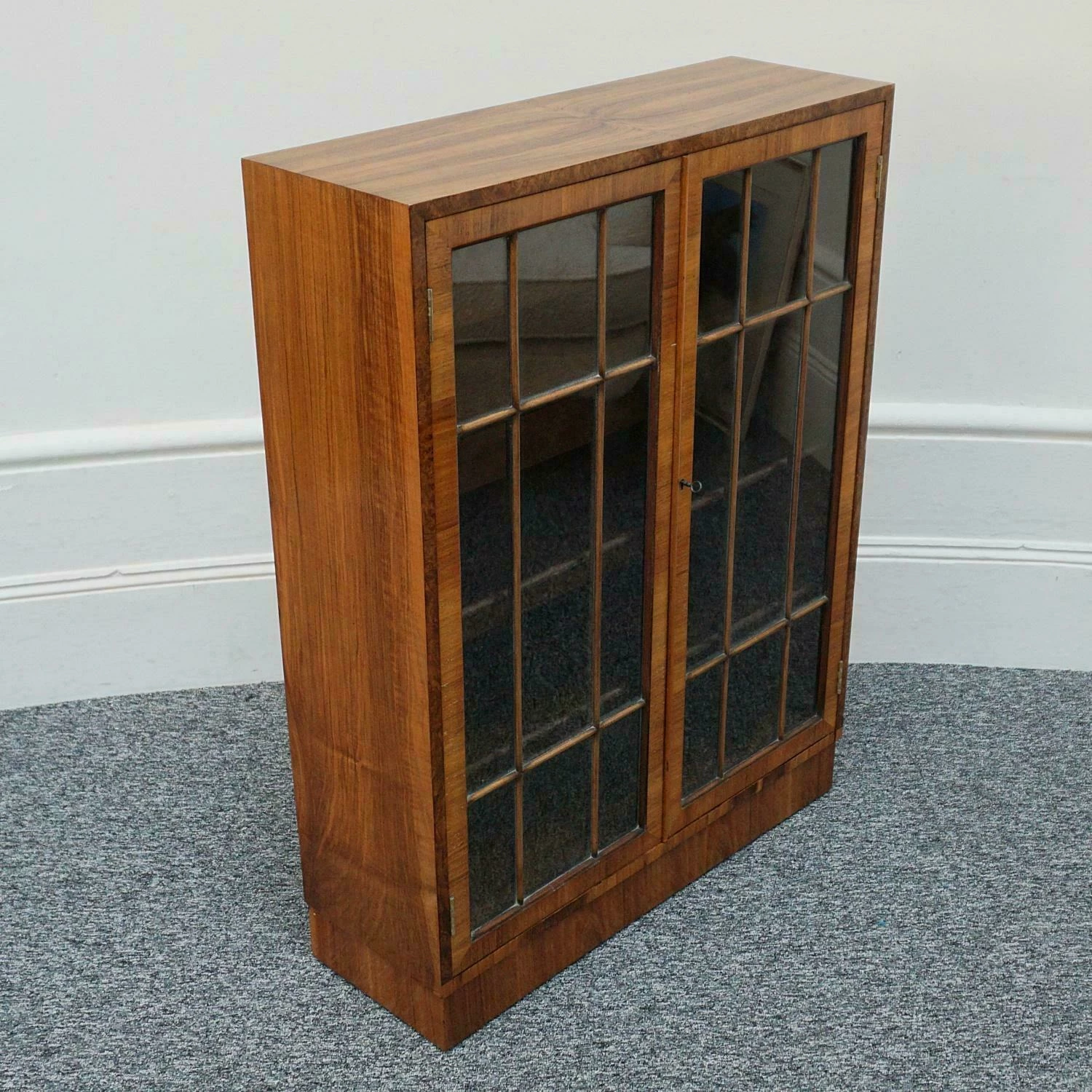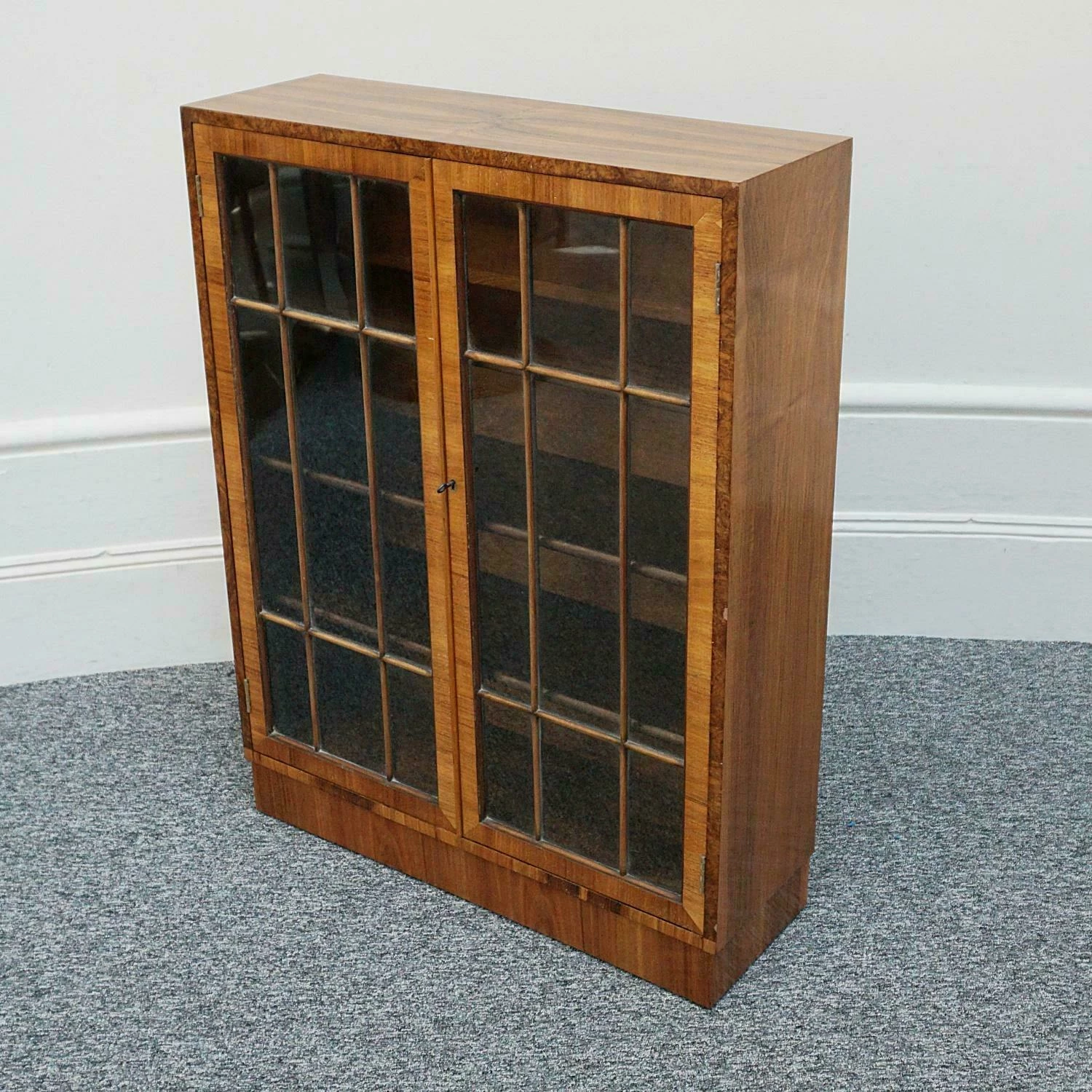 A small proportioned Art Deco glass fronted bookcase. Figured walnut and burr walnut veneered throughout with four interior shelves.