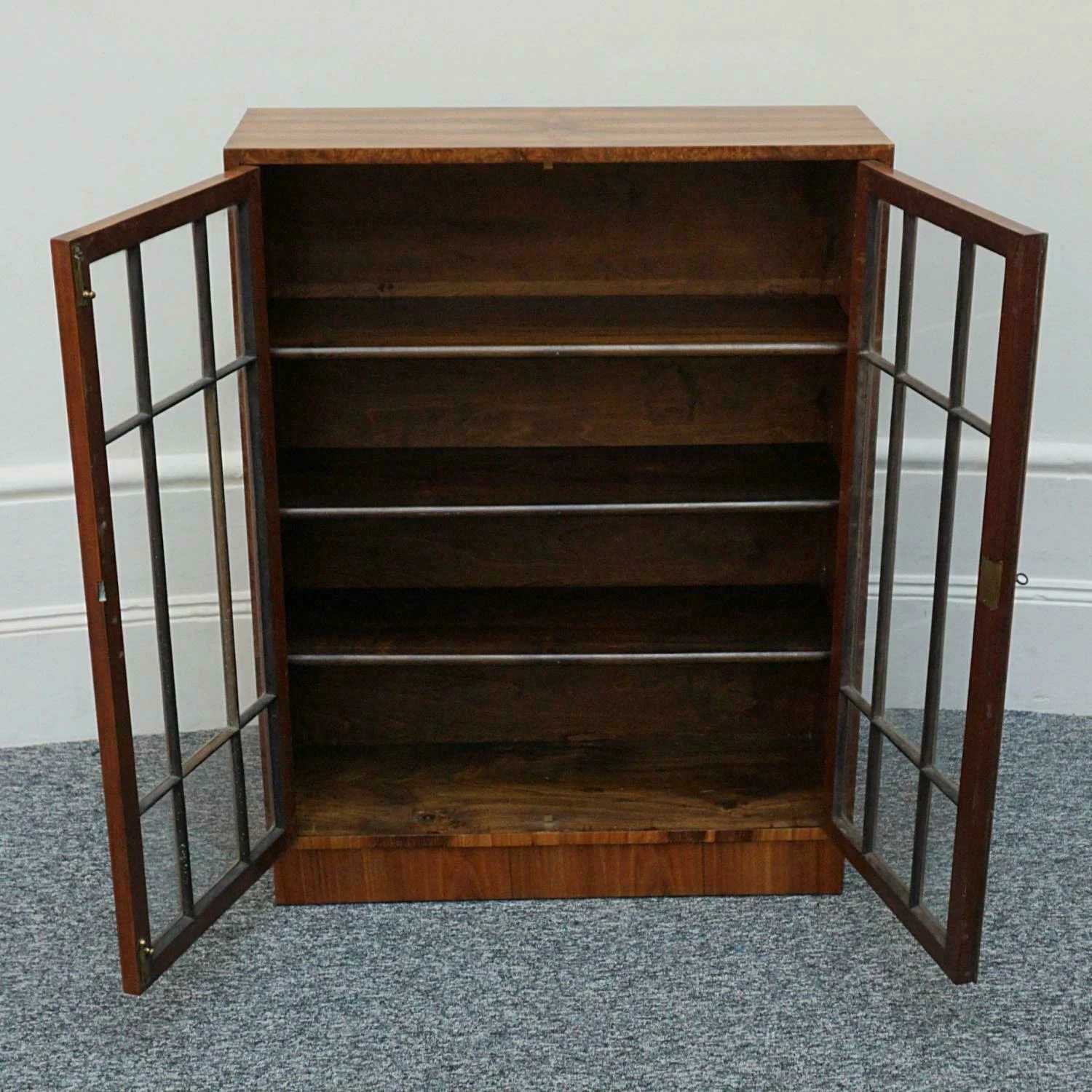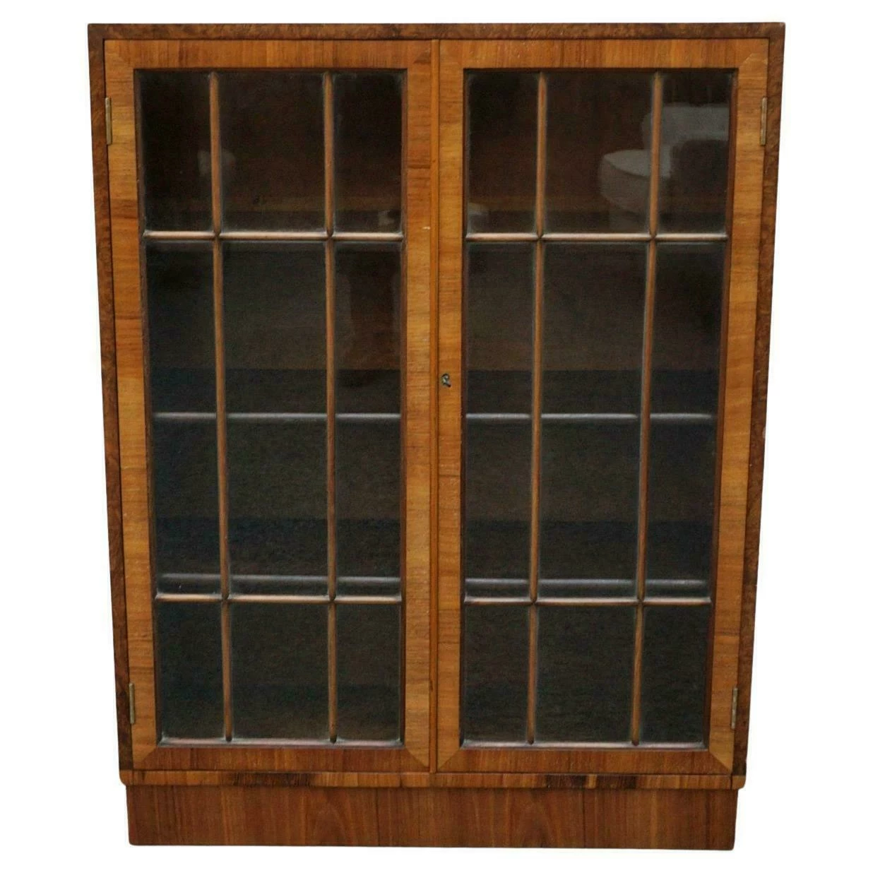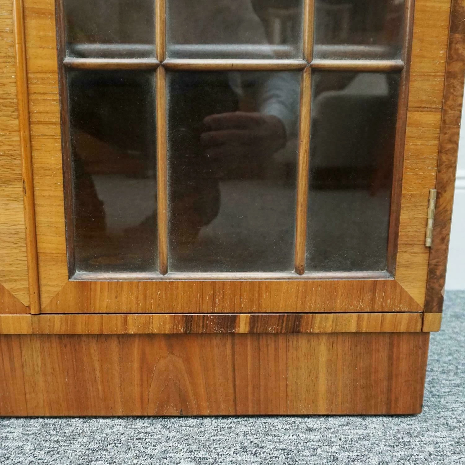 A small proportioned Art Deco glass fronted bookcase. Figured walnut and burr walnut veneered throughout with four interior shelves.