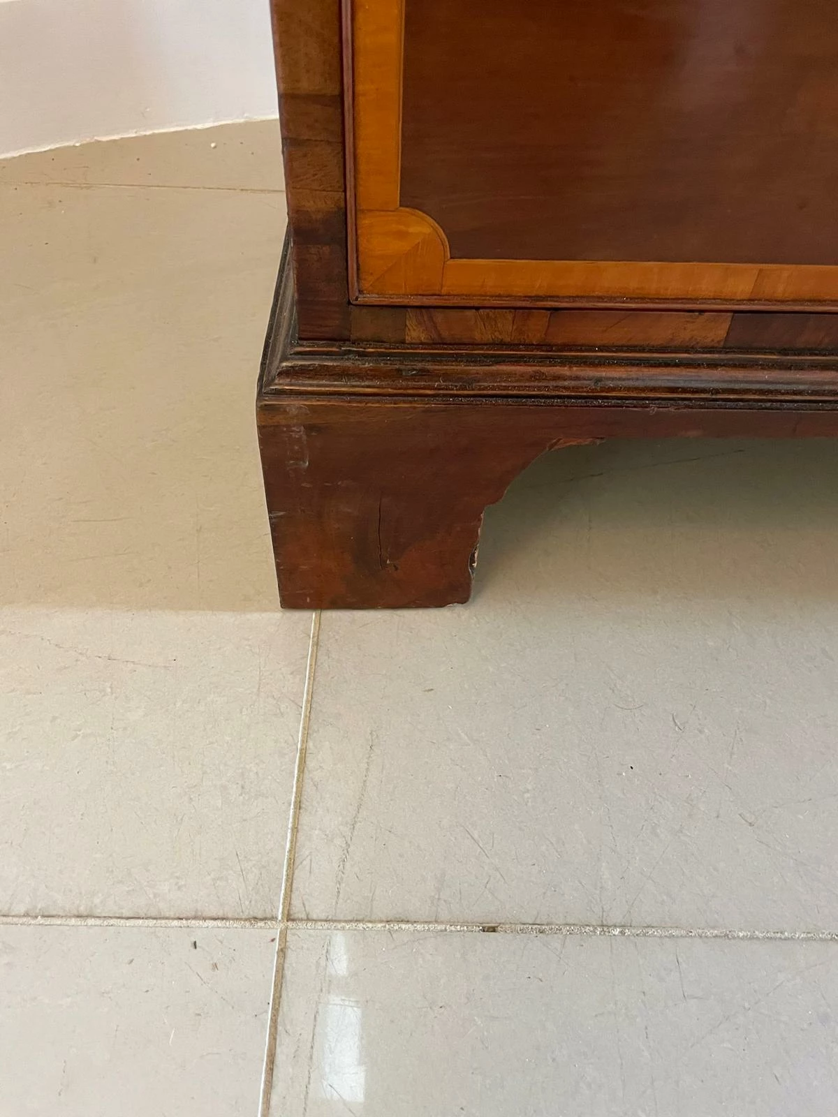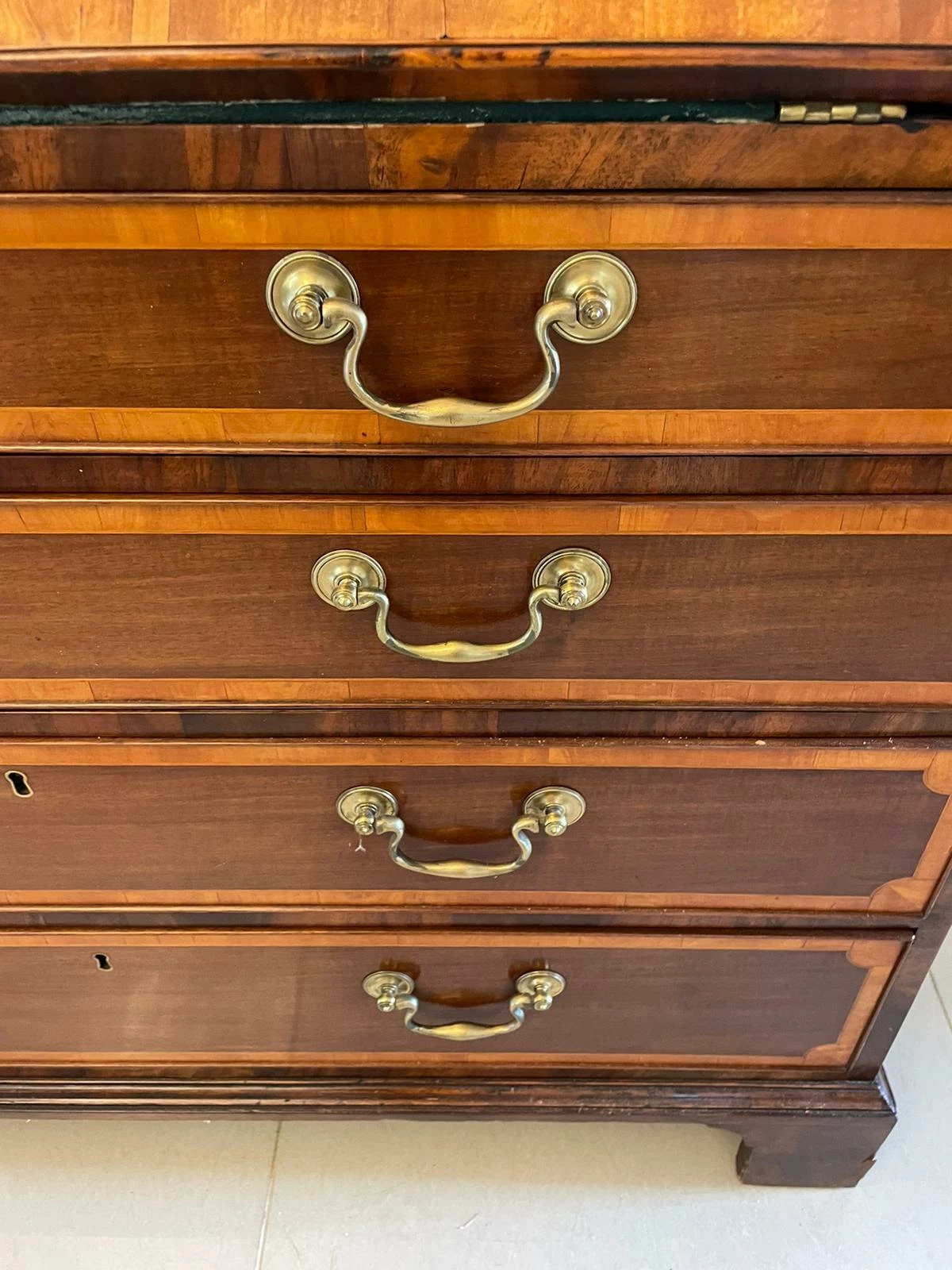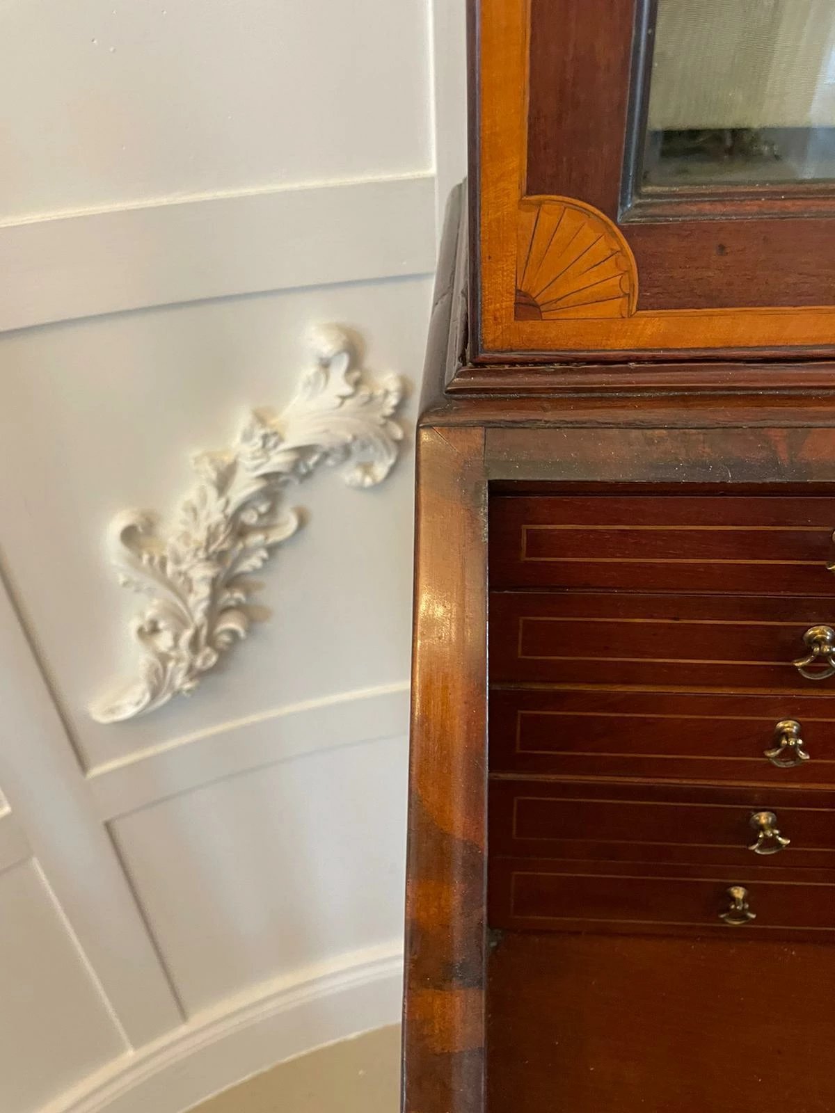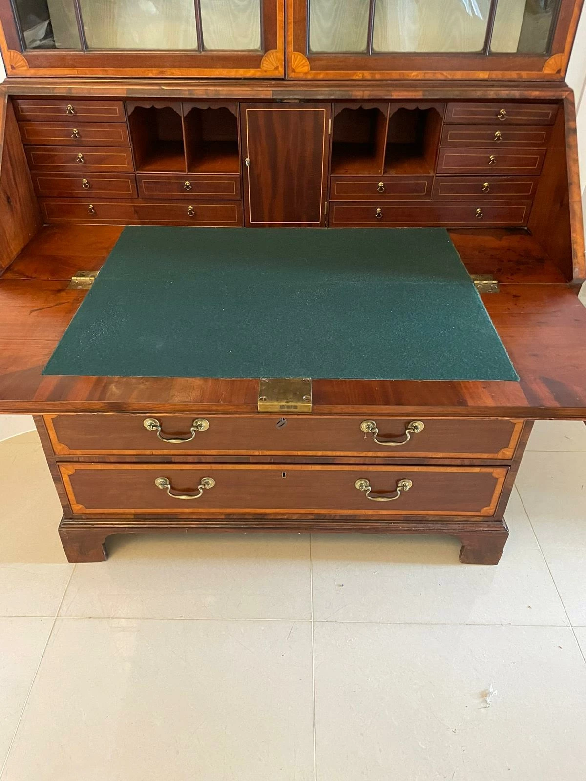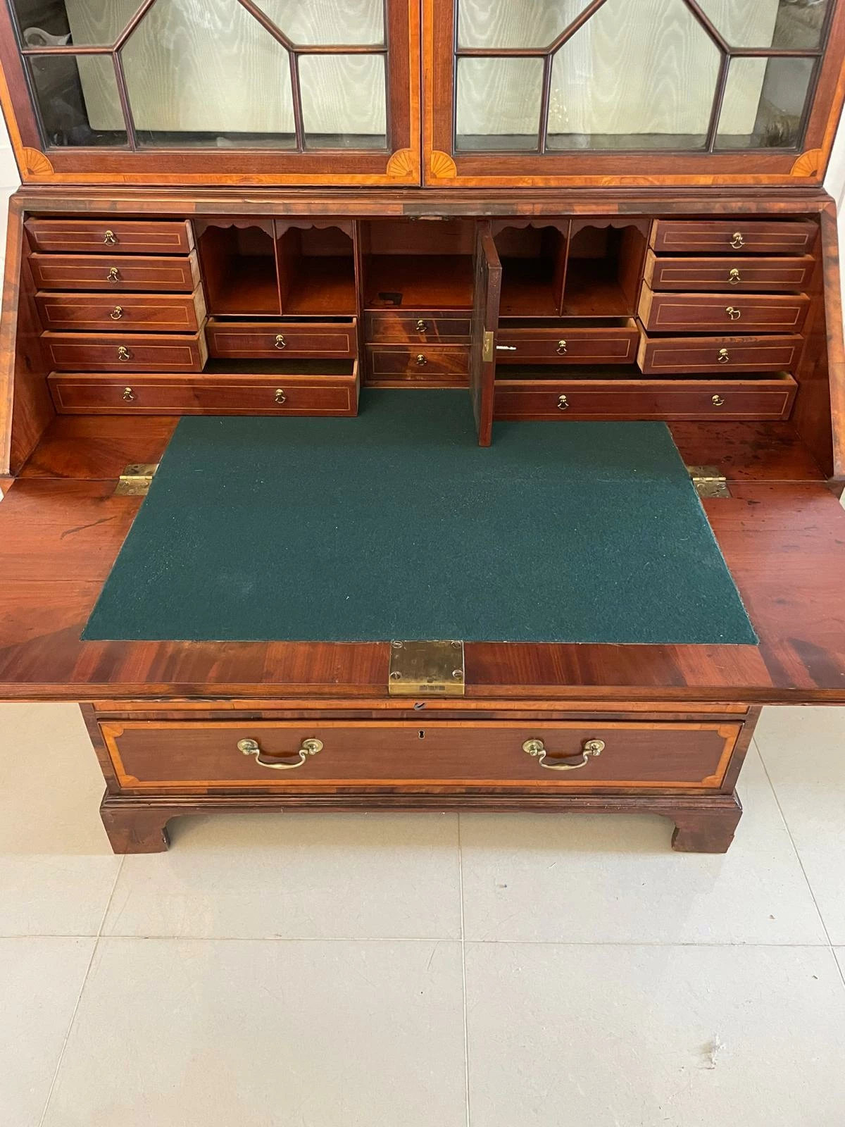 Outstanding quality antique George III mahogany inlaid bureau bookcase having an outstanding quality carved cornice above a pair of mahogany inlaid satinwood astral glazed doors opening to reveal three adjustable shelves above a fantastic bureau with a mahogany fall boasting pretty inlaid satinwood. The fall opens to reveal a fitted interior consisting of twelve drawers, pigeon holes and a door to the centre opening to reveal two secret drawers above four long cockbeeded mahogany inlaid satinwood drawers with original brass swan neck handles and standing on original bracket feet