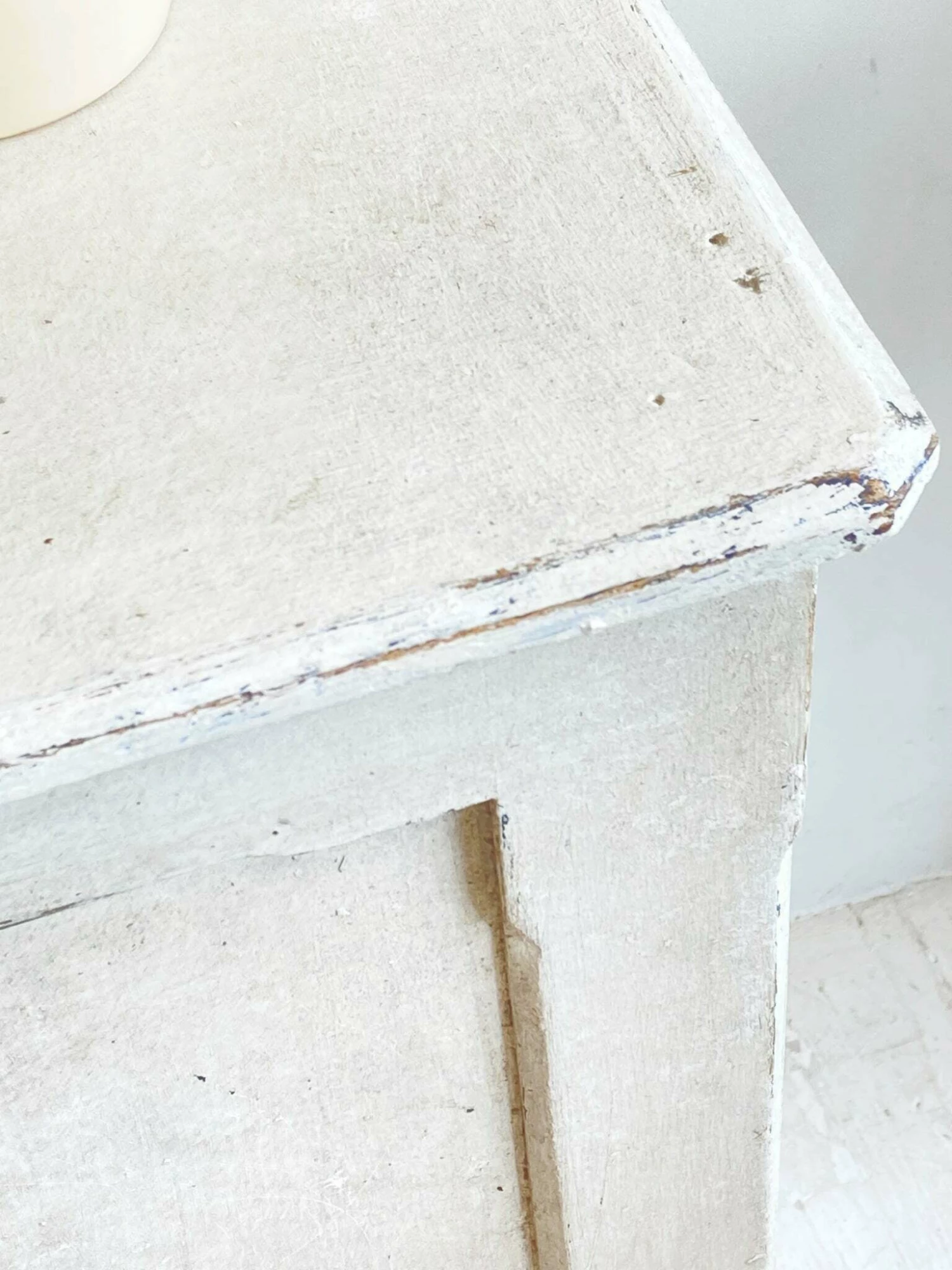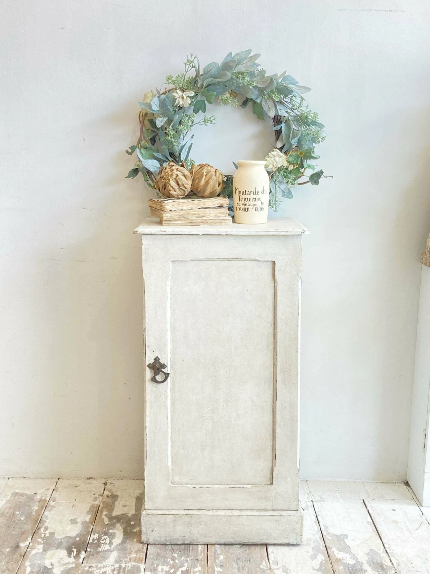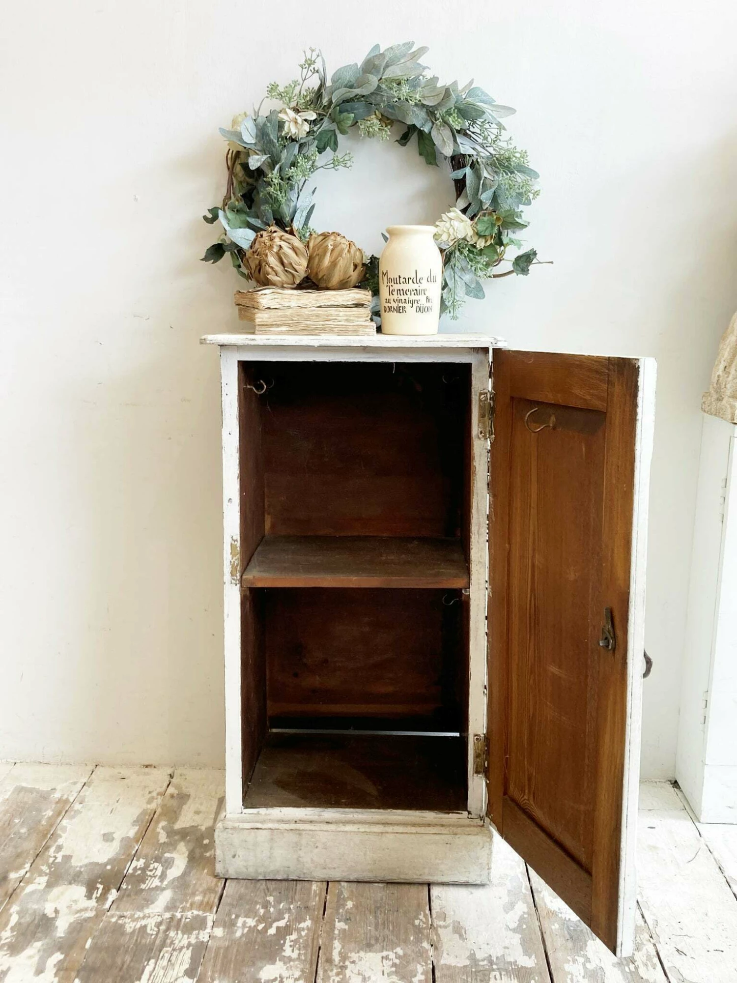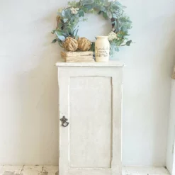 A slim Victorian cupboard with textured white paint that has been aged and distressed. There is a single internal shelf and turning latch on the door.