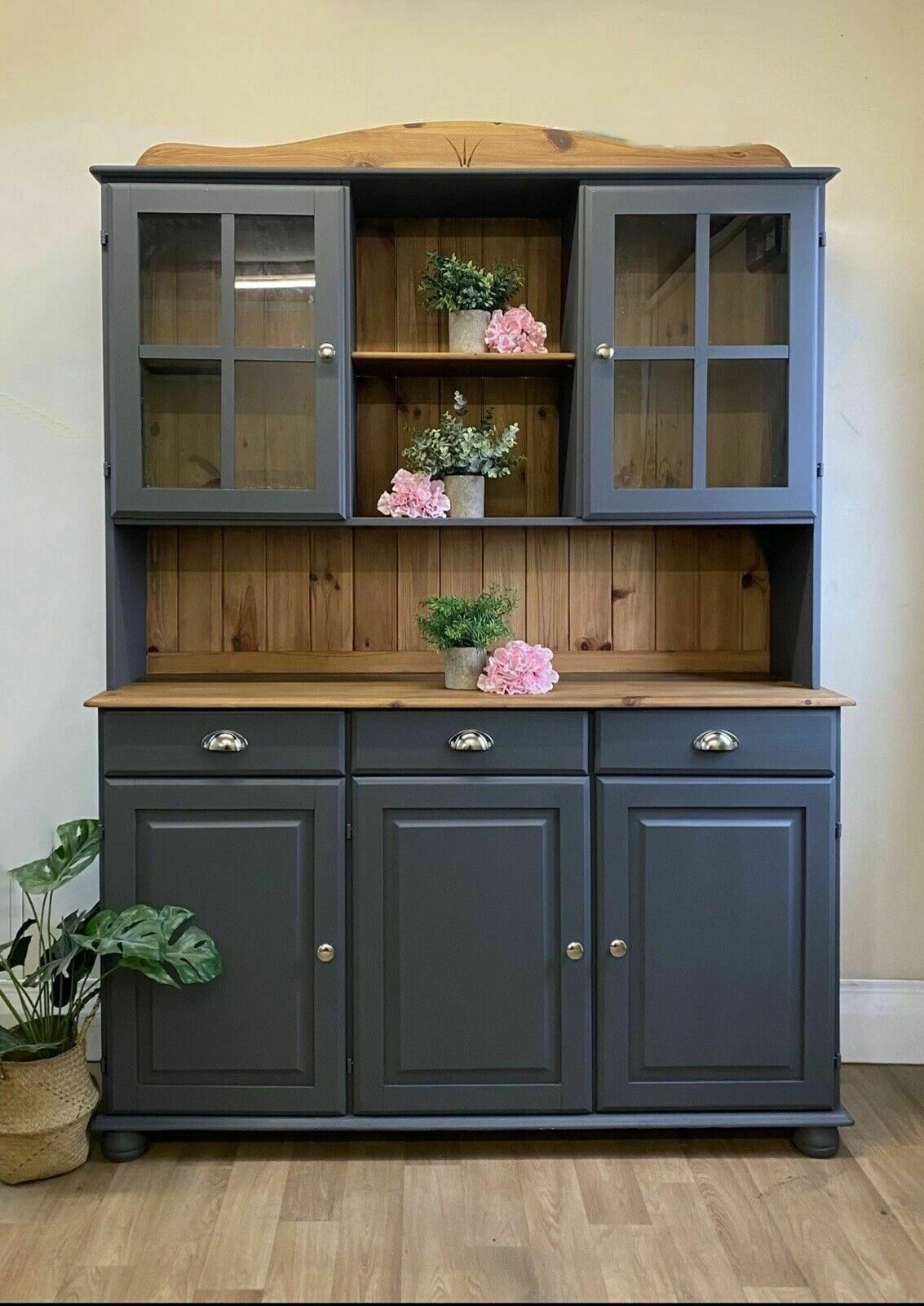 Painted Welsh Dresser Solid Pine Dark Light Grey Sage Green Cream Glazed Cabinet