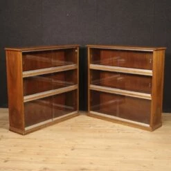 Pair of Italian bookcases from 60s and 70s. Walnut wood furniture fitted with sliding glass doors on a metal track. Vitrines of excellent capacity and service with original glass without breakage or chipping (see photo). Design furniture ideal for use in a living room or studio. Pair of display cabinets of excellent proportion and hard to find. In good condition with some small signs of the time