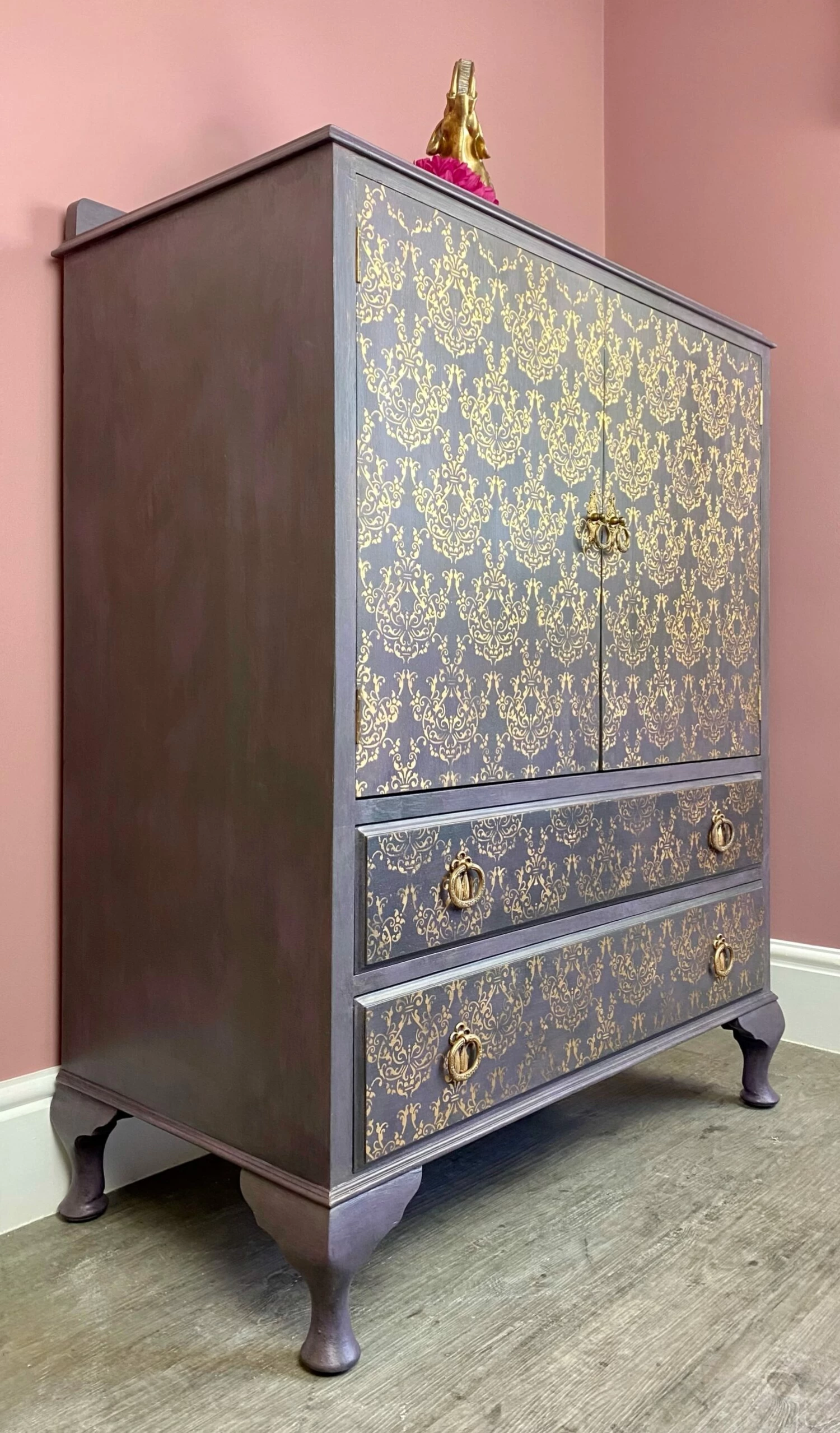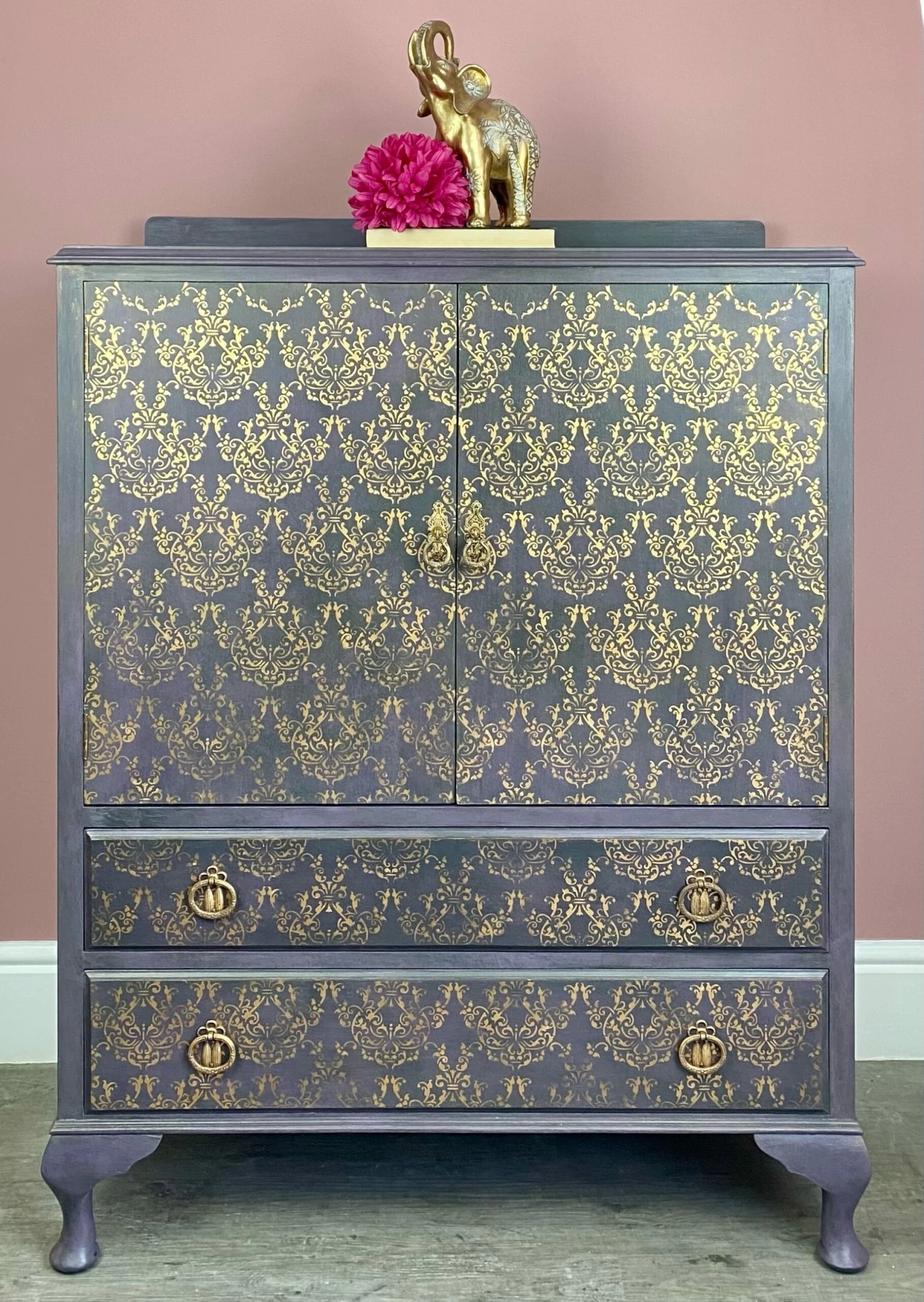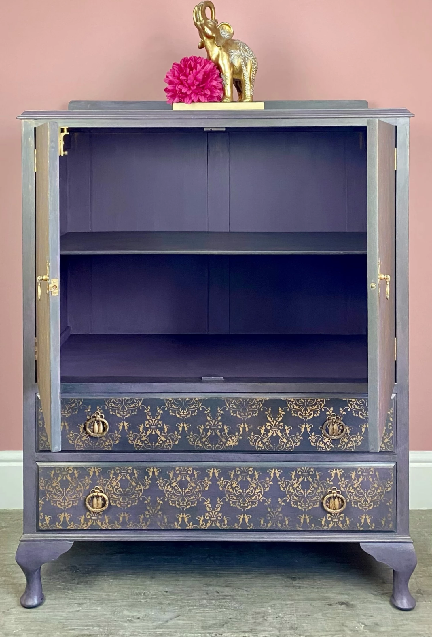 This is a great feature piece for any room offering great storage with a glint of style and elegance from the gold stencil detail. The Cupboard has been painted in Annie Sloan Rodmell ‘purple’ paint with a topcoat wash of Graphite @dark grey’ to give a textured effect. Then the whole piece given a distressed look and then three coats of varnish to seal .All handles and hinges have been highlighted with gilt wax.
