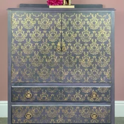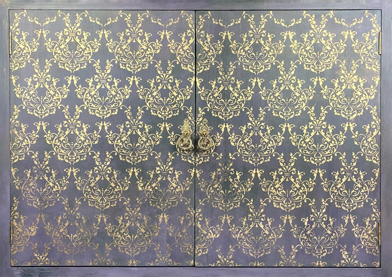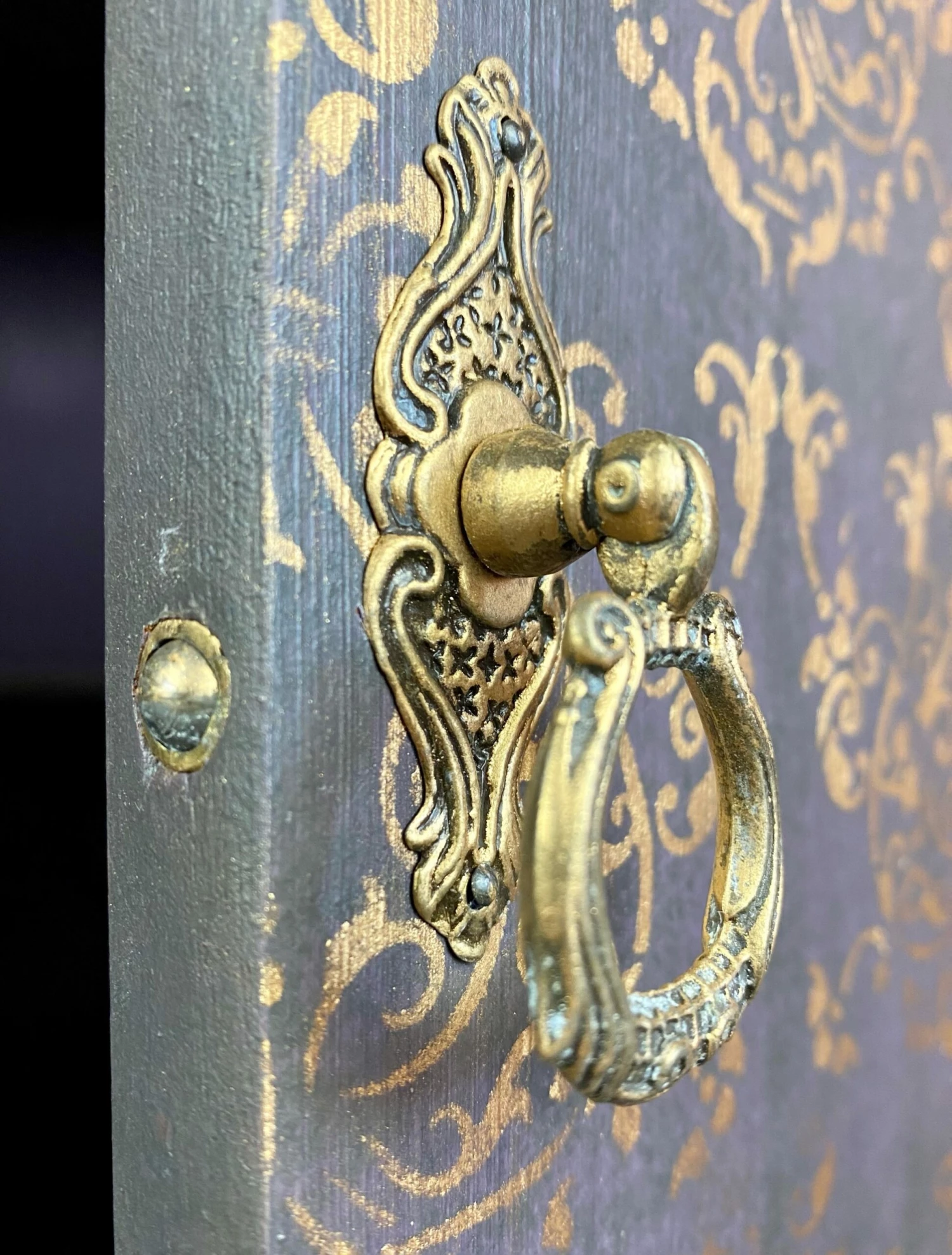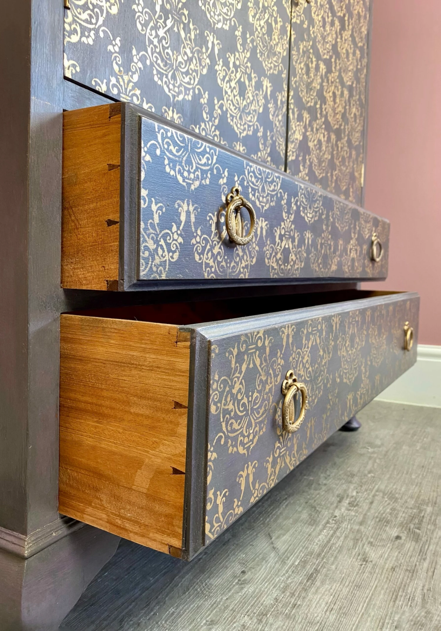 This is a great feature piece for any room offering great storage with a glint of style and elegance from the gold stencil detail. The Cupboard has been painted in Annie Sloan Rodmell ‘purple’ paint with a topcoat wash of Graphite @dark grey’ to give a textured effect. Then the whole piece given a distressed look and then three coats of varnish to seal .All handles and hinges have been highlighted with gilt wax.