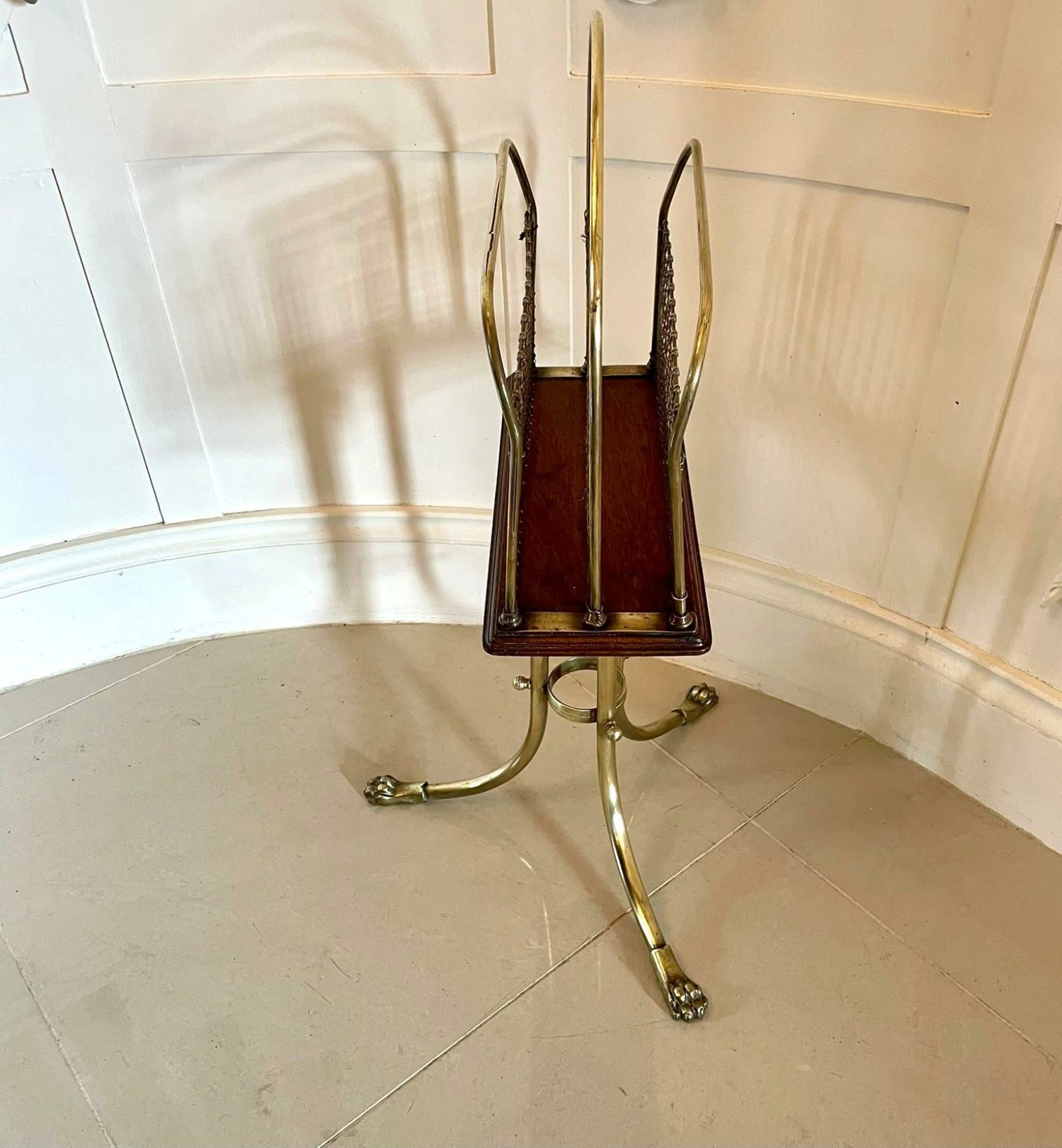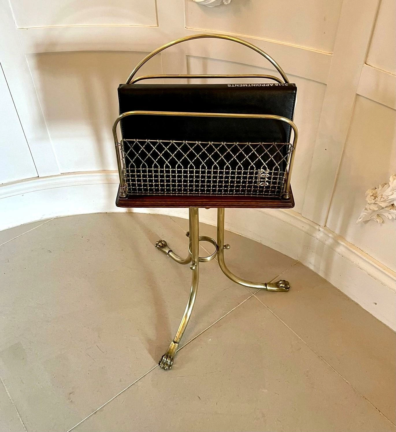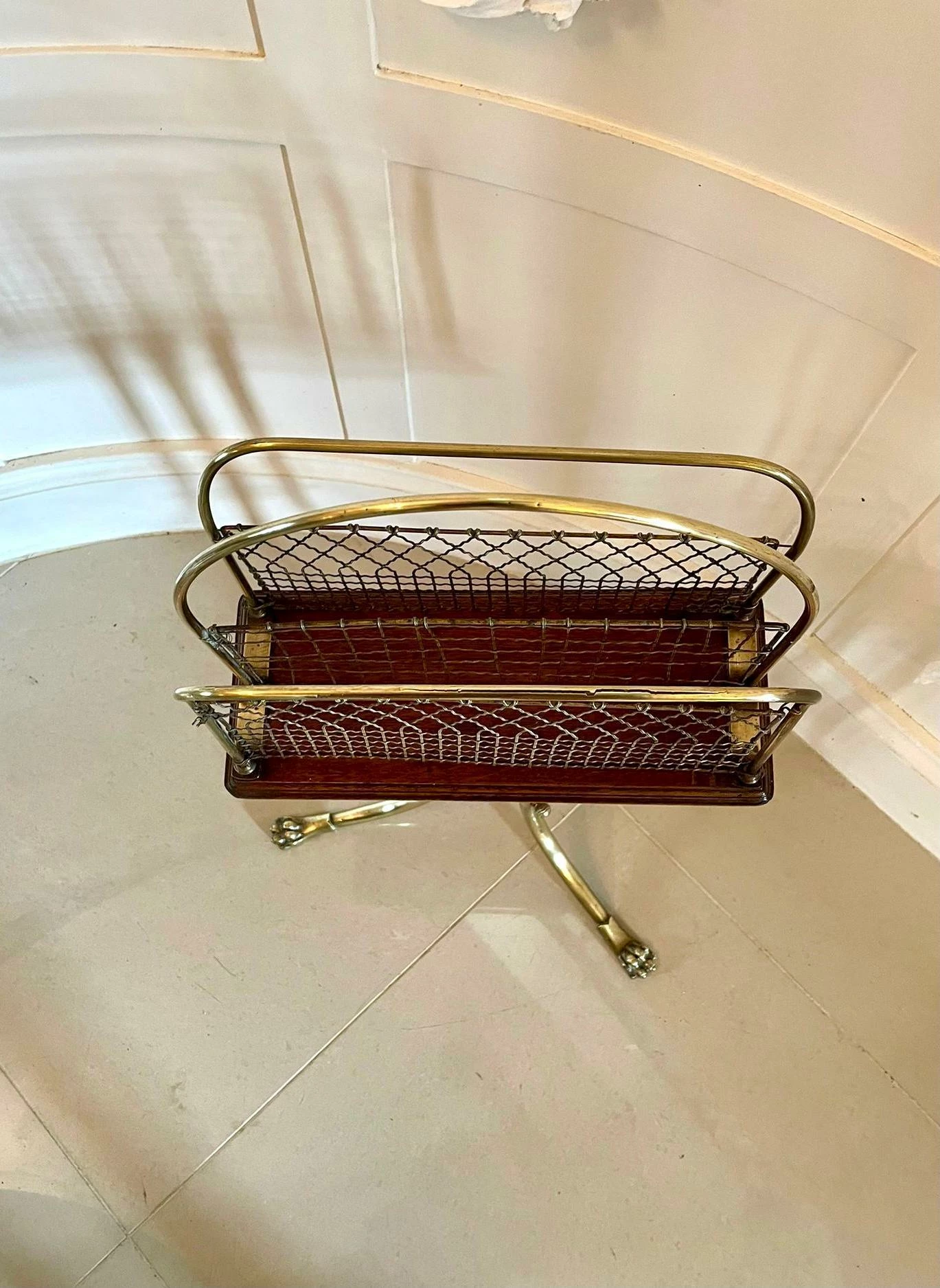 Quality antique Victorian brass and mahogany revolving magazine stand having a shaped brass handle to the centre, two sections for magazines with brass mesh wire on a mahogany revolving base with a moulded edge and supported on three shaped brass legs with claw feet united by a brass ring.
