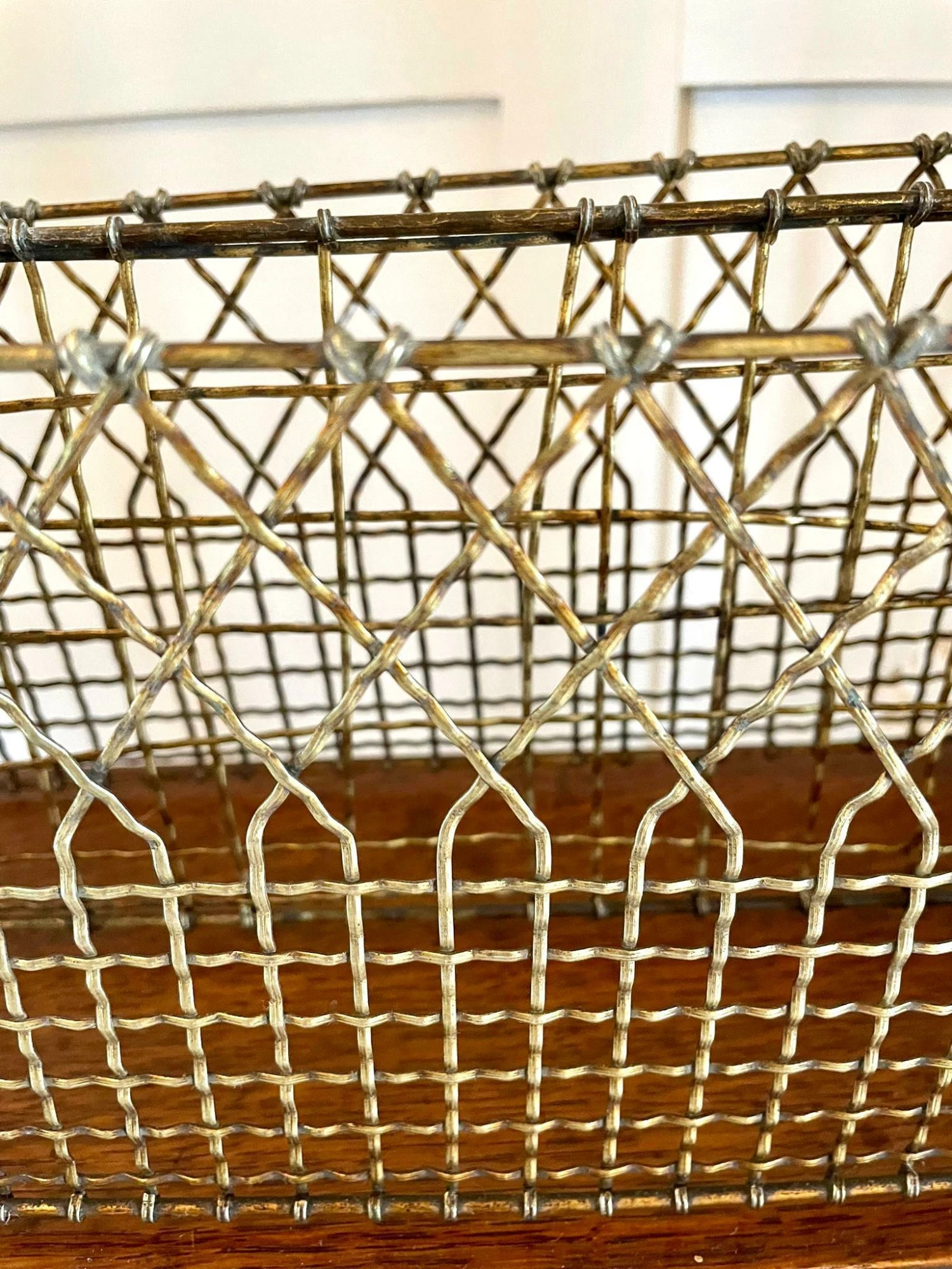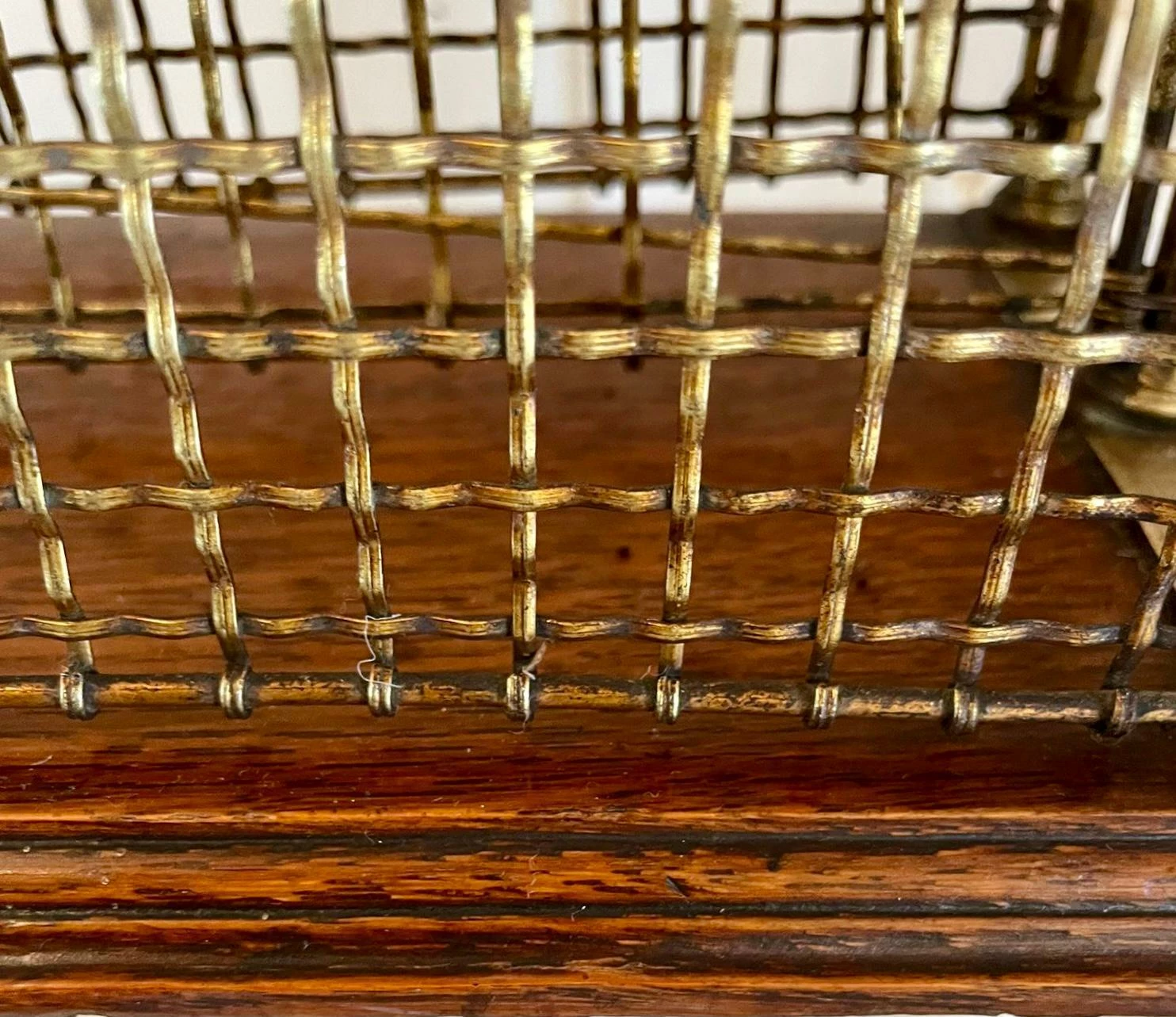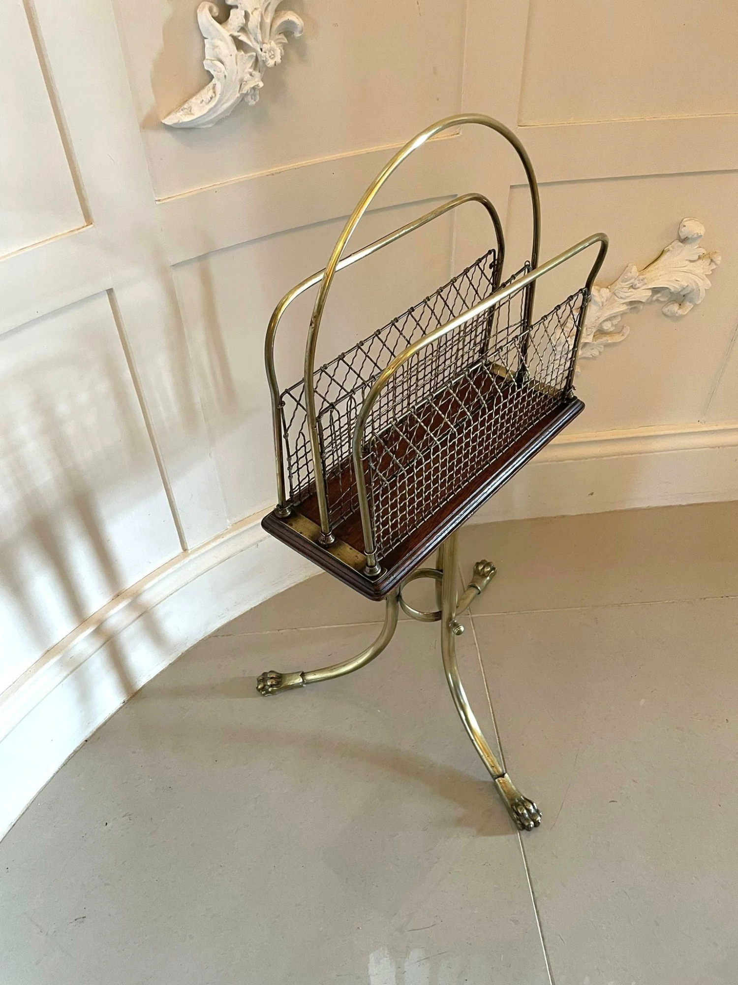 Quality antique Victorian brass and mahogany revolving magazine stand having a shaped brass handle to the centre, two sections for magazines with brass mesh wire on a mahogany revolving base with a moulded edge and supported on three shaped brass legs with claw feet united by a brass ring.