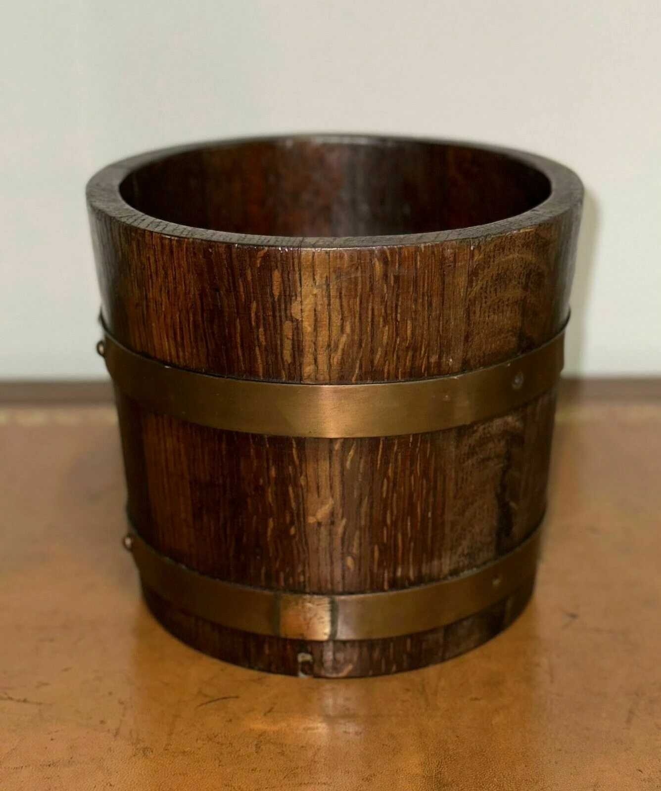 The R A Lister & Co Oak 1900s Edwardian Bucket with Brass Braces is a beautiful and unique piece of antique furniture. It is a wooden bucket made from high-quality oak, which was a common material used in furniture making during the Edwardian era.
