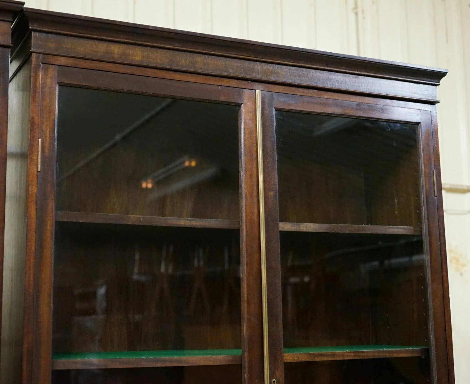 A very good looking and rare set of four Oxford Library bookcases, they are the finest quality and will look absolutely amazing in any setting. The shelves are all height adjustable and upholstered wise green baize which can of course be removed