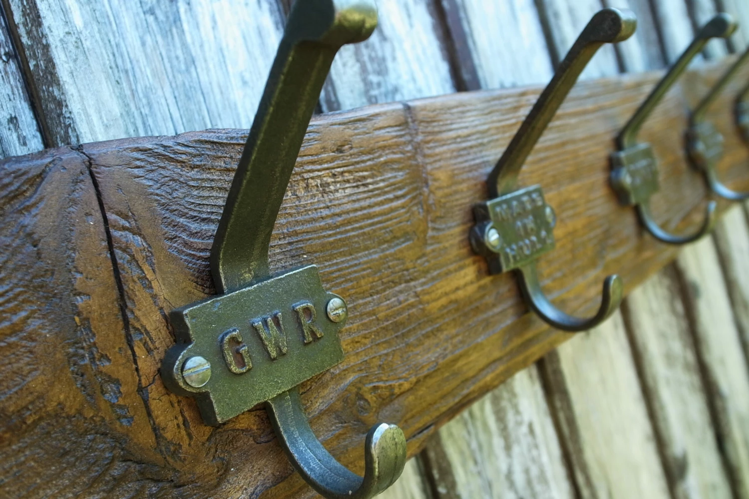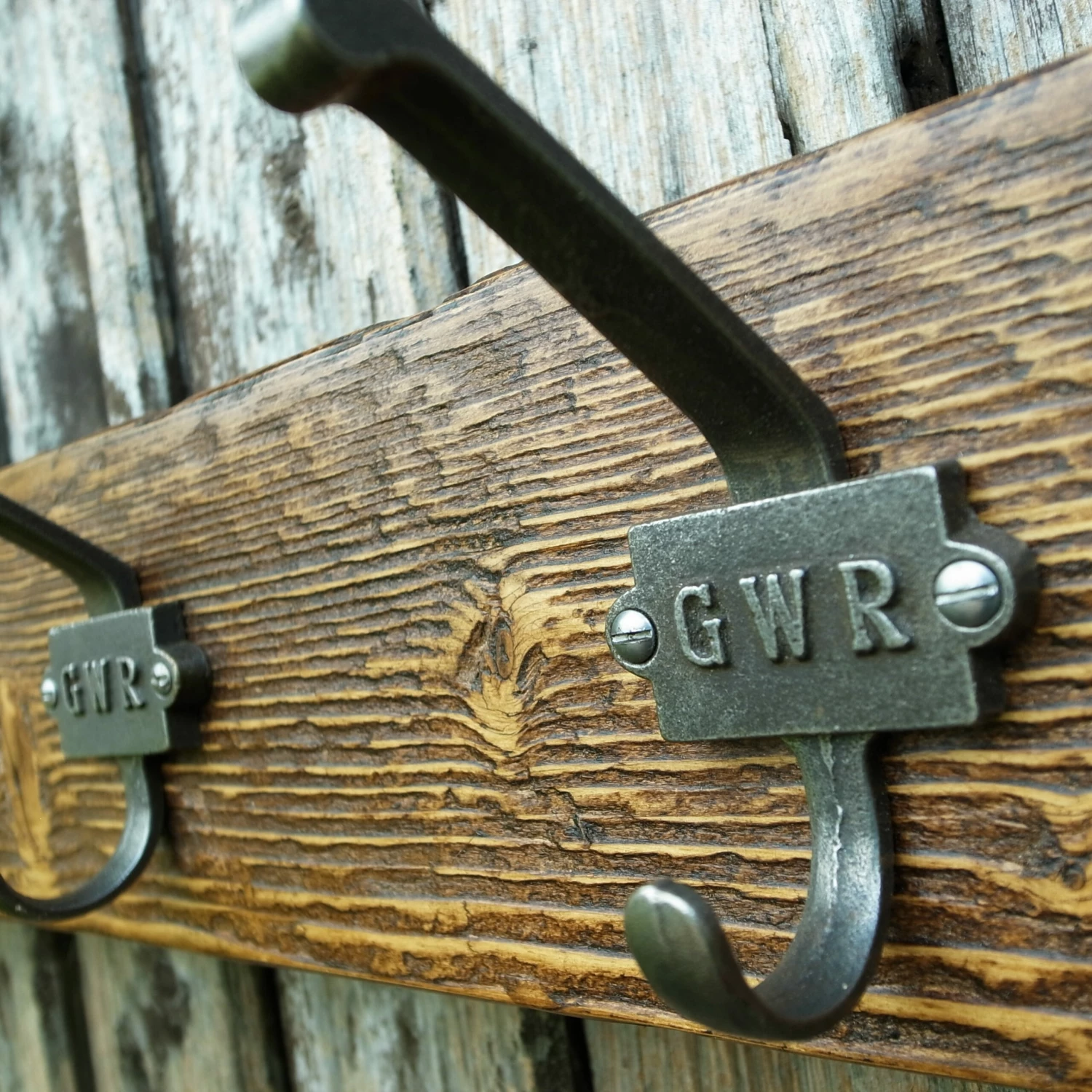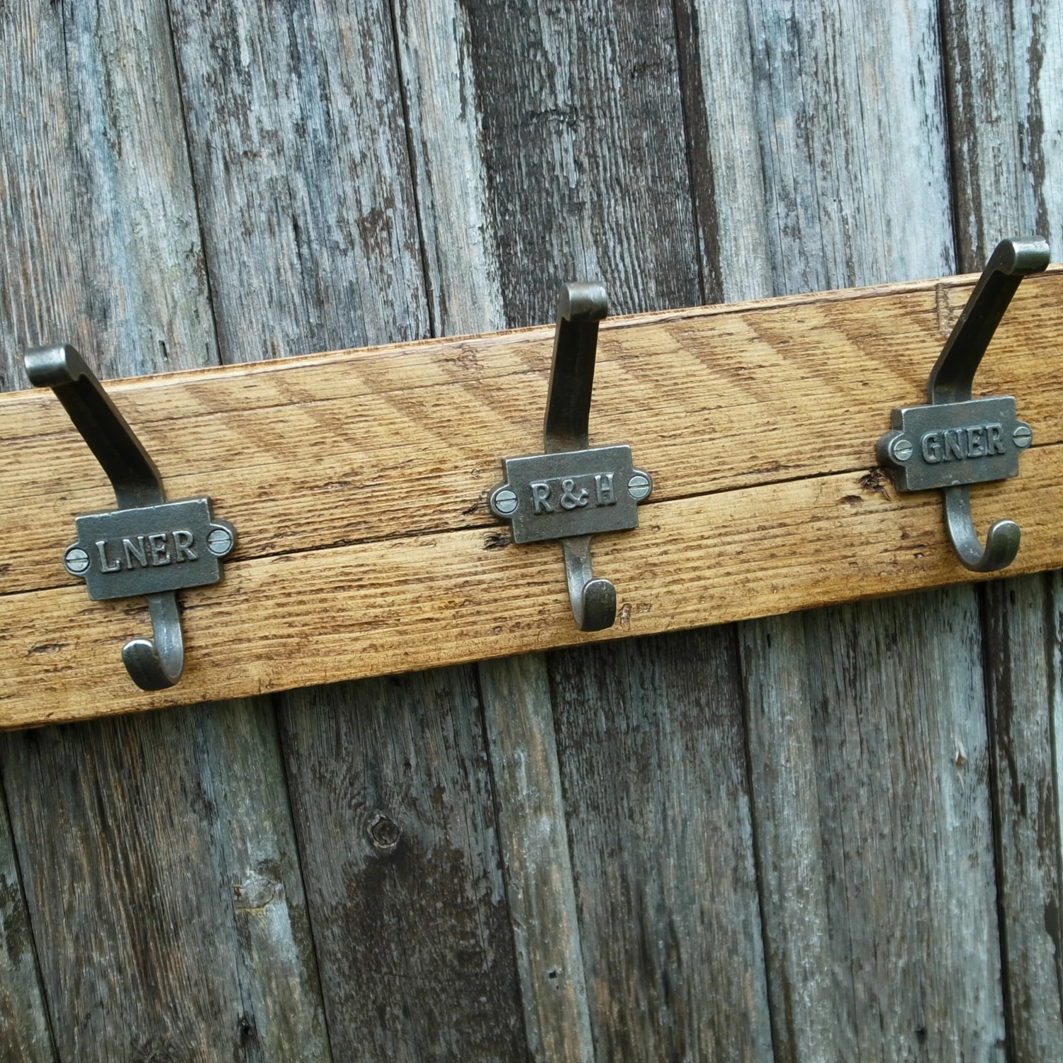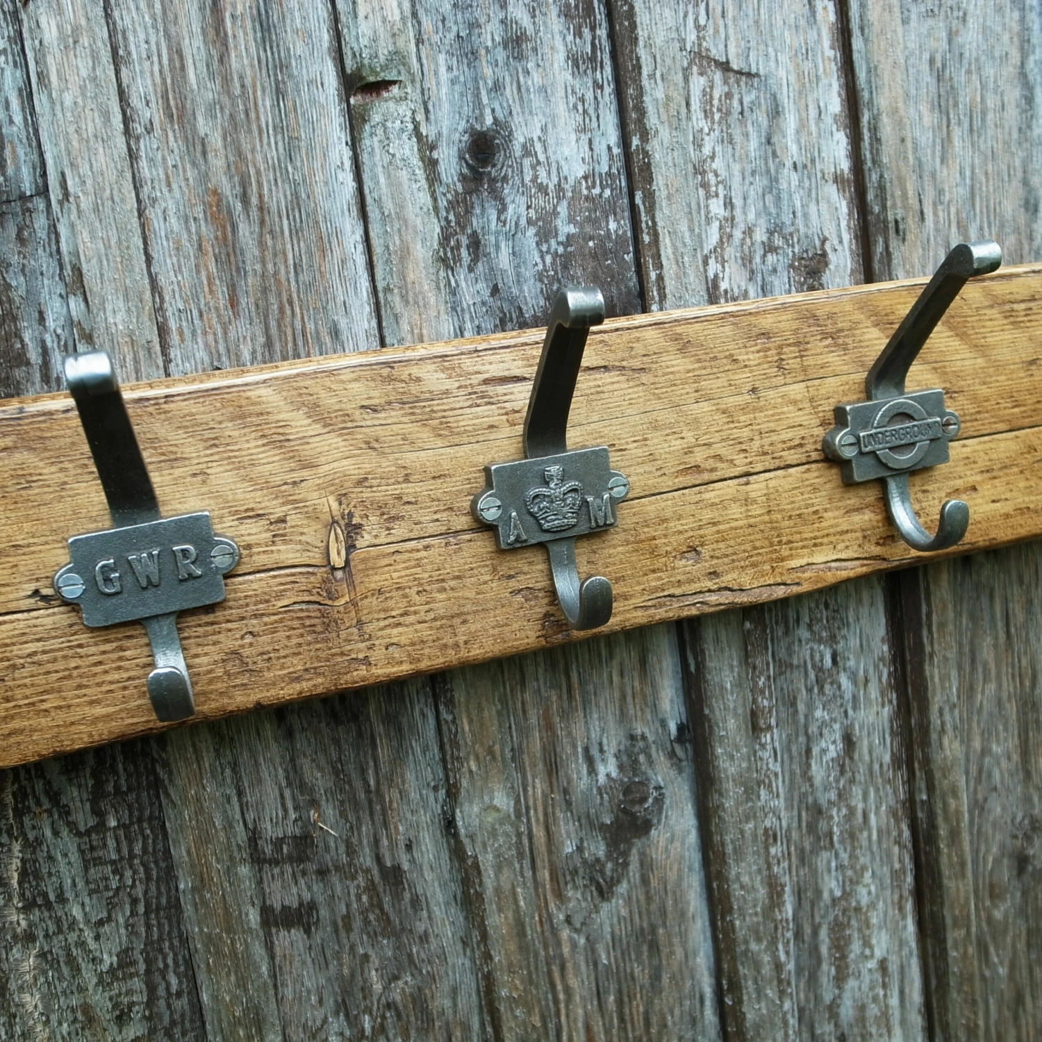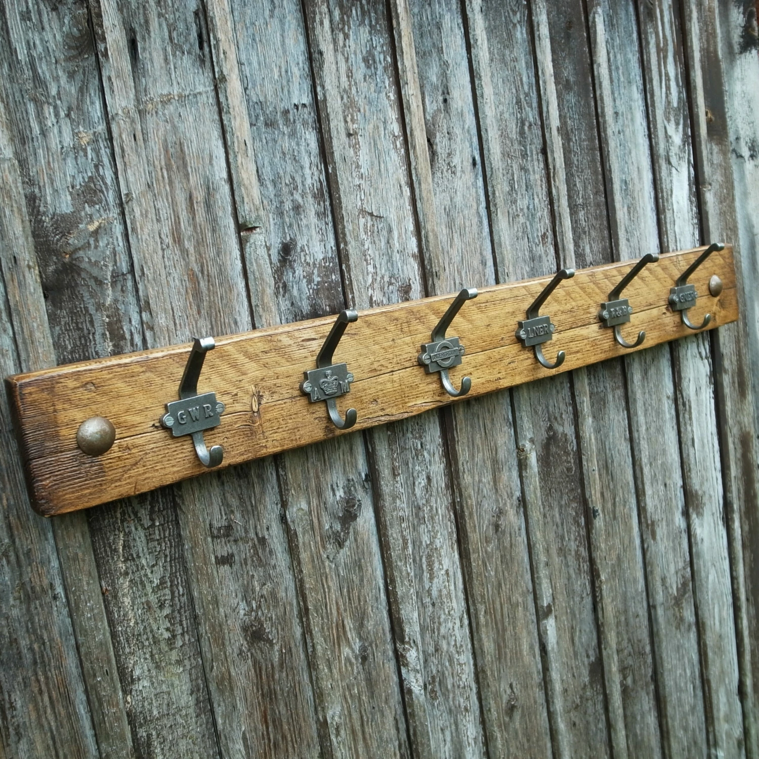 A rustic wooden coat rack in reclaimed upcycled timber with 6 robust cast iron hooks in a mixture of vintage industrial transport themed designs.