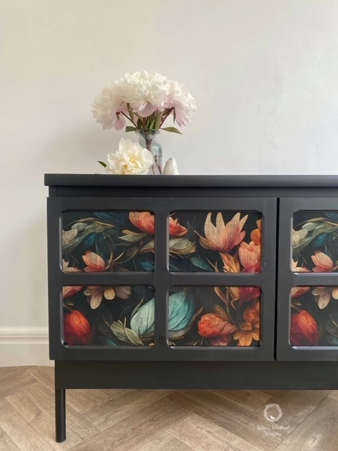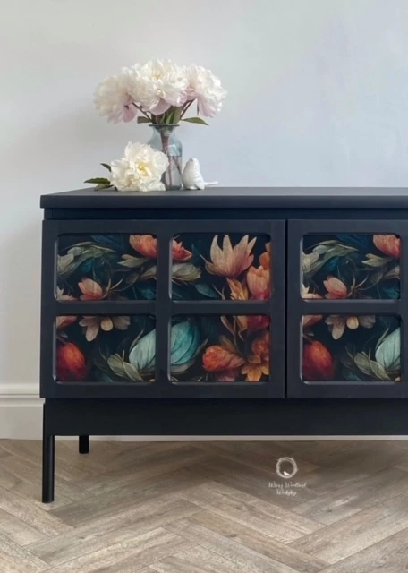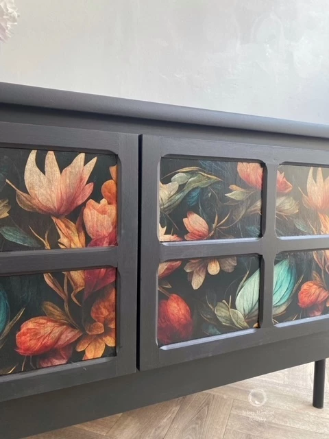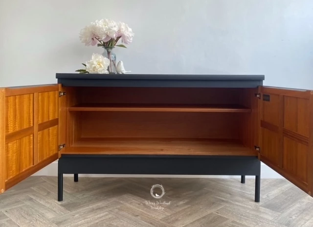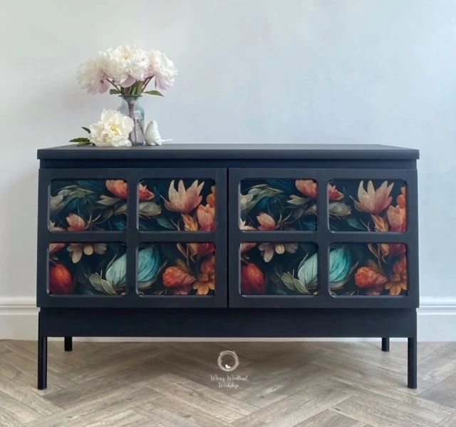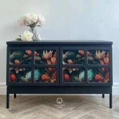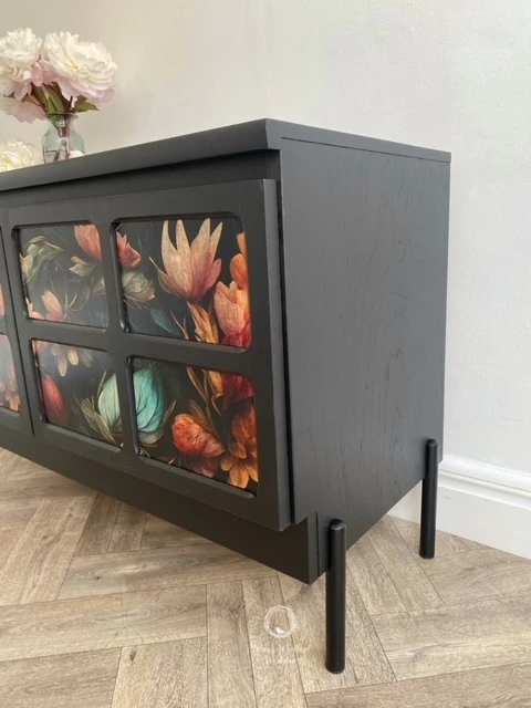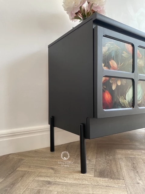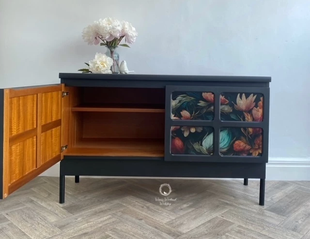 This wonderful Nathan sideboard has been painted in ‘Coal Black’ by Fusion Mineral Paint and then a beautiful floral ‘MINT by Michelle’ floral paper has been decoupaged onto the doors. The whole piece has been sealed for protection. The inside of the piece has not been painted and is in good condition. There is one shelf inside and the Nathan label is displayed on the right hand door as you open it. New black legs have been added to give the piece some height.