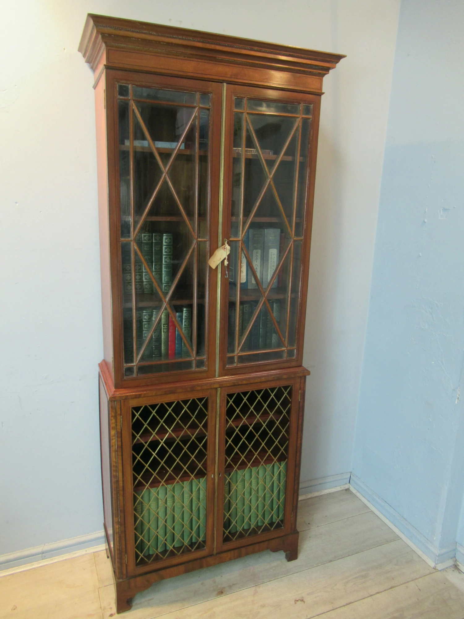 Regency style mahogany bookcase , slim size and will split into two sections . The top with a flared cornice, and two glass doors with wood trim, two doors to the base both with open brass diamond shaped grille. This could be fitted with a panel with material to the back of the doors to enclose them if required.