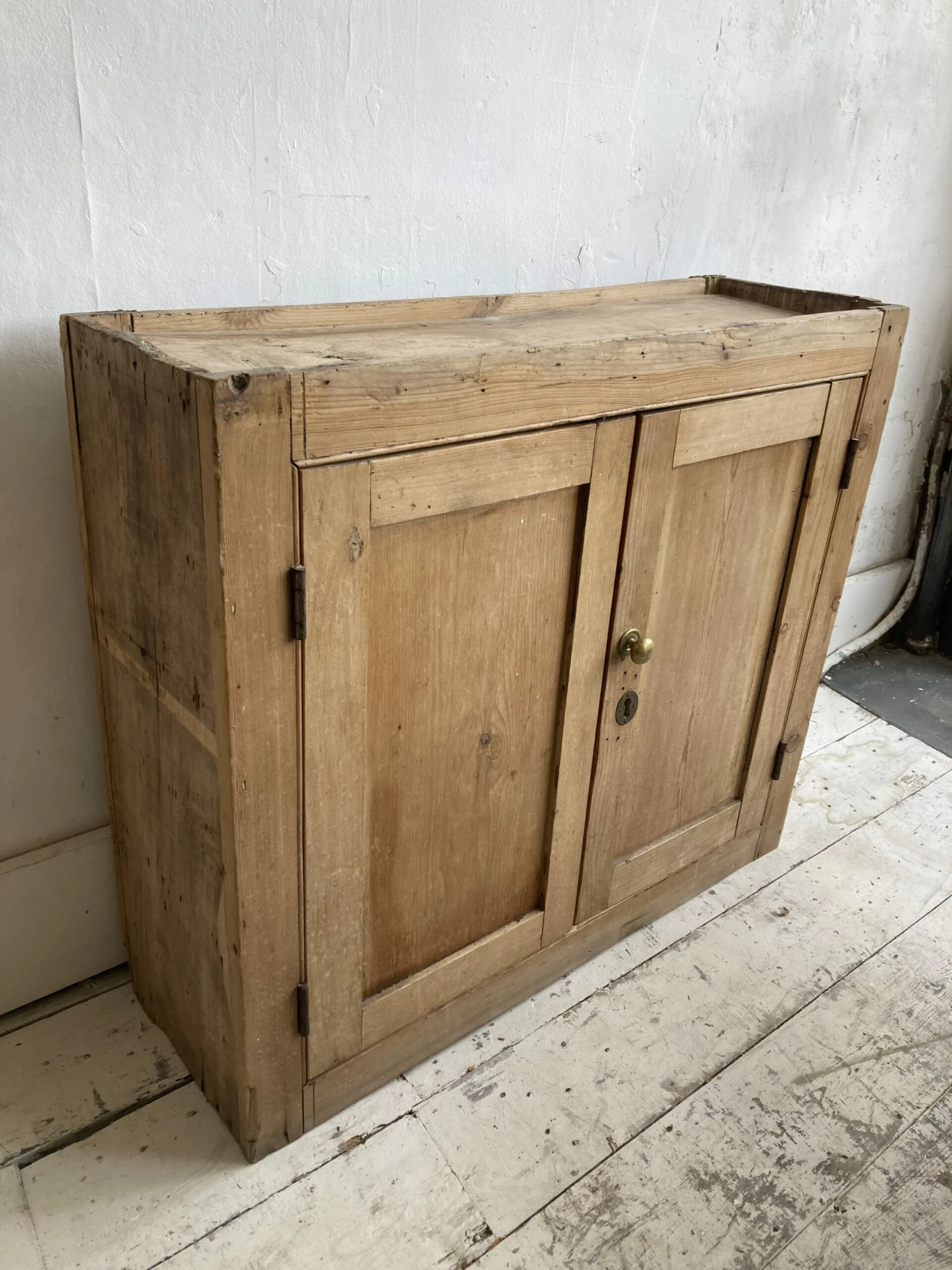 A lovely charatureful Victorian elm and pine wall or floor cupboard. This has a great rustic look and nice elm shelves inside with plain pine doors. Old brass knob and escutcheon on door. A few old holes etc here and there. A nice piece of storage.