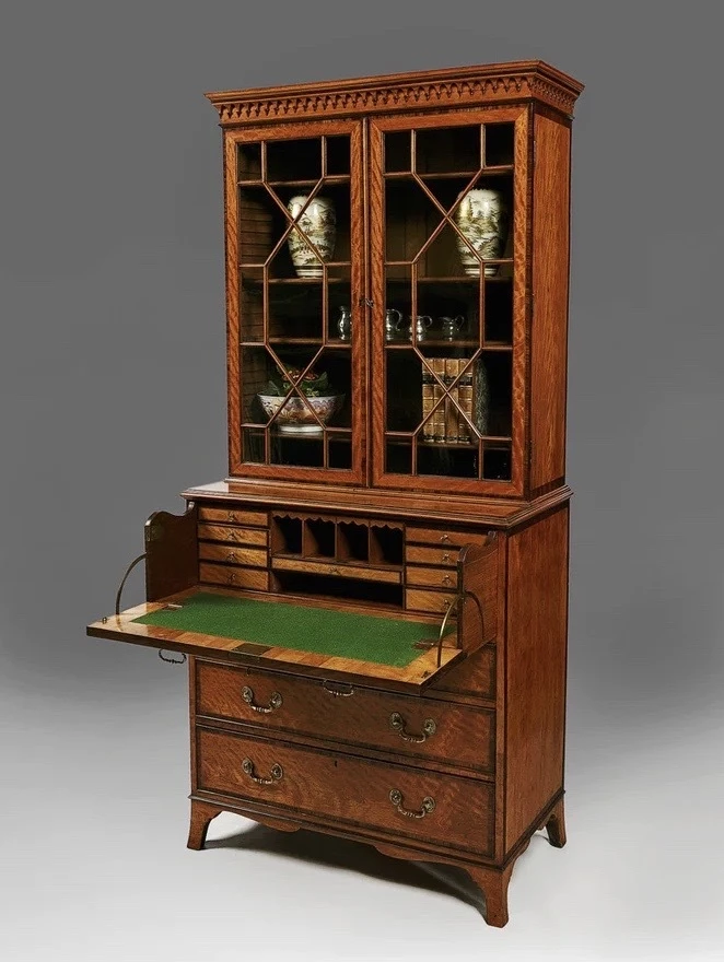 A very fine example of a George III Sheraton Period West Indian Satinwood Secretaire Bookcase of museum quality, firmly attributed to Gillows of Lancaster, England. Last quarter of the Eighteenth Century.