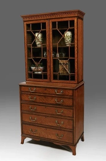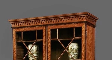The upper section fitted with a pair of glazed doors with stylish geometric glazing bars and surmounted by an inlaid Gothic style dental separate pediment