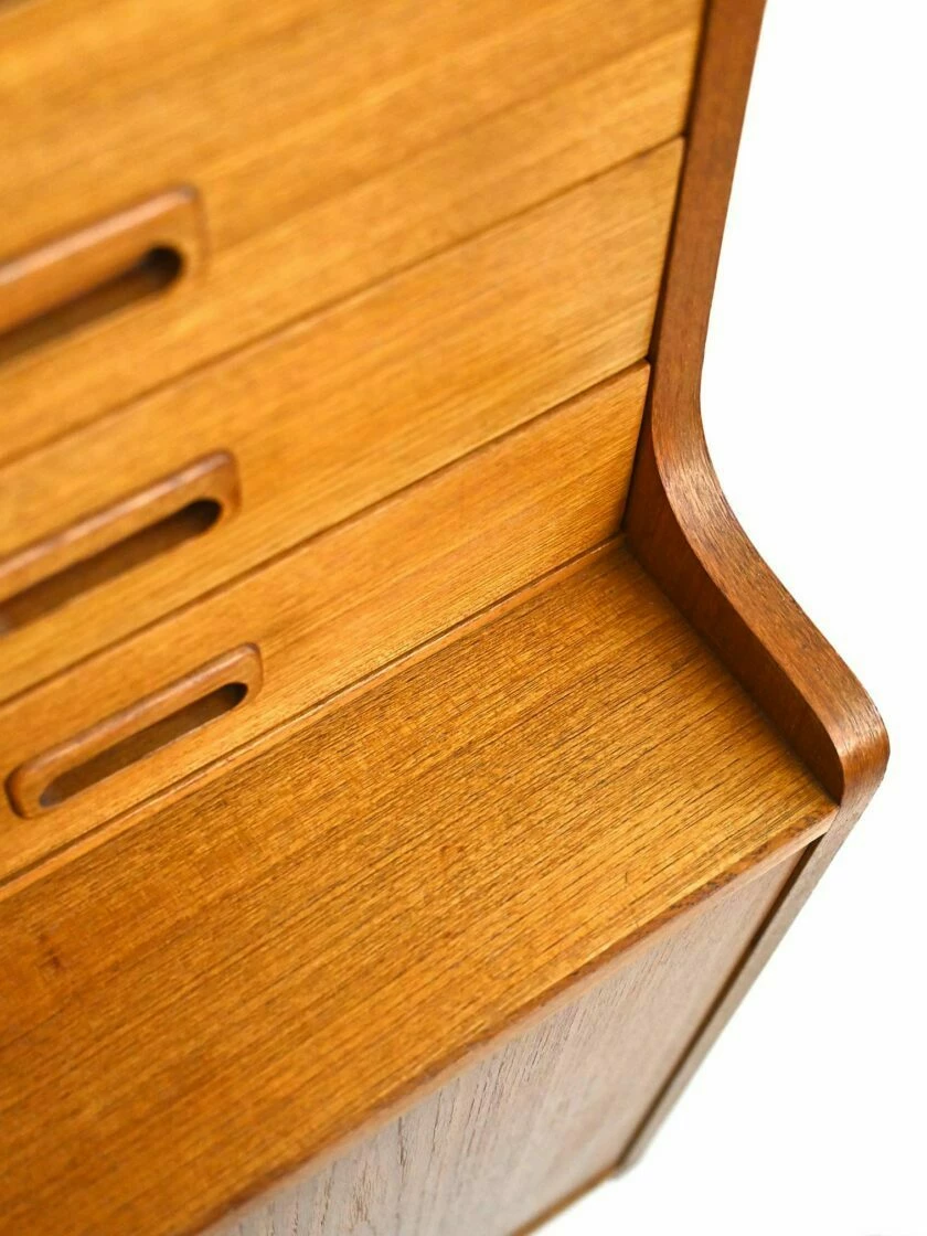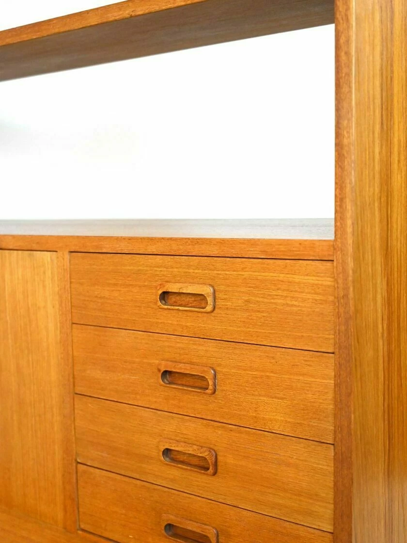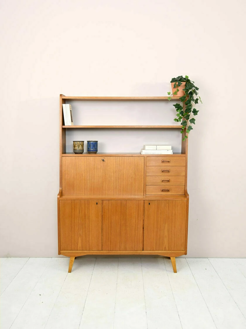 In the lower part, the three hinged doors enclose a container compartment with a shelf on one side and a small space and two drawers on the other.