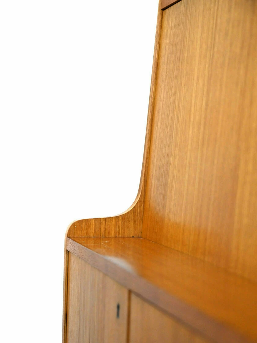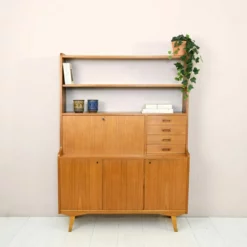 In the upper part there are shelving and a drop-down top that transforms into a comfortable desk if necessary.