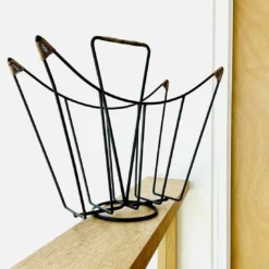 A sculptural 1950s Metal Magazine Rack, with stylish twisted rattan detail to the corners and handle.