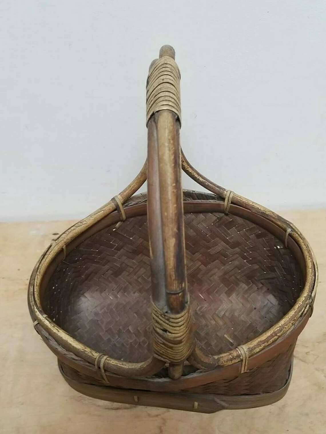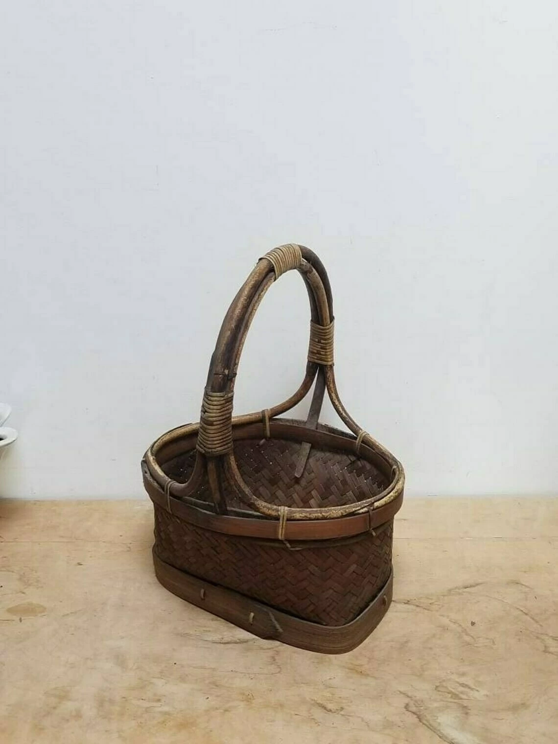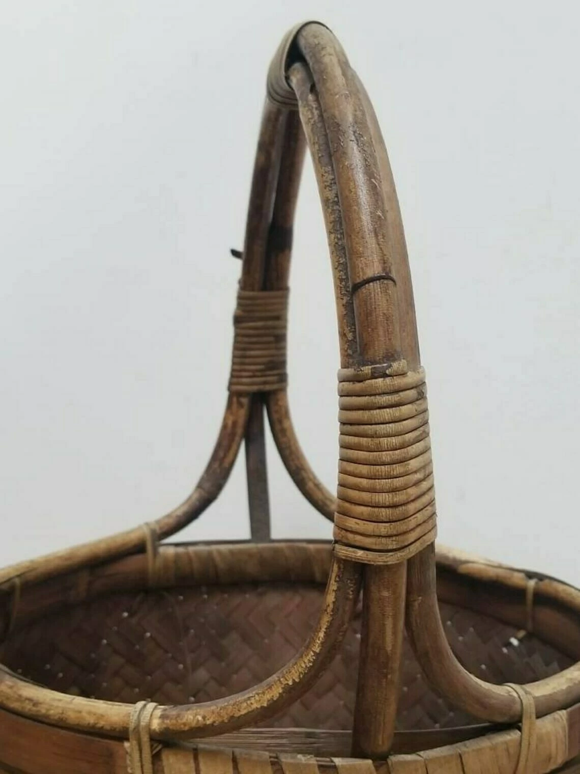 A lovely and unusual little French vintage woven market basket. The basket section is quite small in comparison to the height of the handles. The handles structure is wood that has been shaped and also forms the rim of the basket. There is a wooden strap around the bottom of the basket to keep the structure strong. I’ve never seen one quite like this.