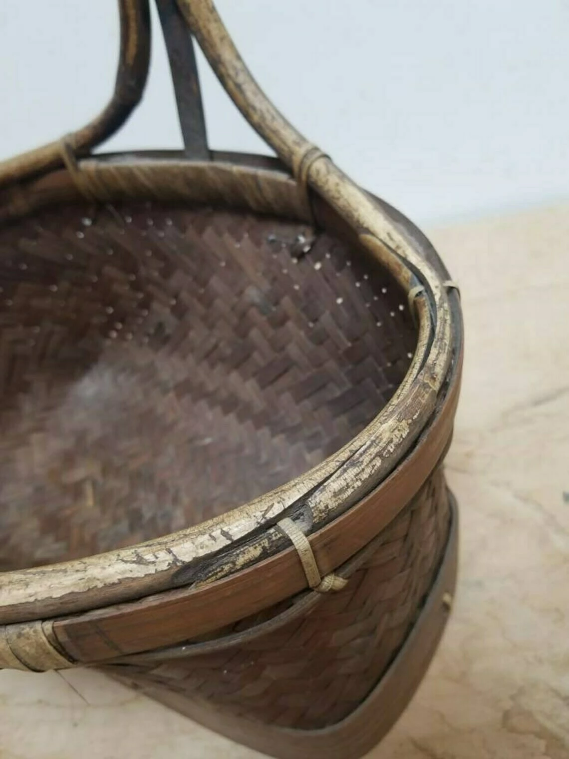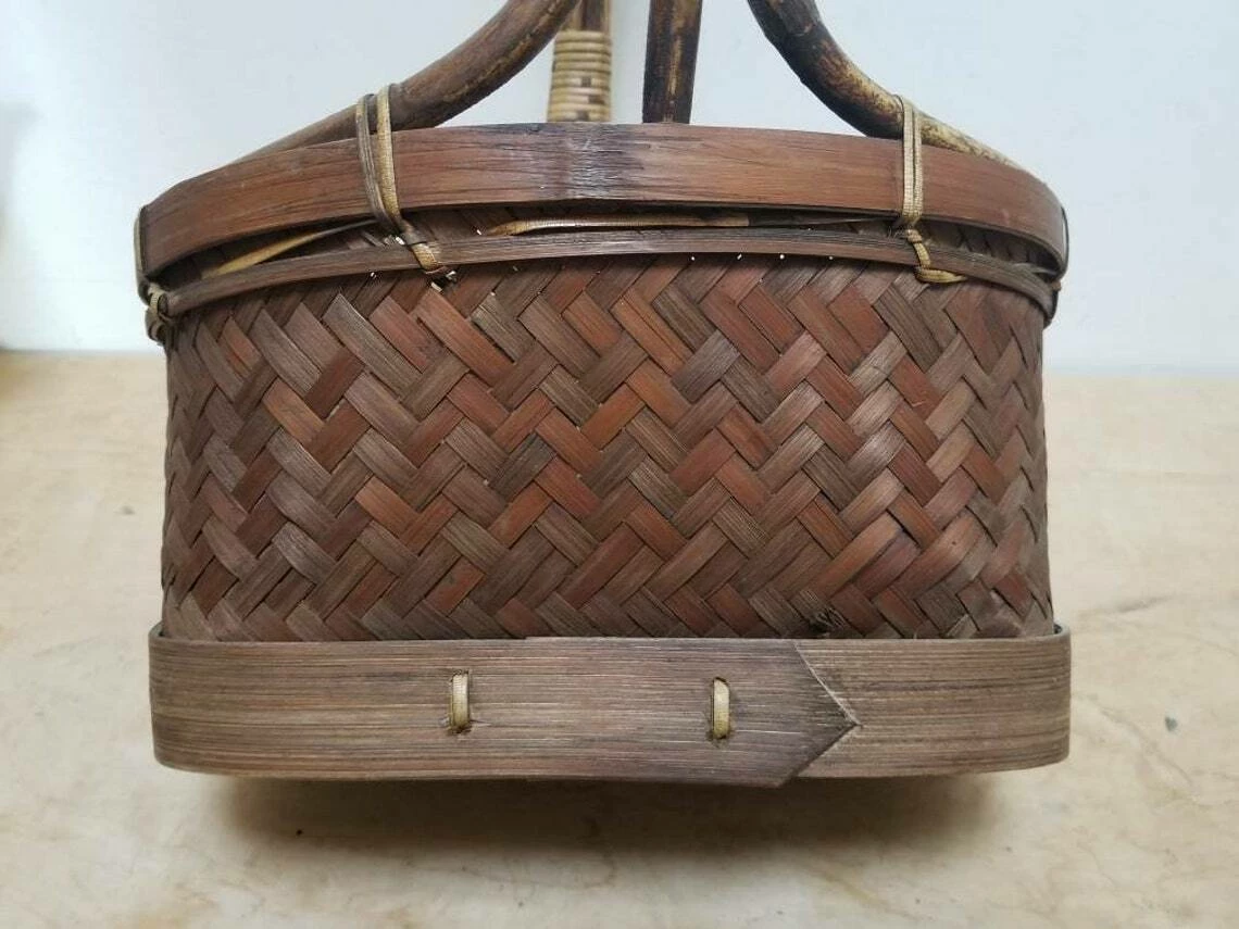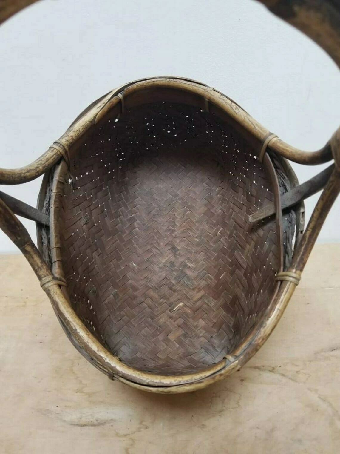 A lovely and unusual little French vintage woven market basket. The basket section is quite small in comparison to the height of the handles. The handles structure is wood that has been shaped and also forms the rim of the basket. There is a wooden strap around the bottom of the basket to keep the structure strong. I’ve never seen one quite like this.