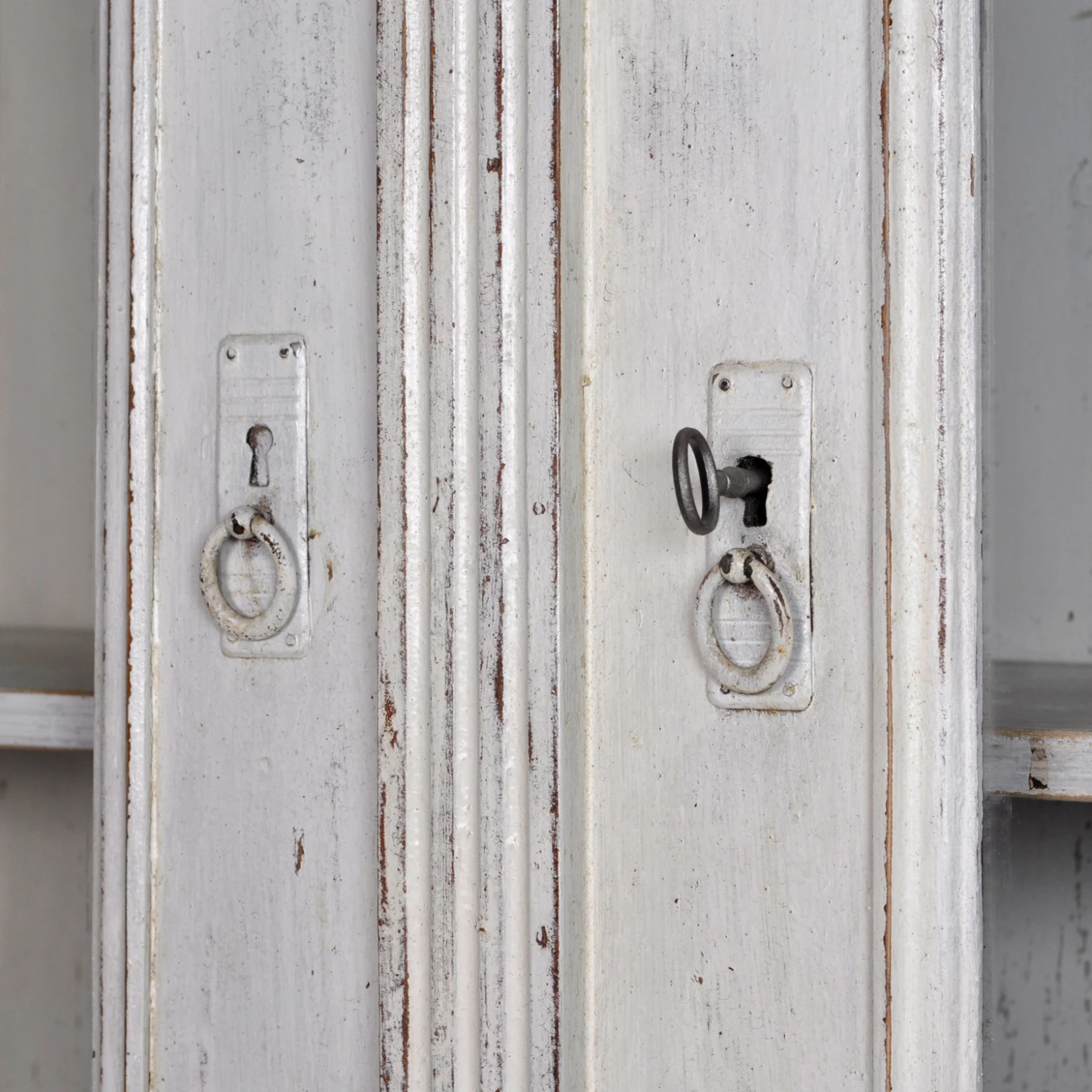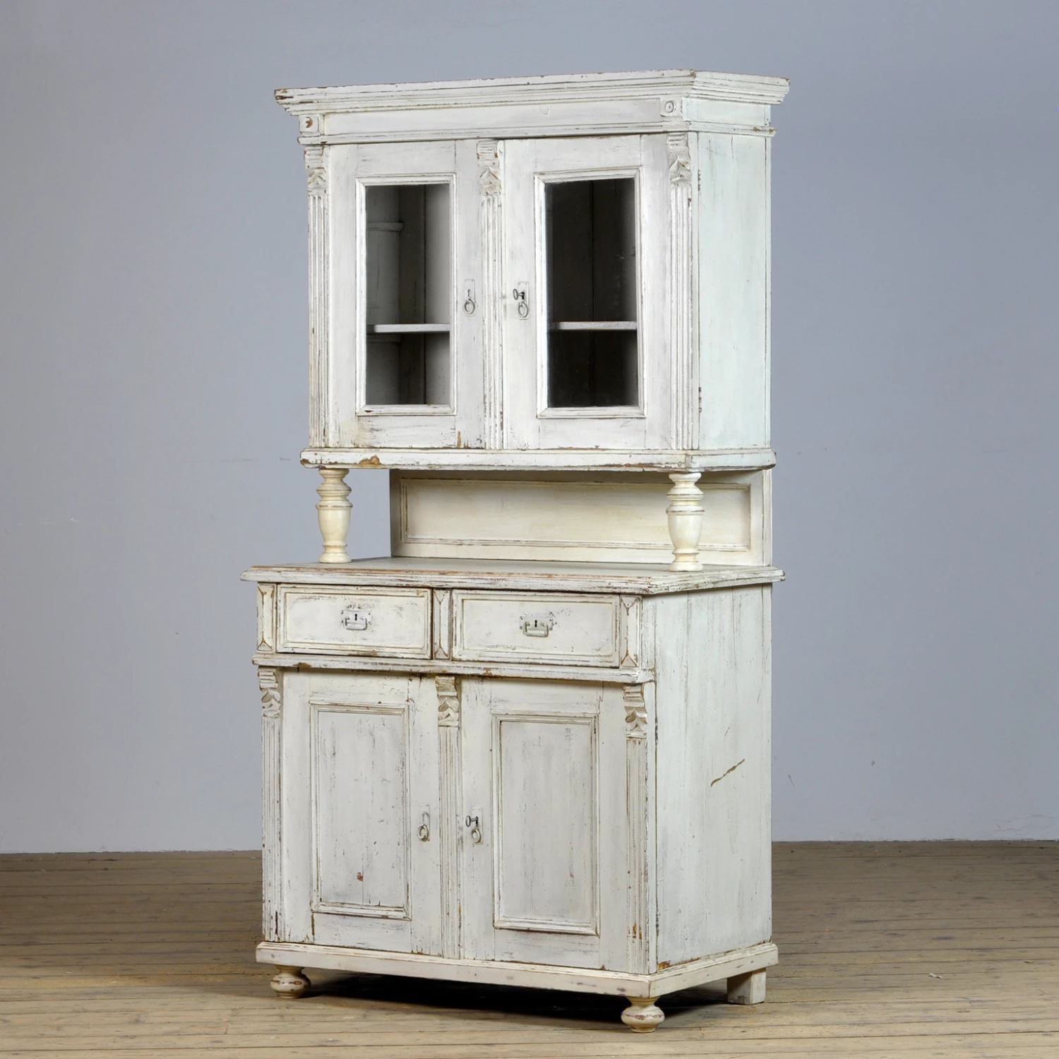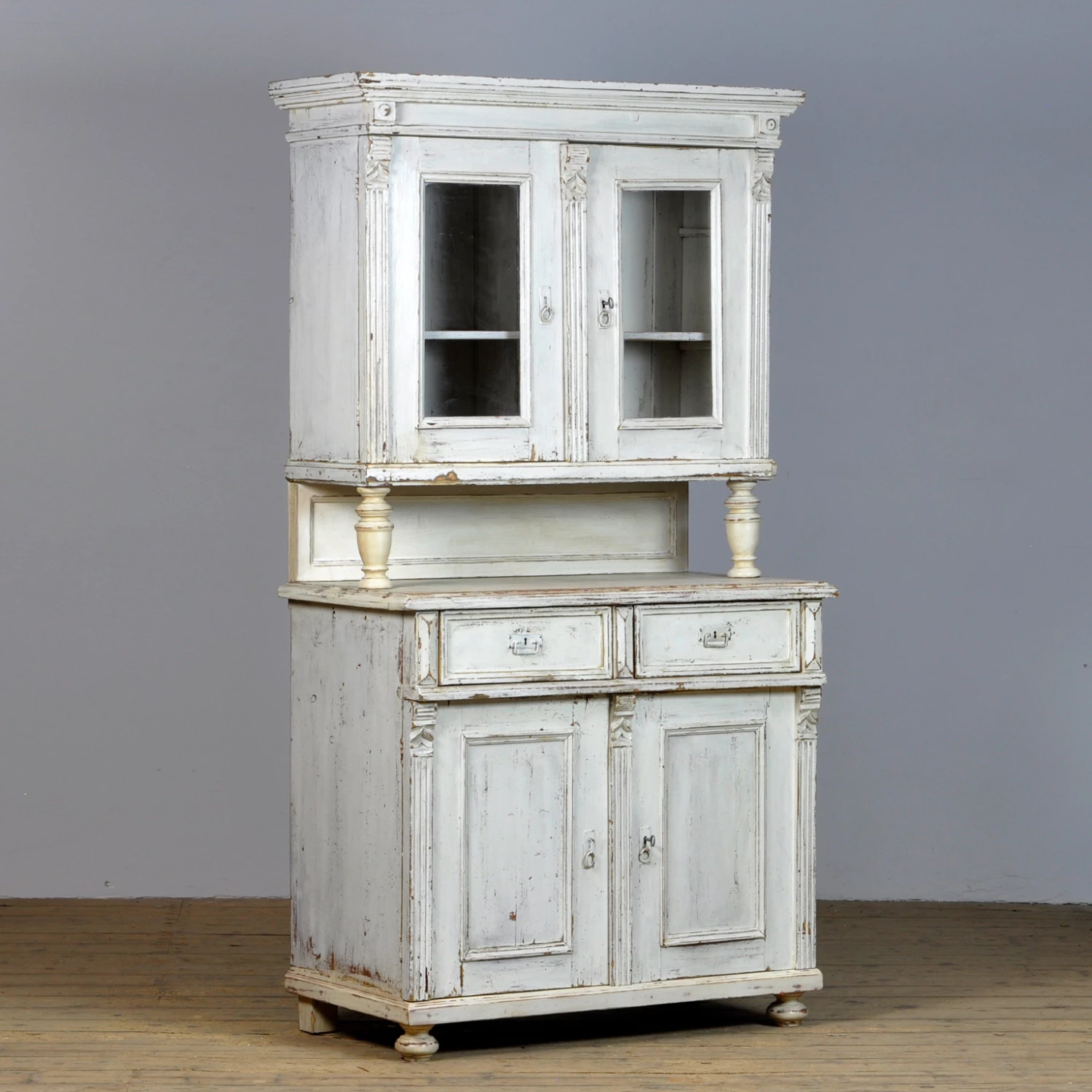 Large pine cupboard from the 1920s. The cabinet consists of 2 separate parts. In the upper part 2 doors with one shelf. At the bottom 2 drawers above and 2 doors with a shelf for plenty of storage space. Original paint.