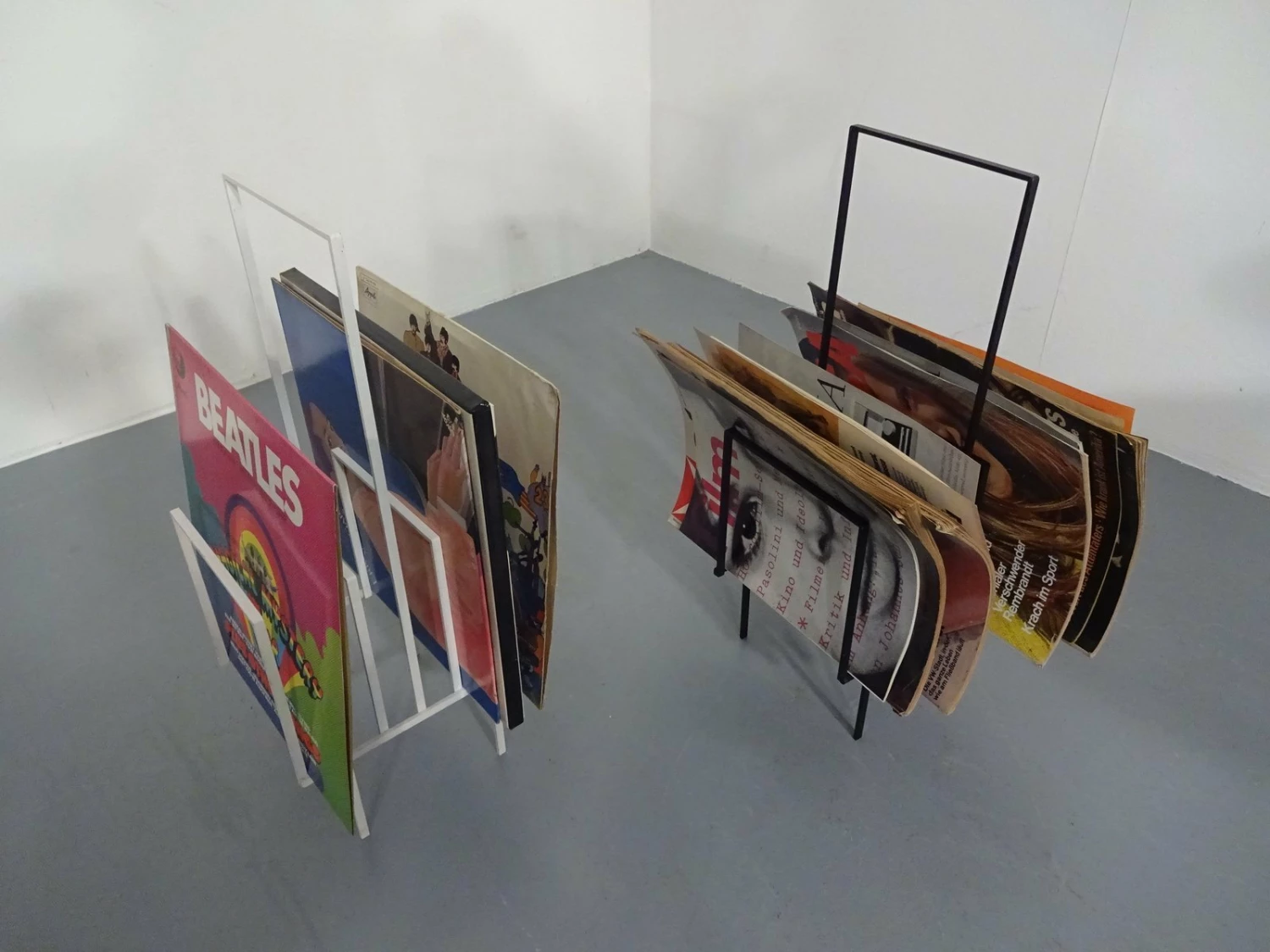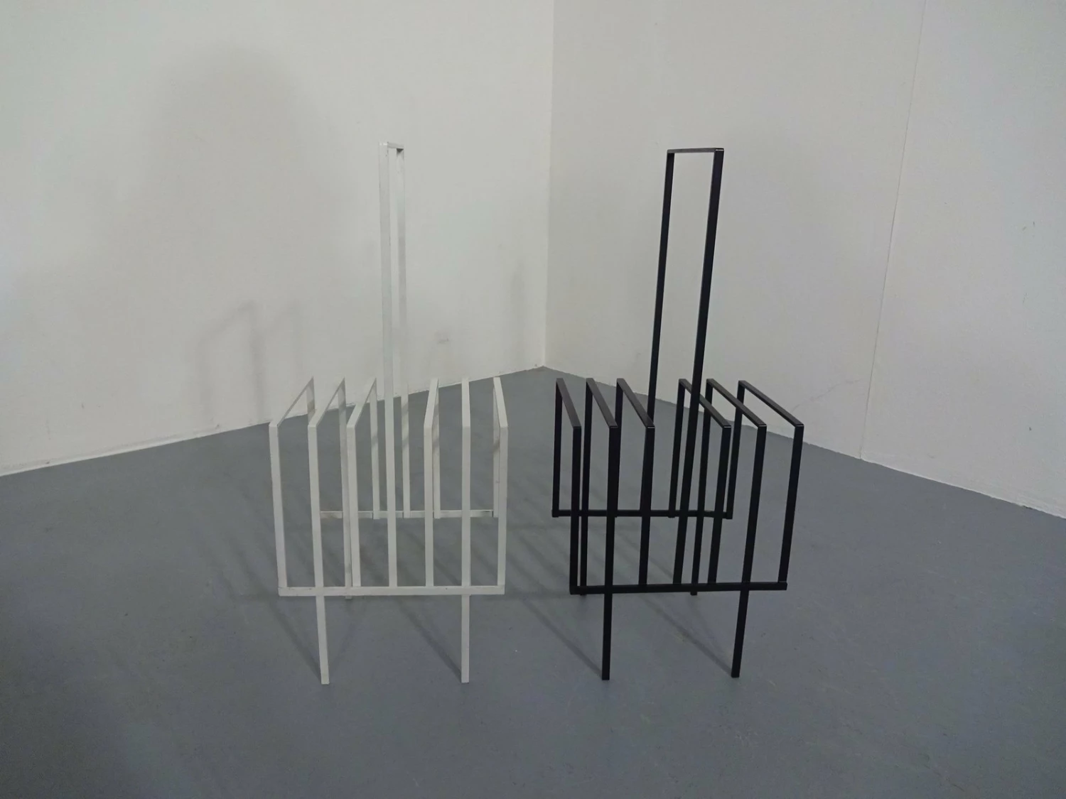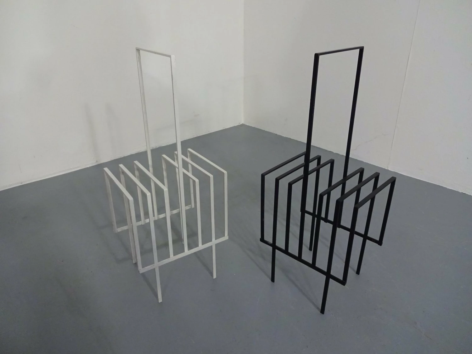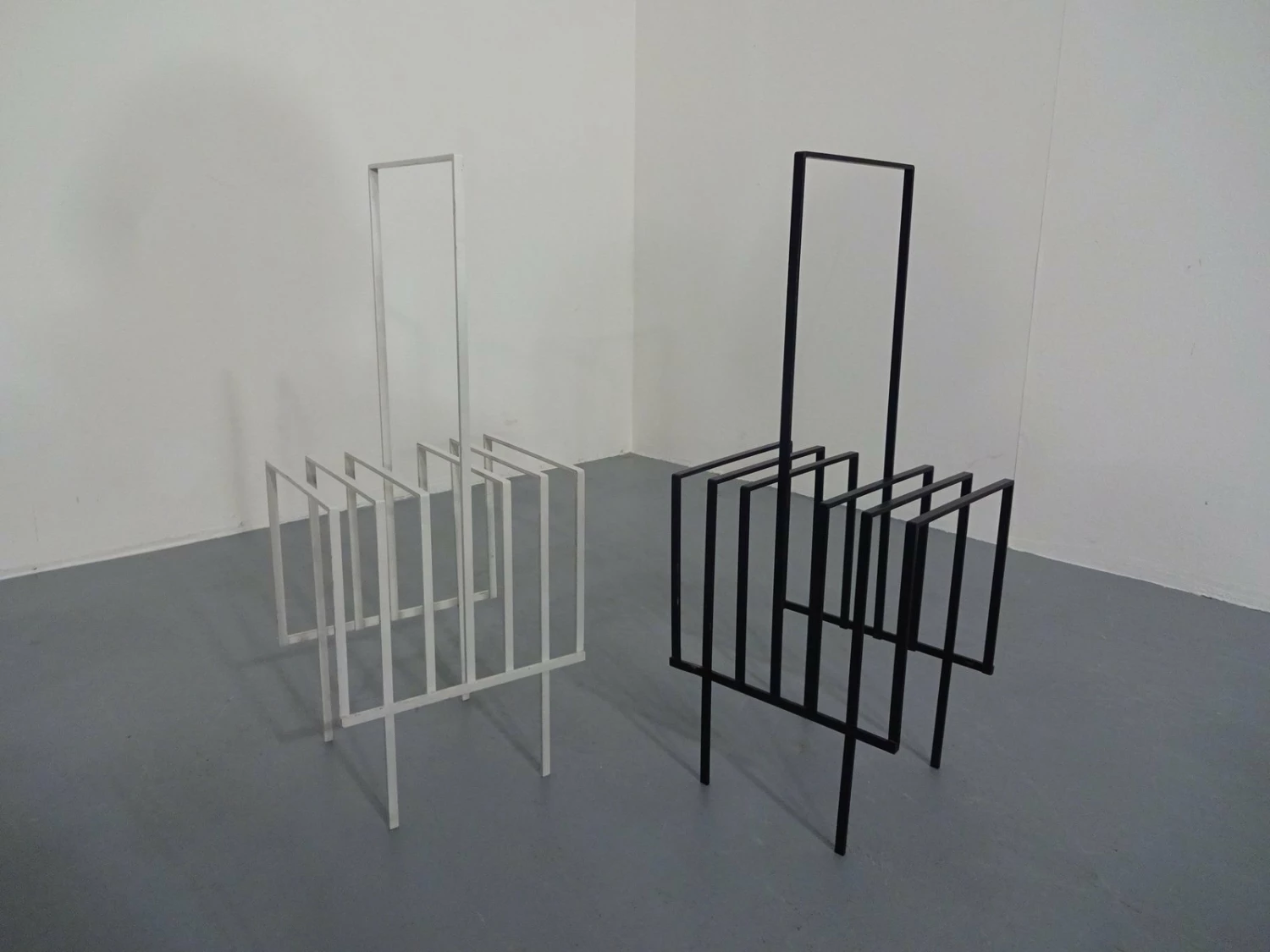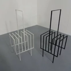 Purist newspaper stands or LP stands in lacquered steel. Available in black and white.