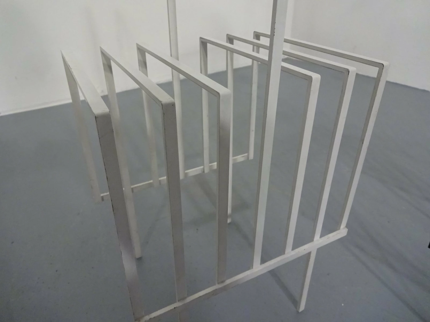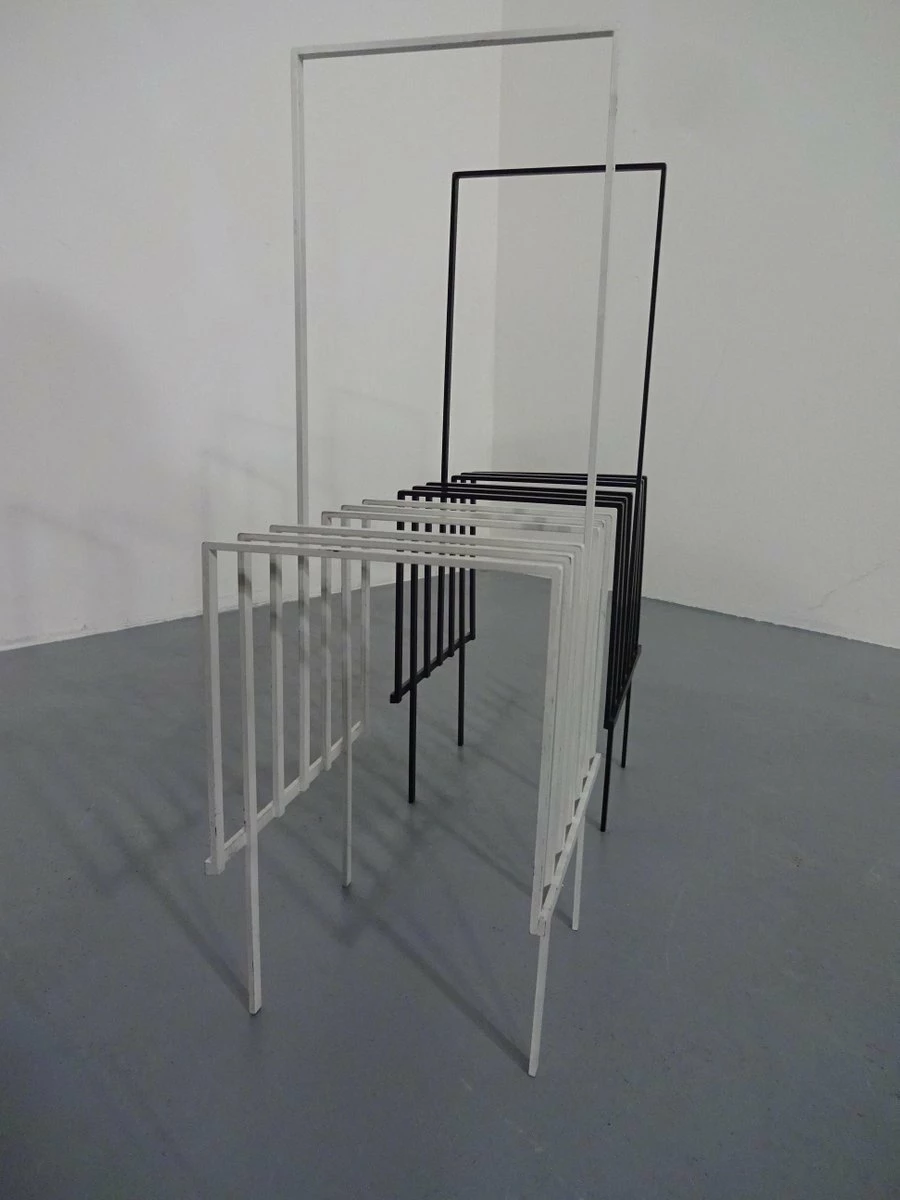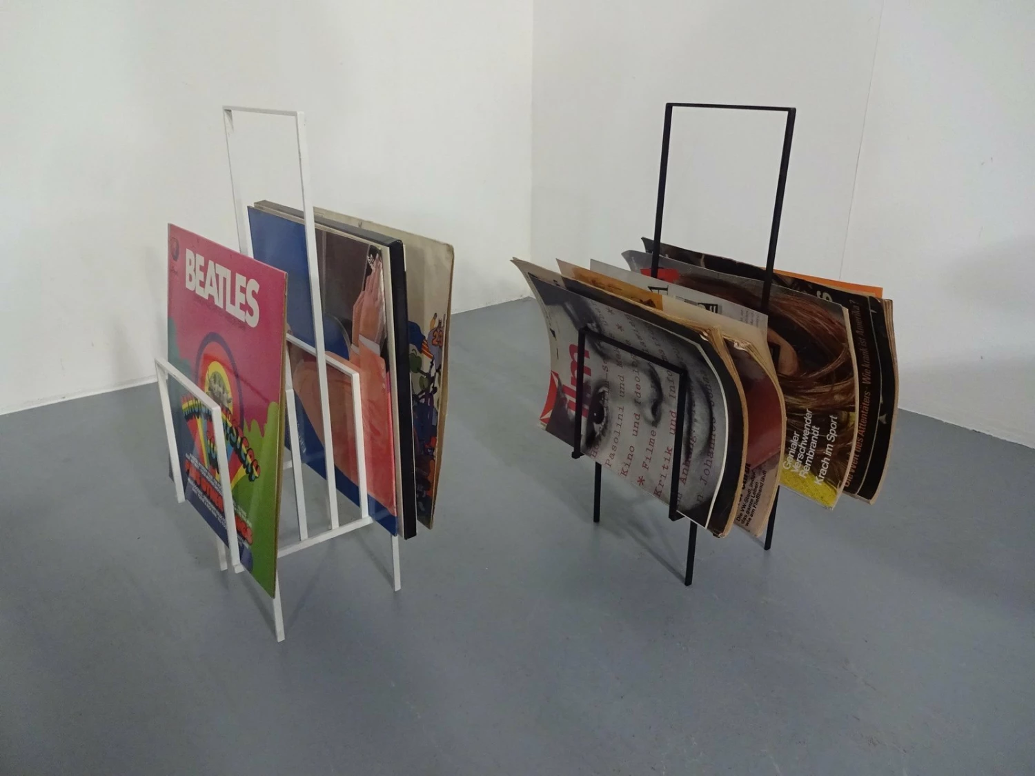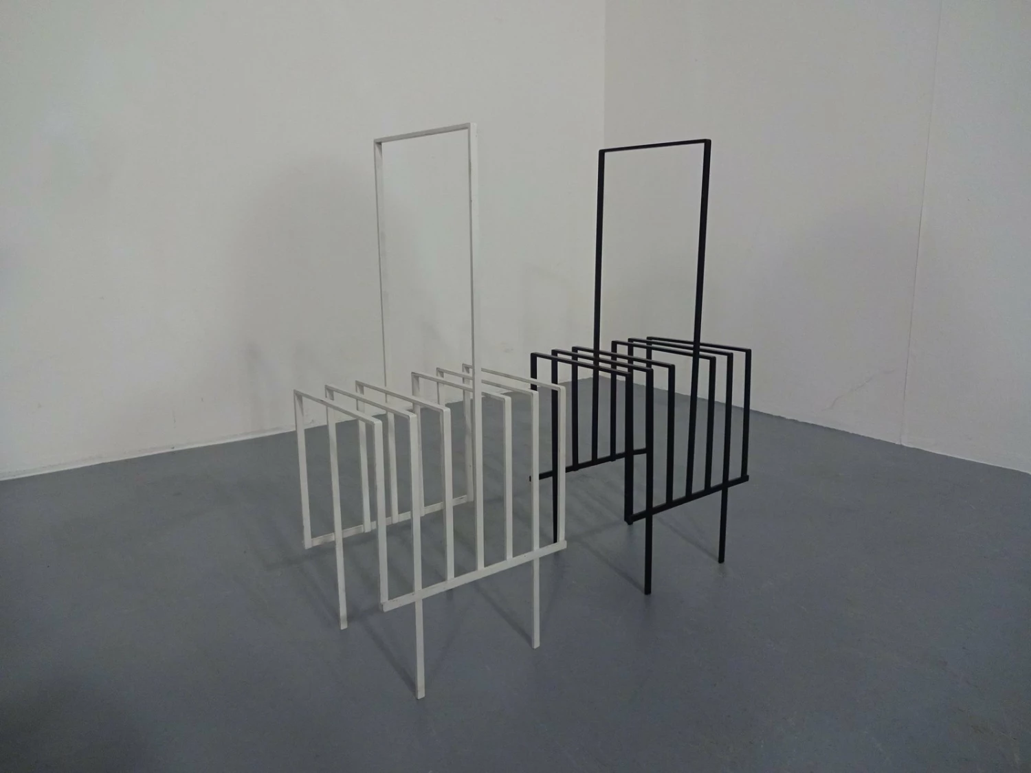 Purist newspaper stands or LP stands in lacquered steel. Available in black and white.