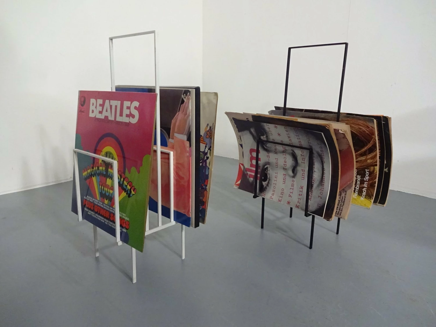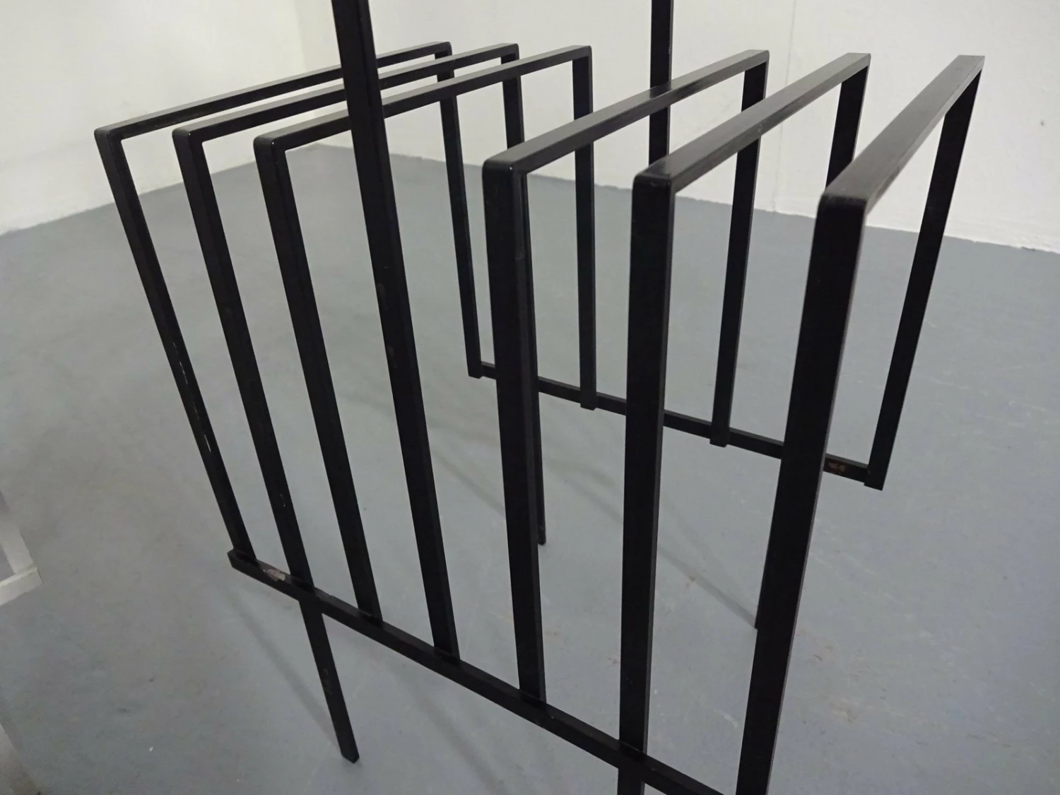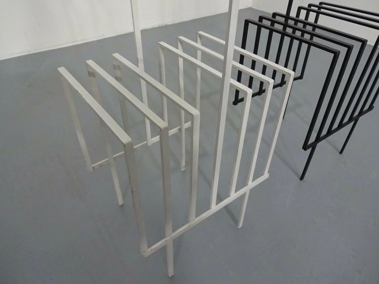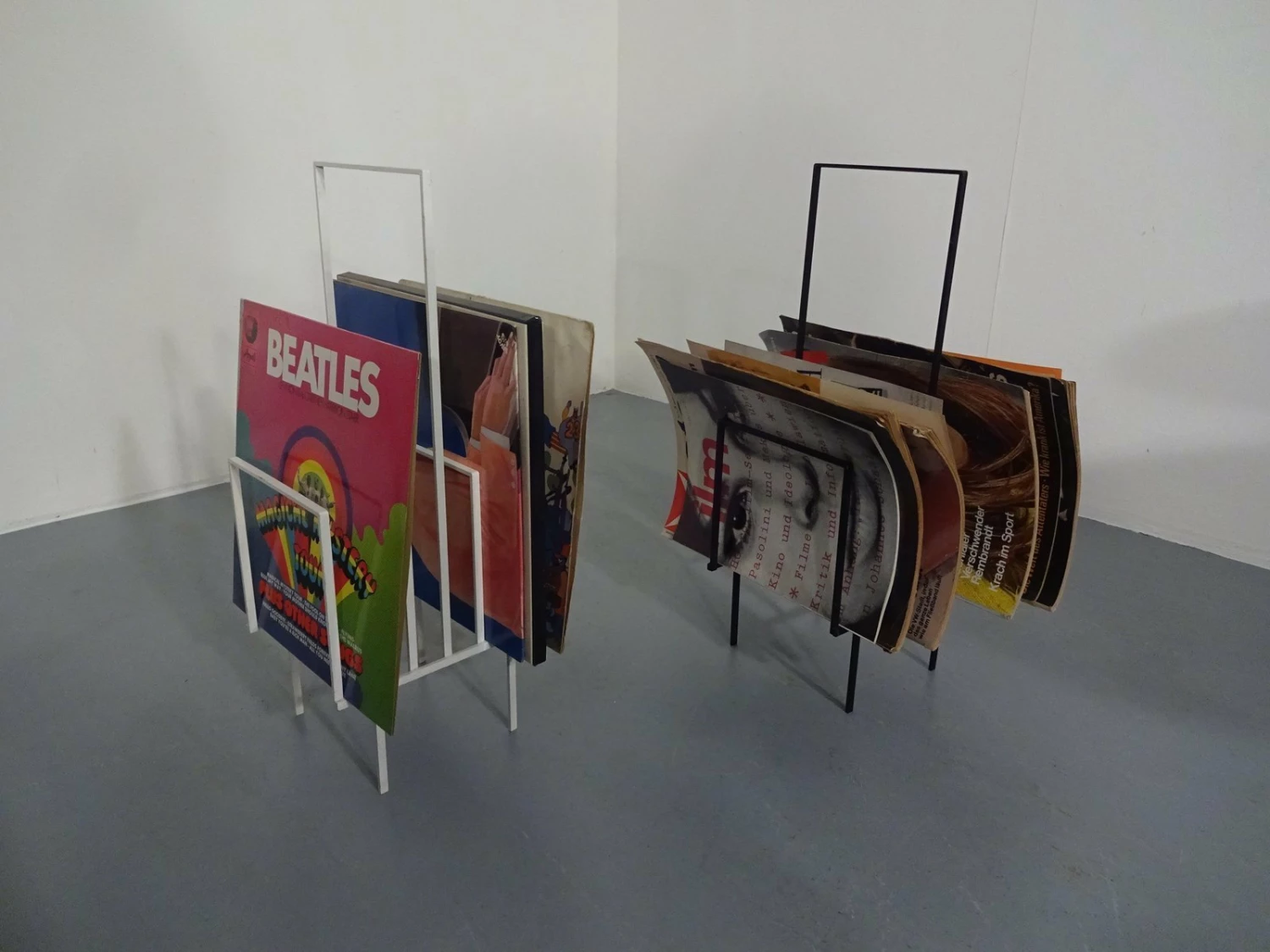 Purist newspaper stands or LP stands in lacquered steel. Available in black and white.
