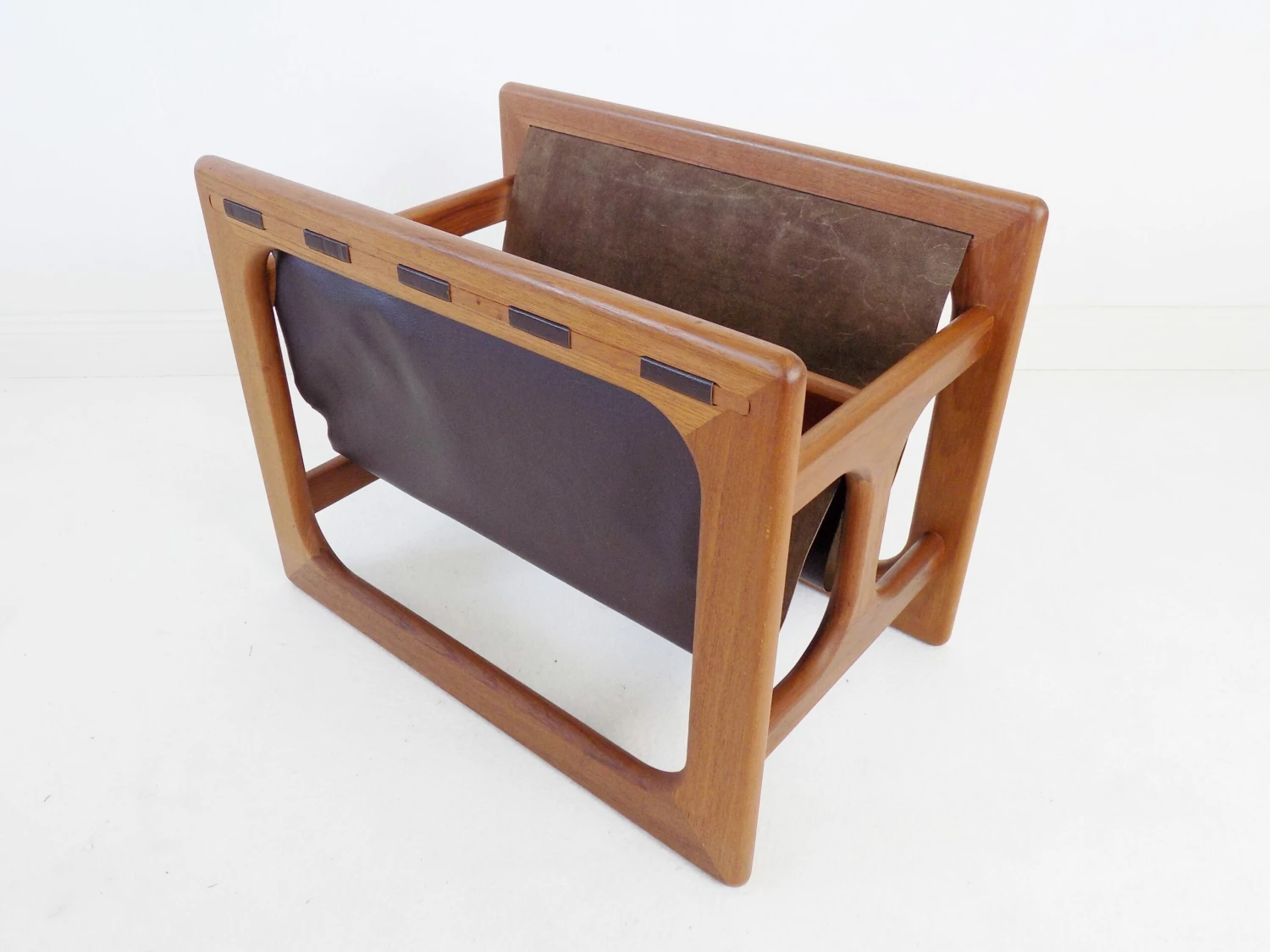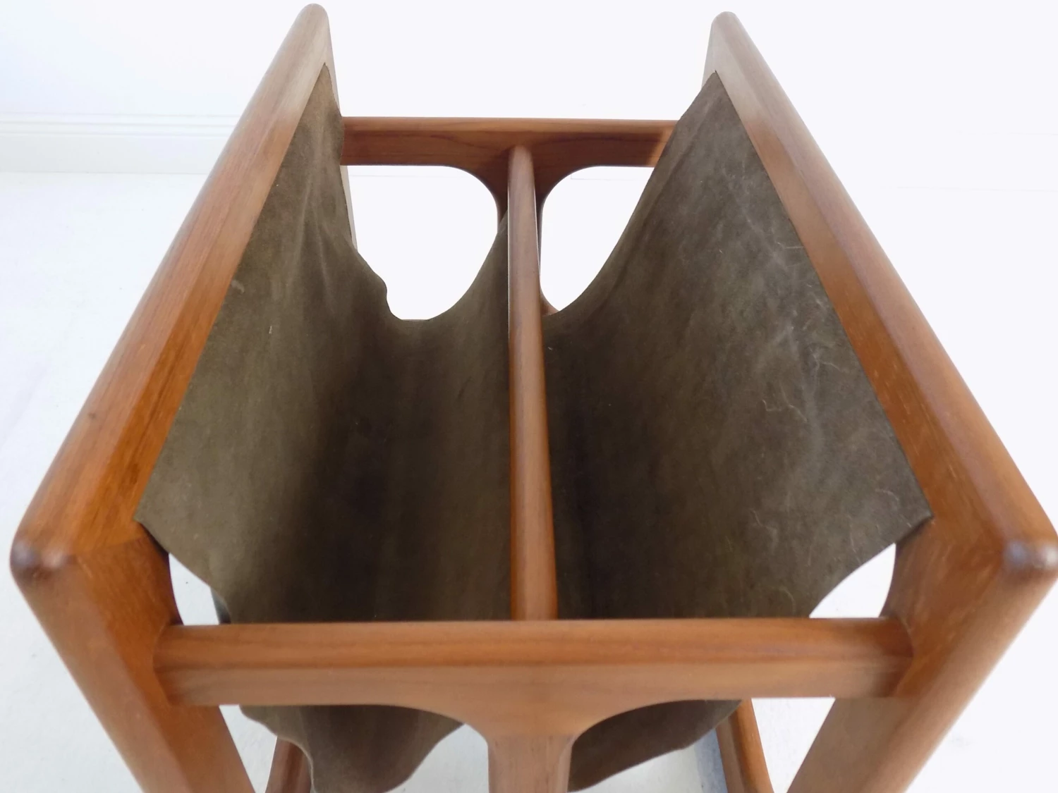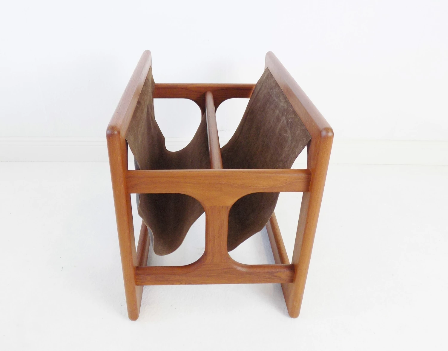 Very nice teak magazine rack in a warm wood tone with double storage compartments for magazines. The teak frame, as well as the brown leather inserts, are in excellent condition.