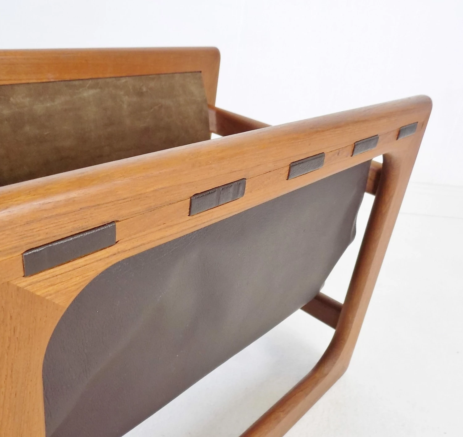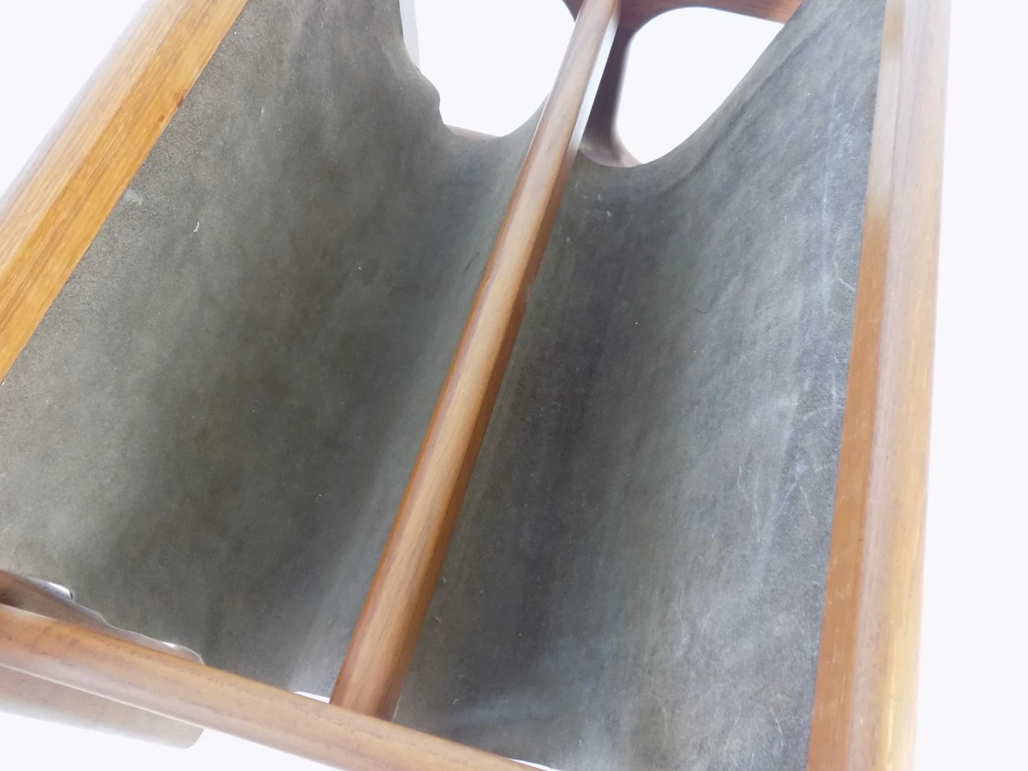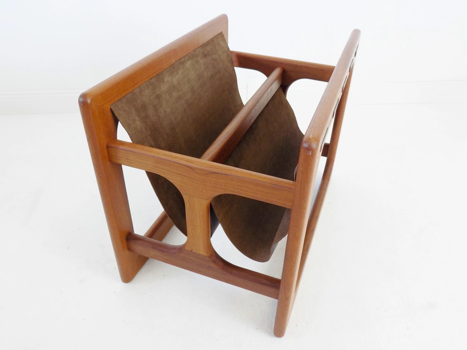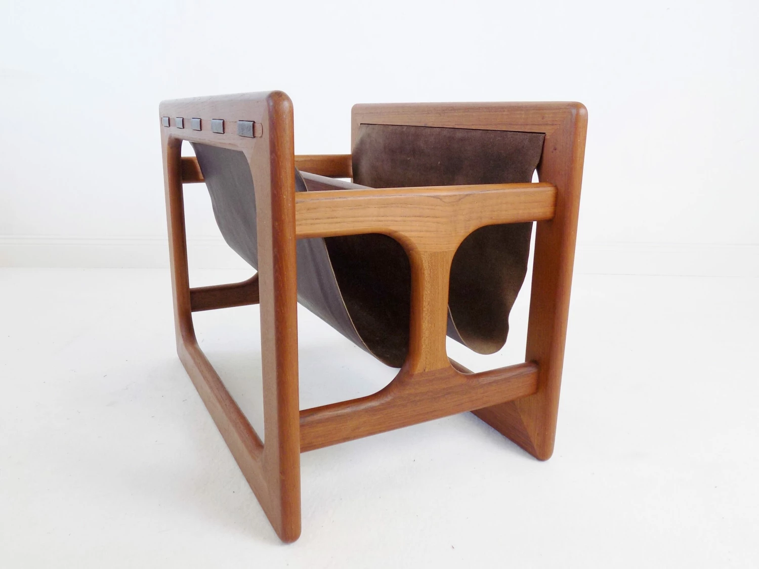 Very nice teak magazine rack in a warm wood tone with double storage compartments for magazines. The teak frame, as well as the brown leather inserts, are in excellent condition.
