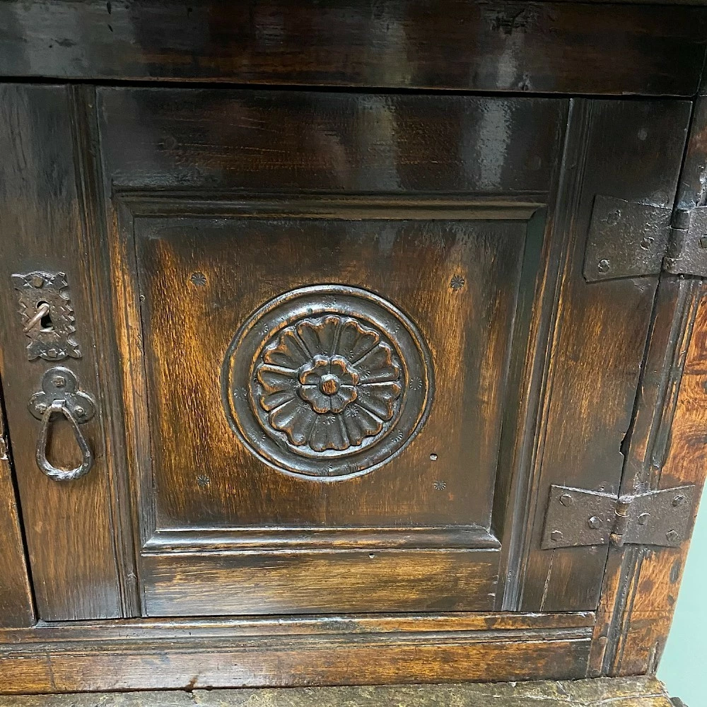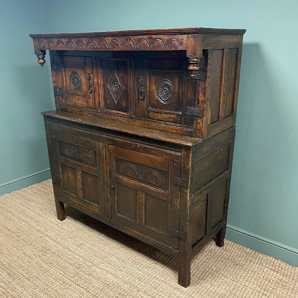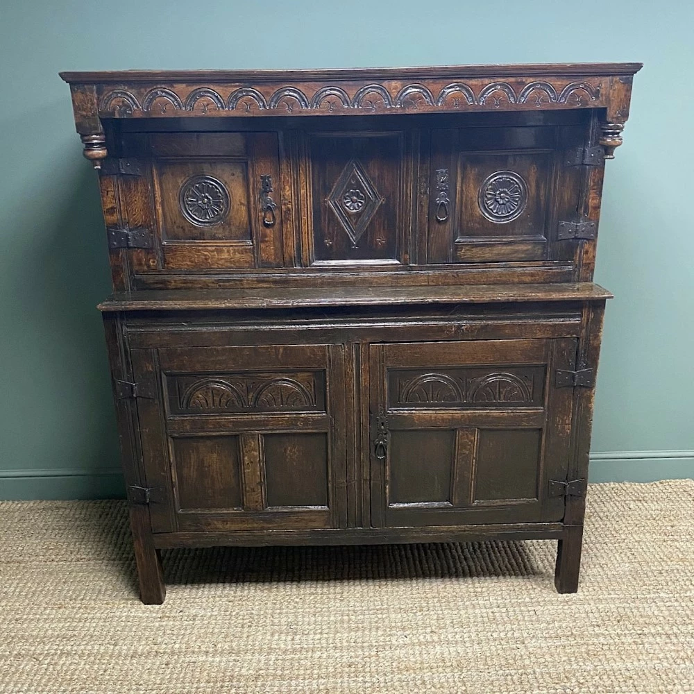 This beautiful English 17th Century Period Oak Antique Court Cupboard is of good smaller proportions and is a real stately home piece. It has a moulded cornice above a deep carved frieze with finials above three beautiful carved panels, two of which are doors with iron hinges, key escutcheons and handles. The lower section has a rectangular moulded top above two cupboard doors with moulded carved panels and again iron hinges. This period Oak cupboard stands on raised legs, has a good old repairs, charm and character consistent with age and use, has oak back and base boards, panelled sides and is of a pegged construction. It splits into two sections for ease of removal and the Oak has aged to a rich dark oak colour with a striking grain, good patina.