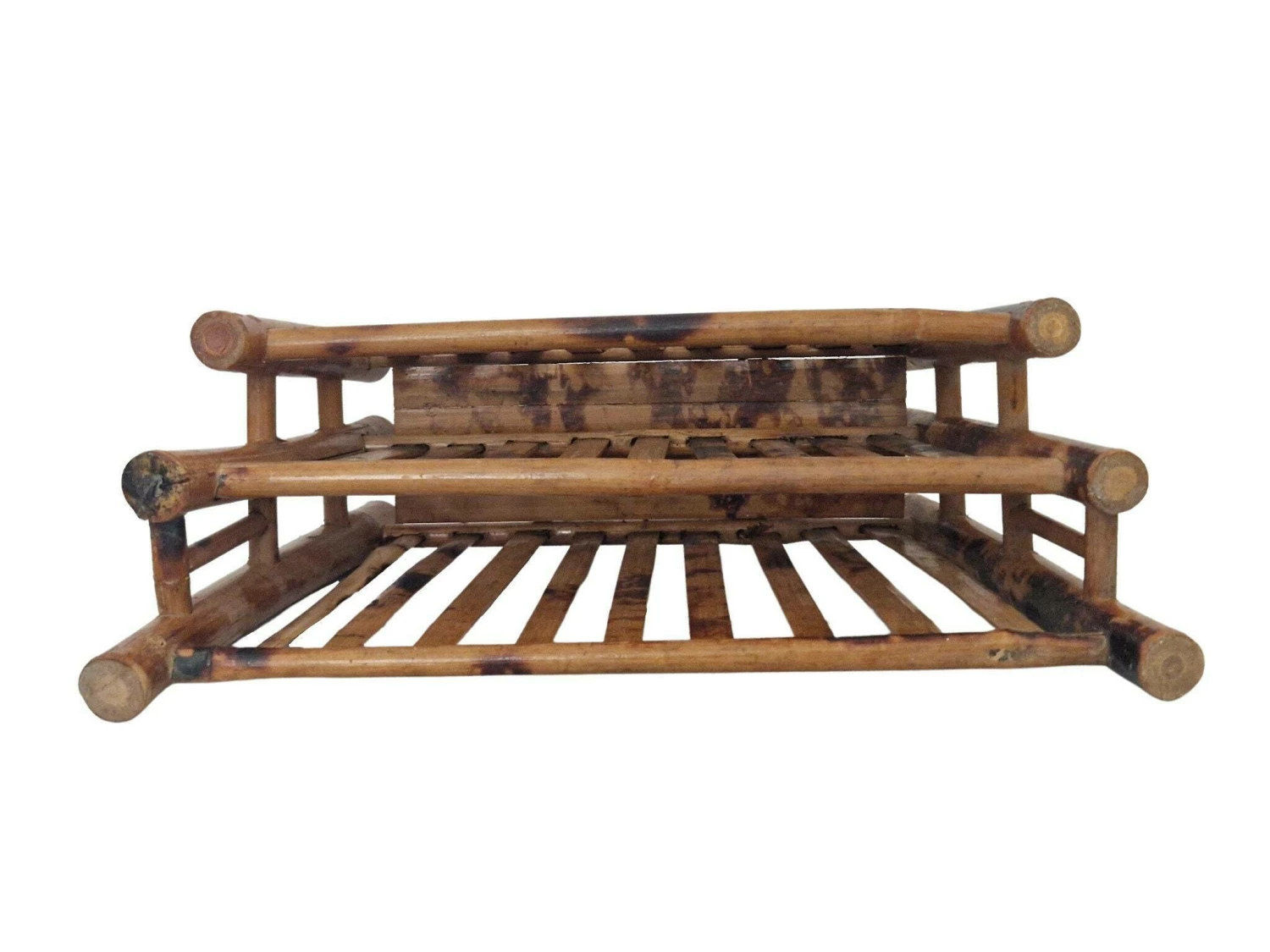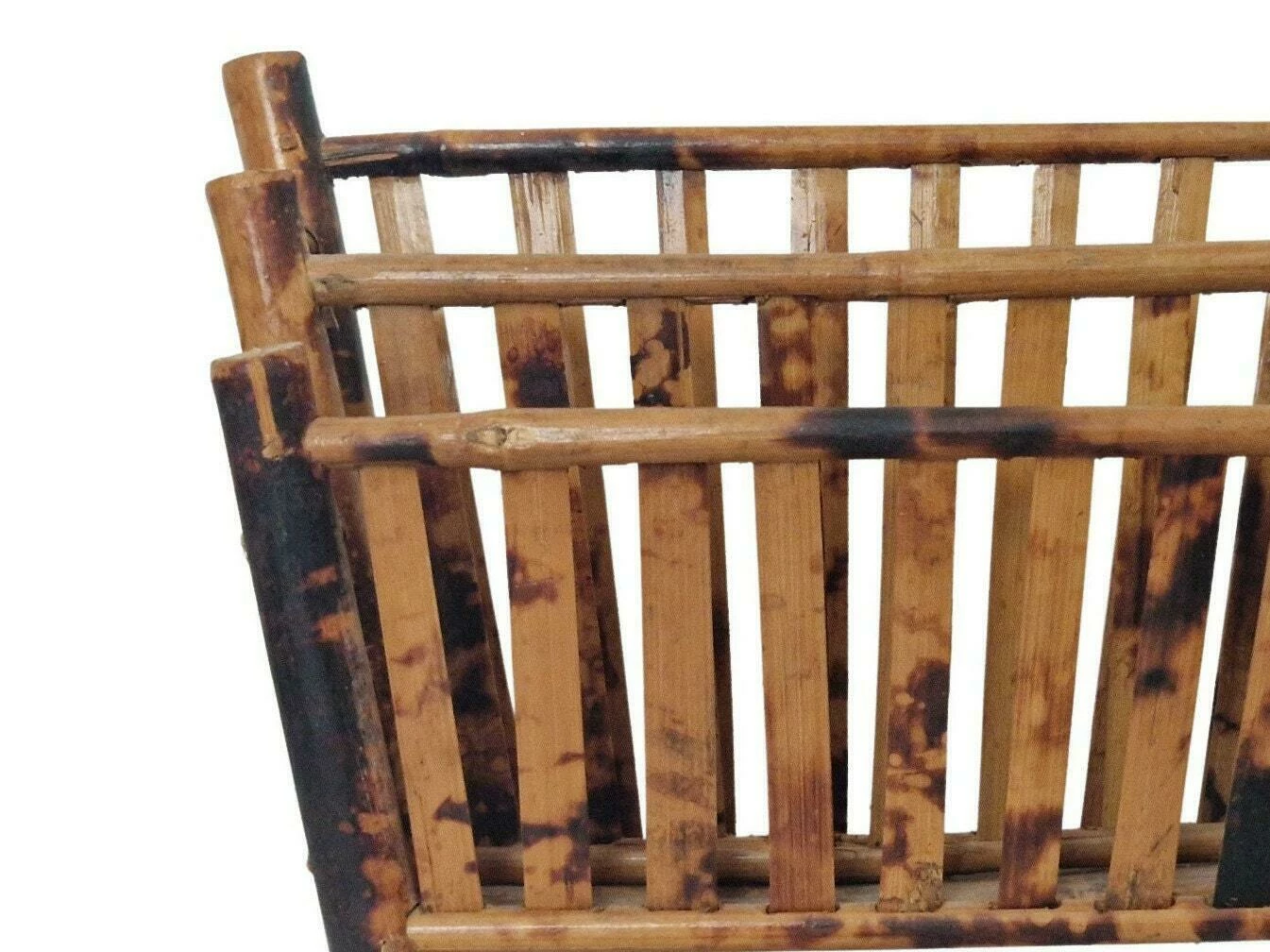 An elegant vintage bamboo letter holder rack dating from the 1970s. It has been hand crafted from varnished bamboo strips and shoots with a stylish geometric form. It has been divided into two sections with vertical panels between each section. The letter rack rests on 4 raised legs and has a mottled surface pattern in places.