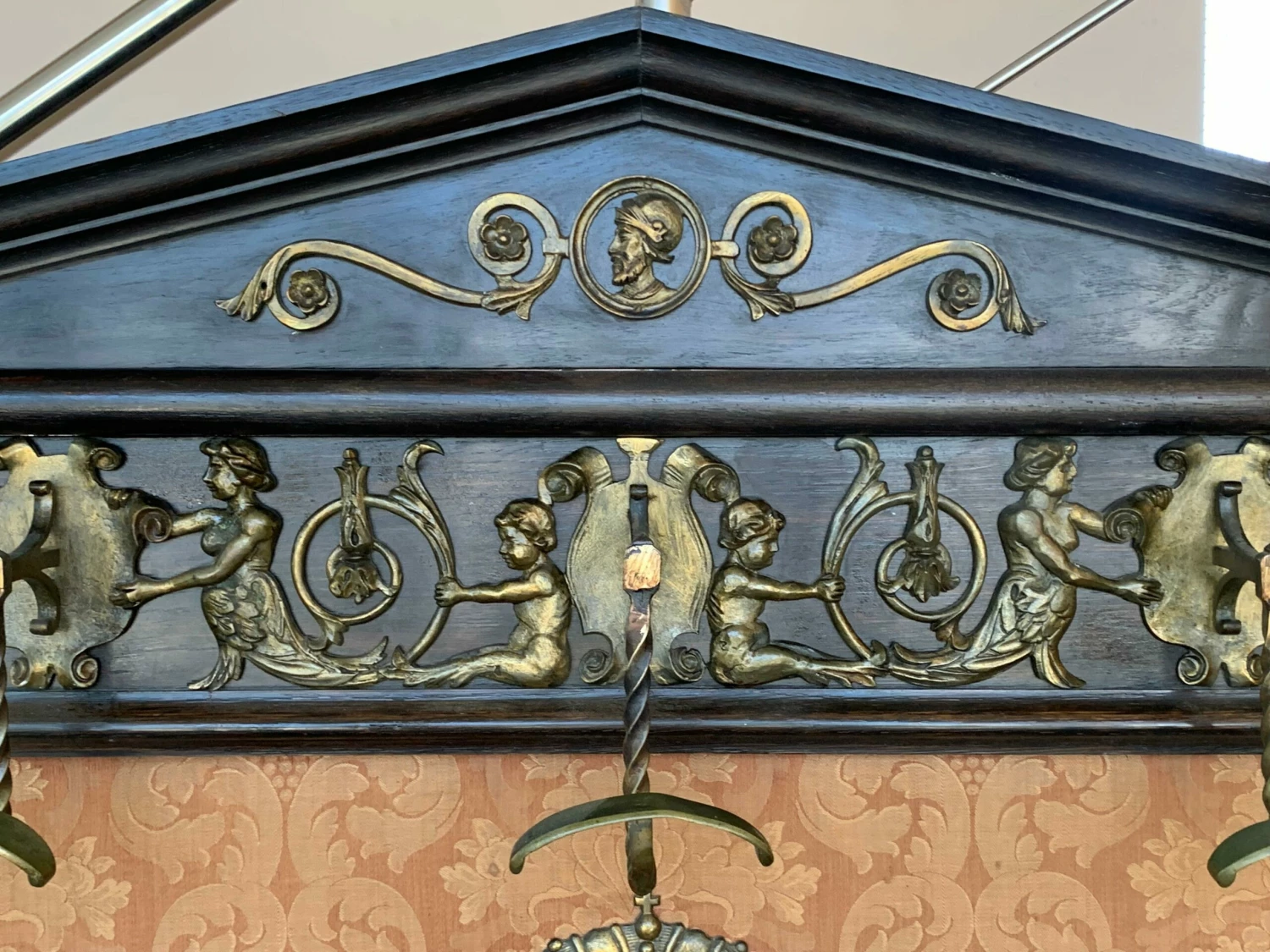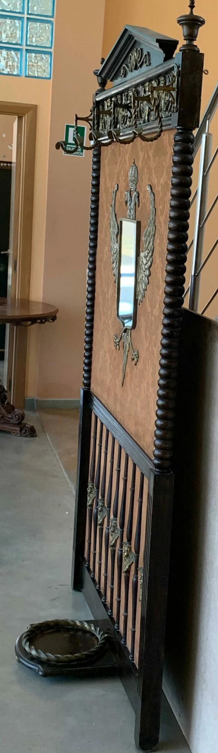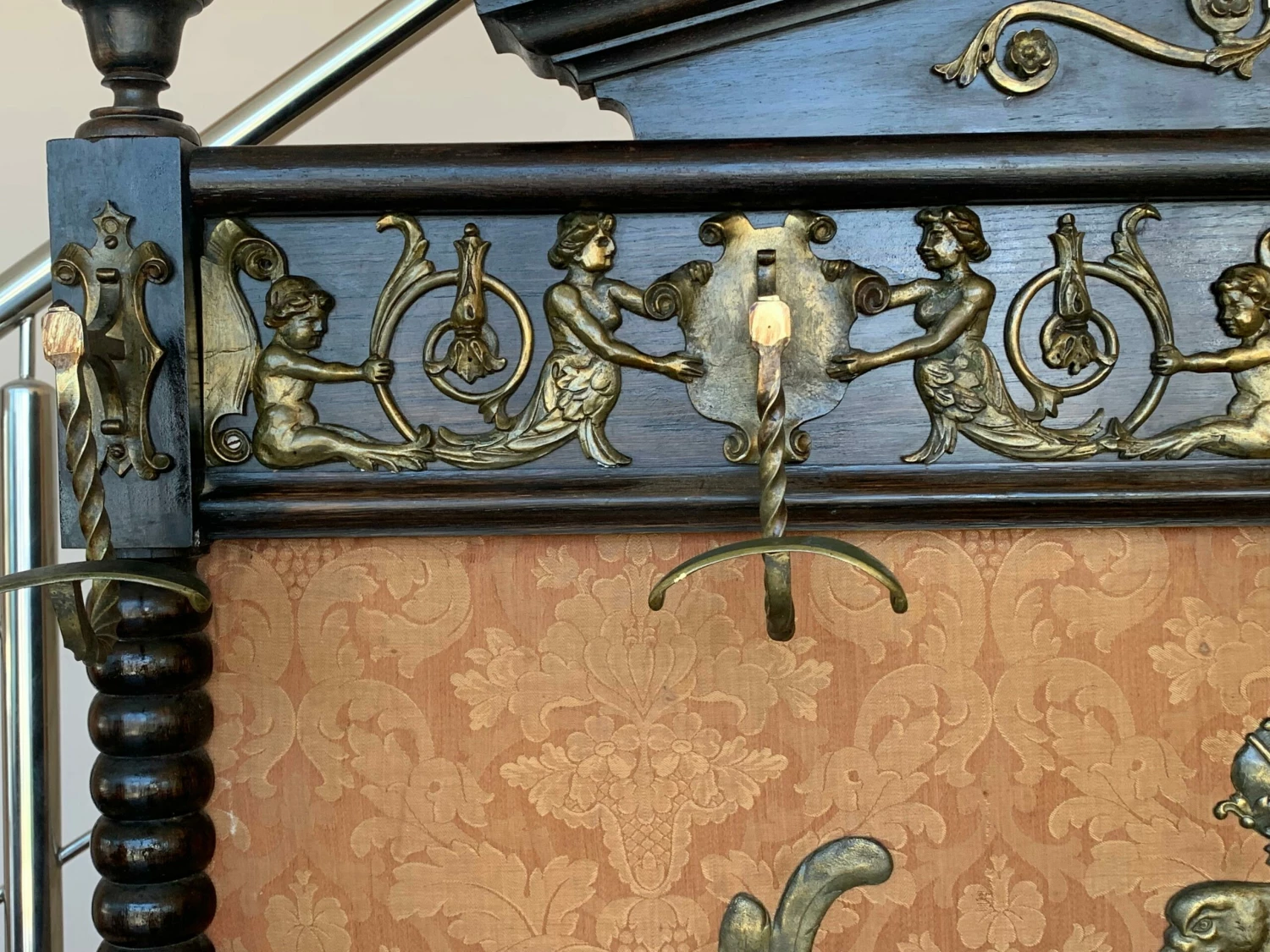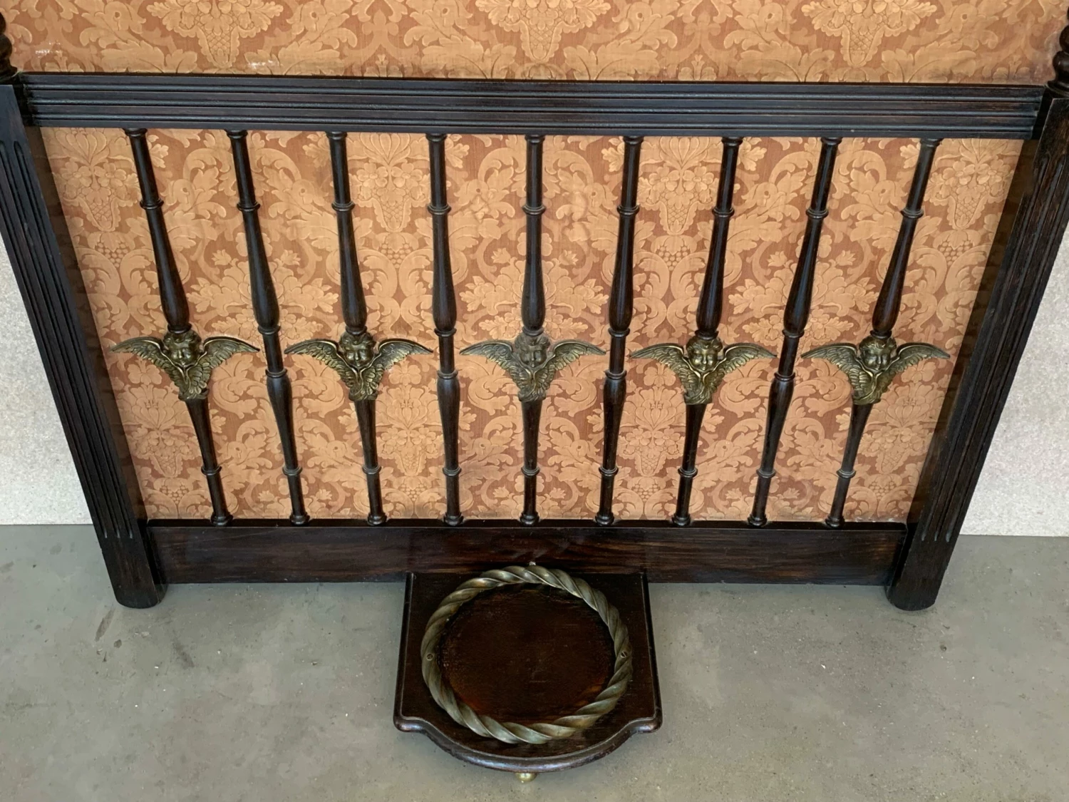 Large carved Spanish solid walnut coat rack stand has all of the original hardware which is heavy cast iron and has been polished and lacquered for easy maintenance. The top half is profusely carved with intricate urns, arabesques, and baskets of grapes and pomegranates, with bronze details. The top has a deep cornice carved with acanthus leaves and five hangs. The side support columns have ionic capitals on top of fluted columns. The apron has deep gadrooned carvings. The front supports are fluted columns and the base has carved bullnose molding atop a straight plinth base that rests on bun feet.